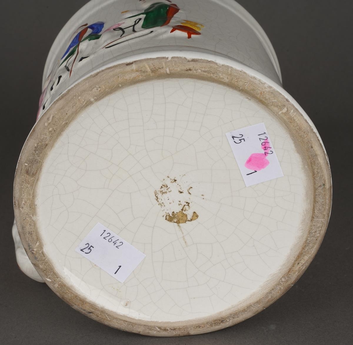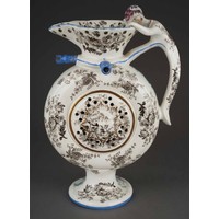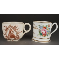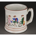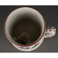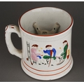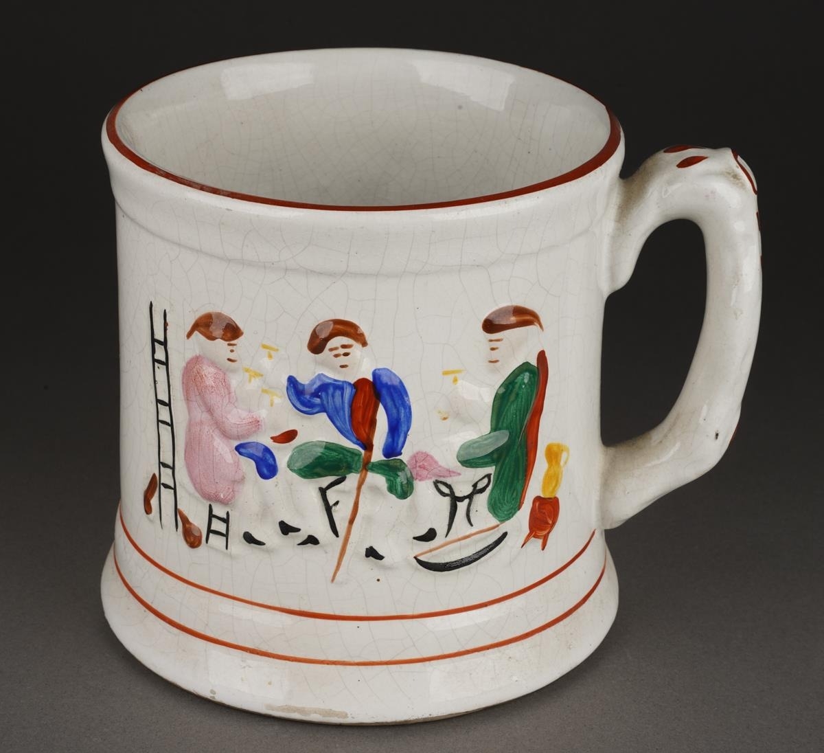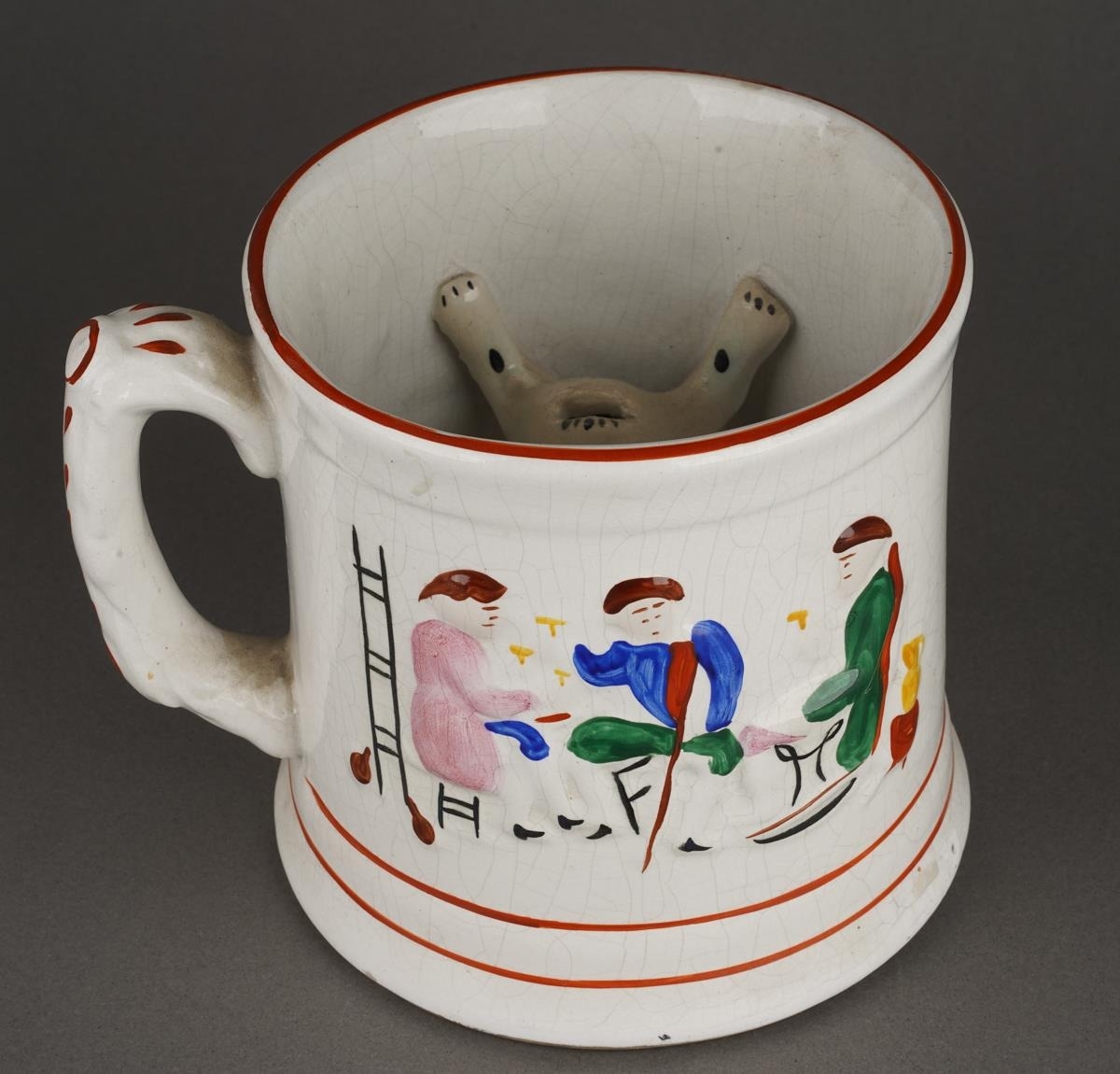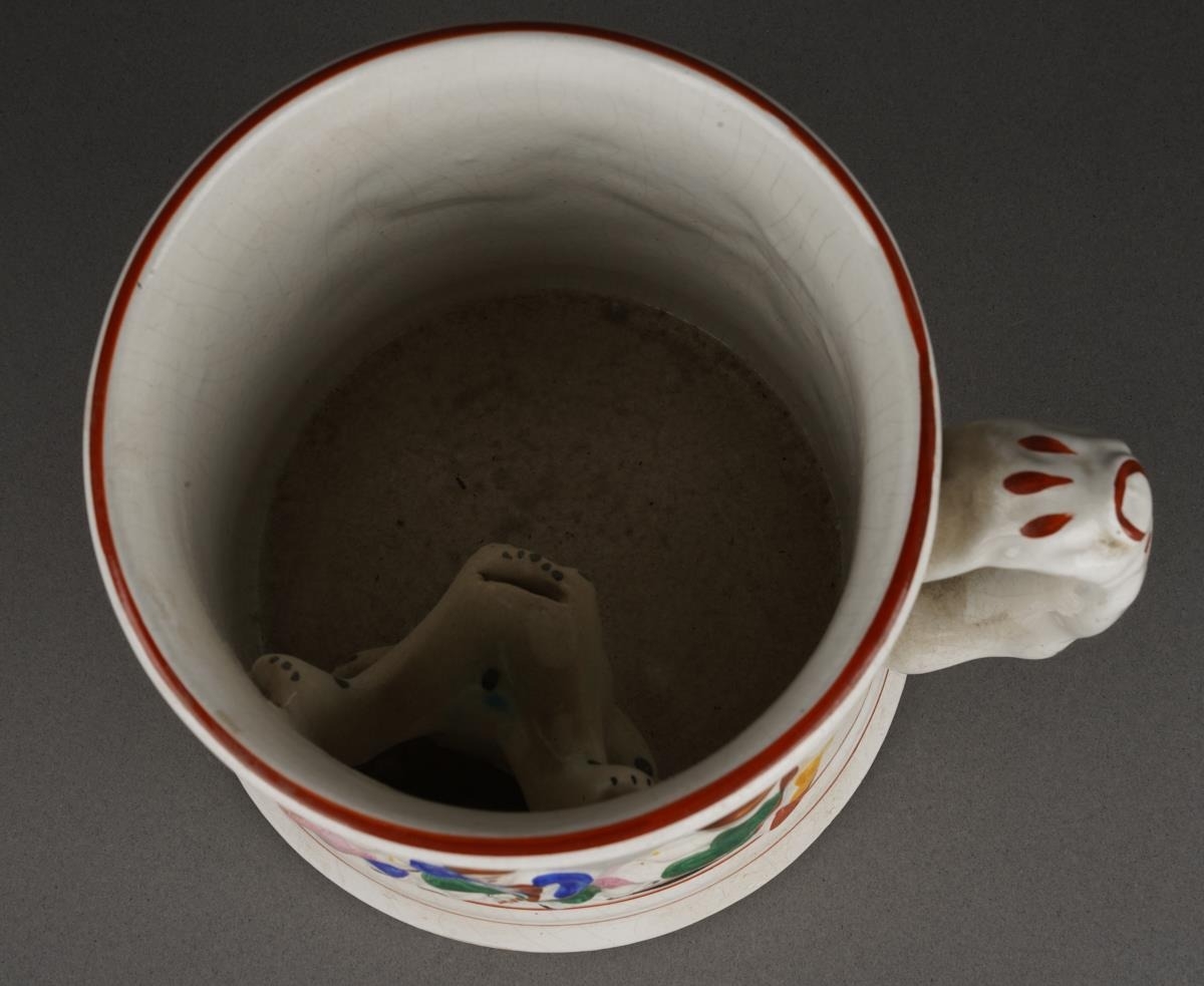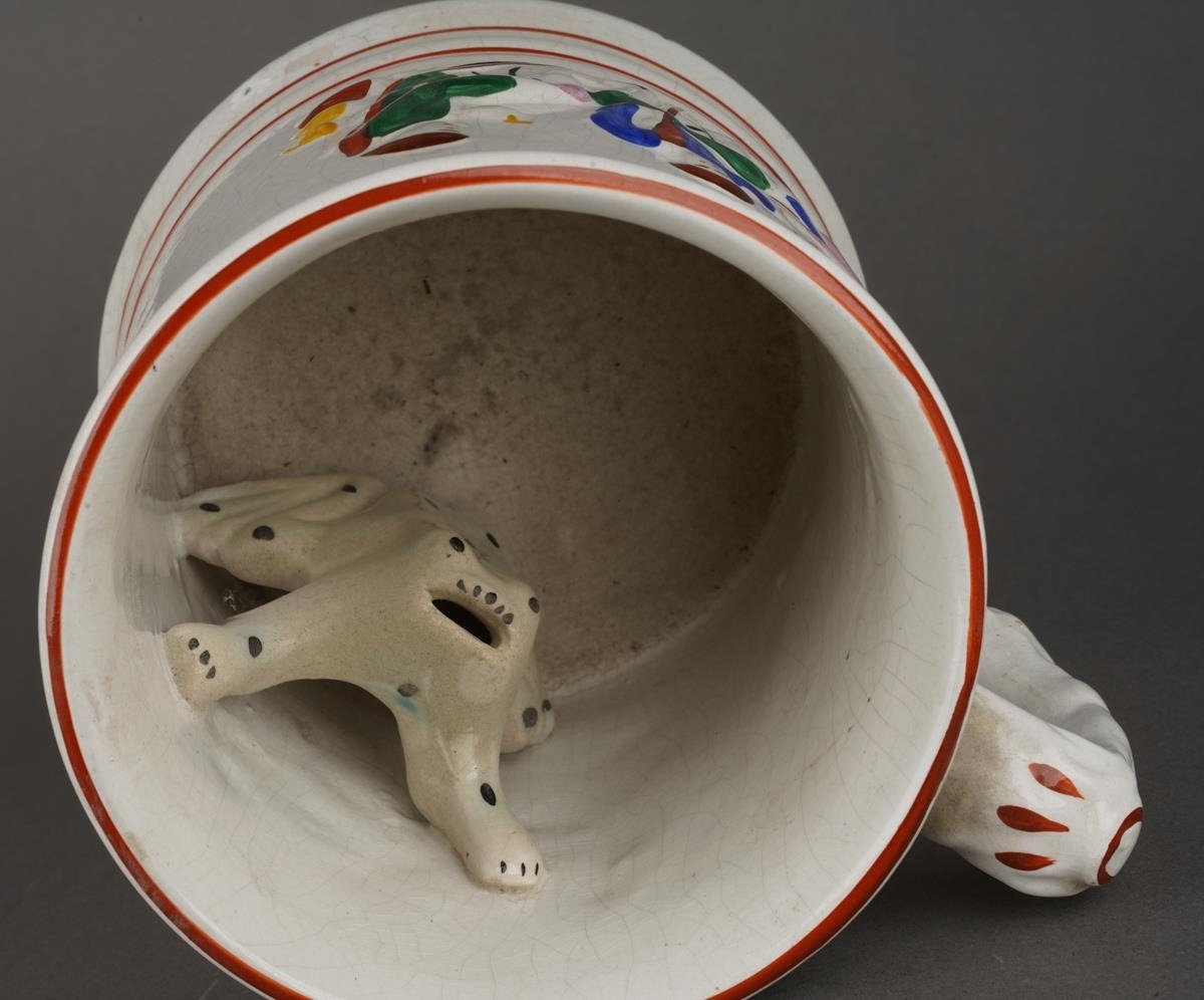A 19th Century Staffordshire Pearlware Frog / Surprise Mug with a spotted frog to interior and hand painted seated drinkers beside a ladder in relief to the exterior, approx 12.5cm high