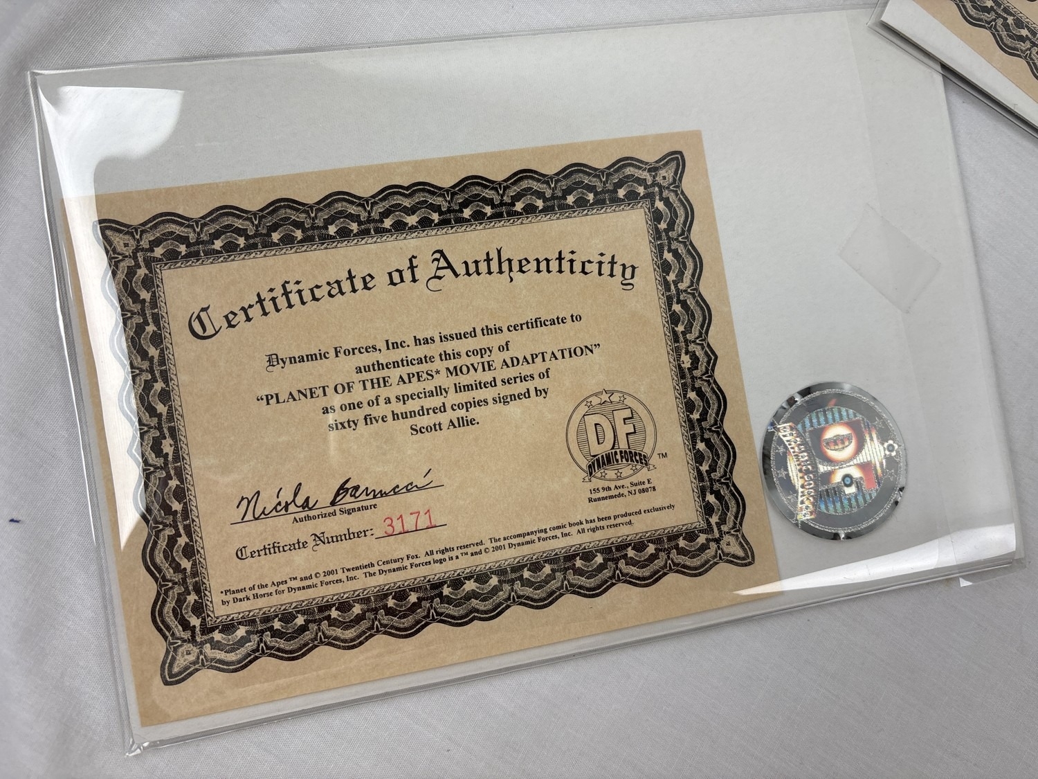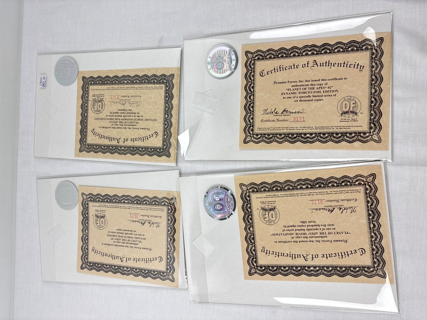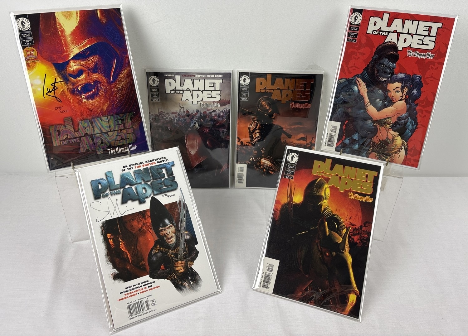Planet Of The Apes The Human War 3 comic set, with variants, from Dark Horse Comics, together with a Tim Burton Movie Special. Comprising: #1DF-B Dynamic Forces Rainbow Foil Ltd edition copy, signed by Ian Edginton (comes with CoA); #1B, #2DF Dynamic Forces copper foil issue (with CoA), #3, #3DF Dynamic Forces gold foil issue (with CoA) and Planet of the Apes - The official adaptation of the Tim Burton movie, Ltd edition, signed by Scott Allie and numbered (comes with CoA). All bagged & carded.
