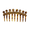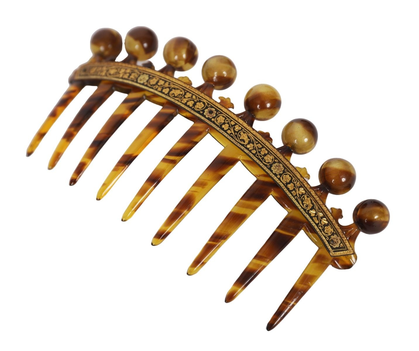 A 19th-century tortoiseshell hair comb, the crest applied with engraved gilt metal foliate decoration and spherical finials.