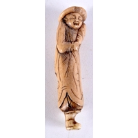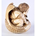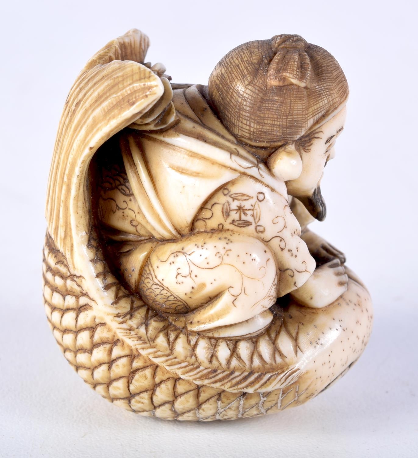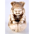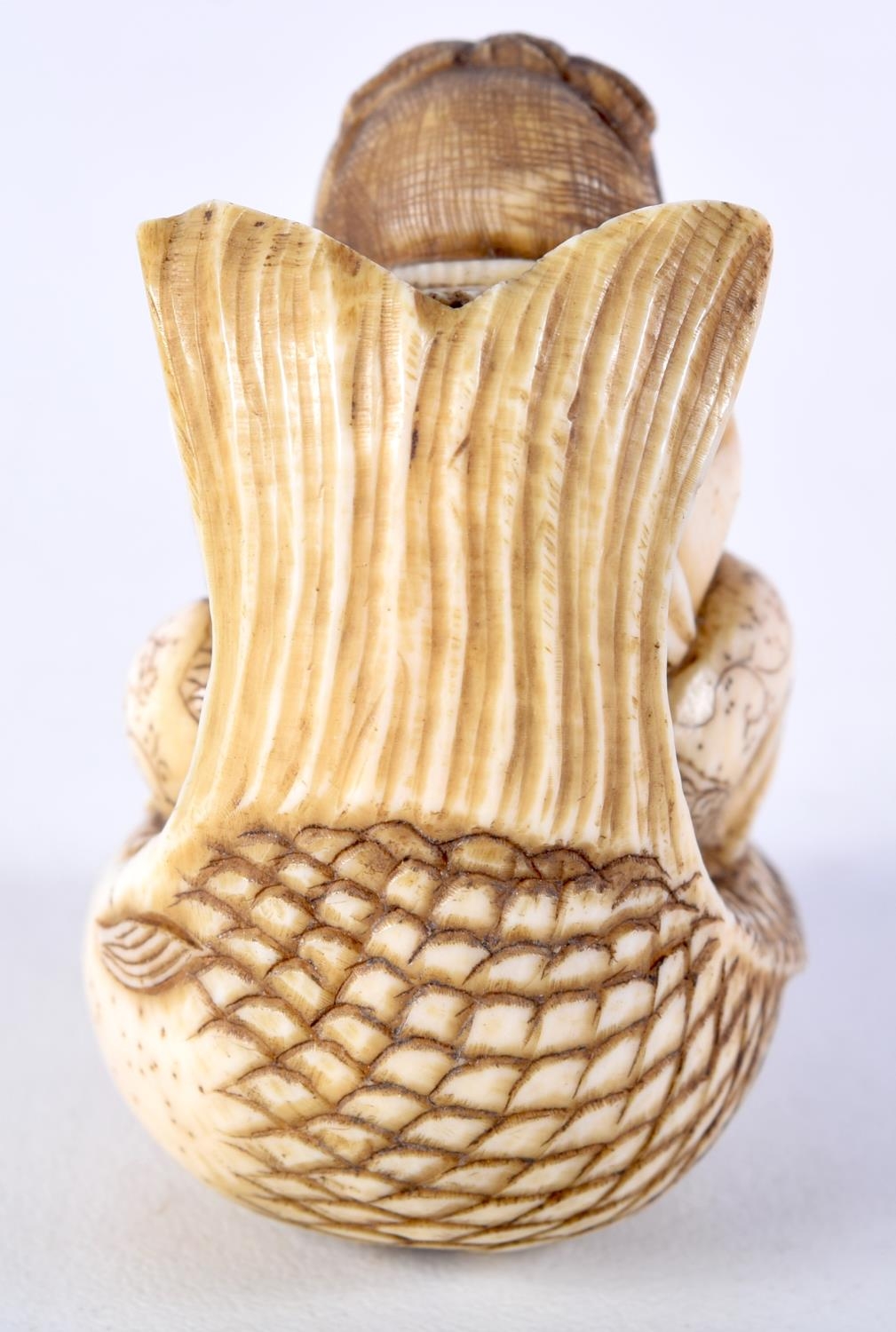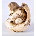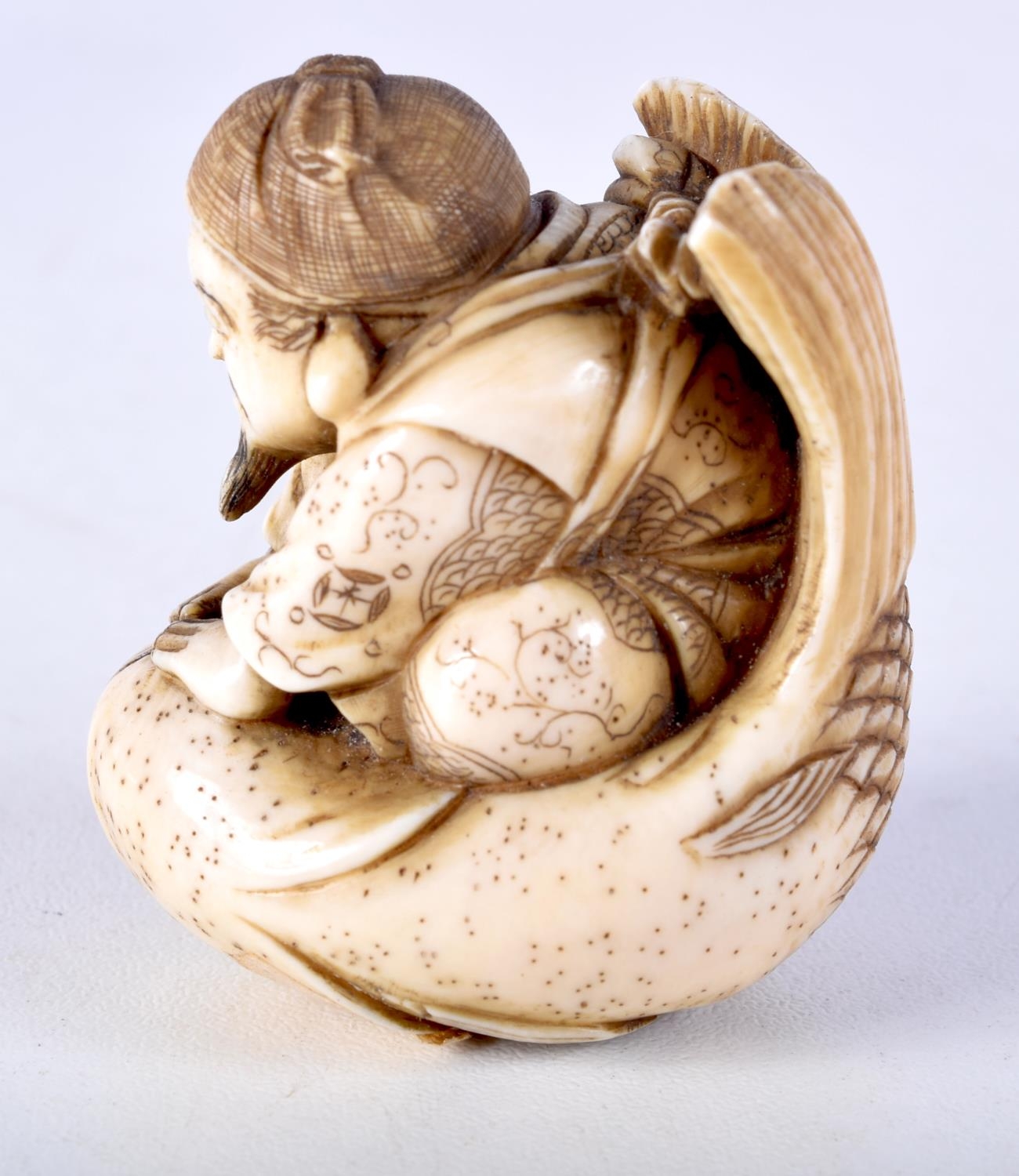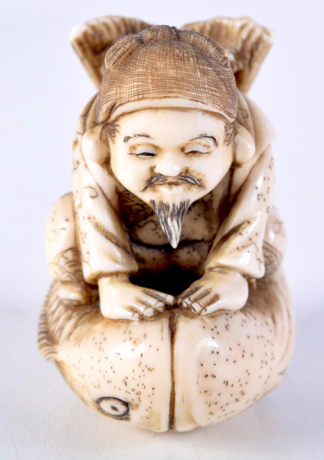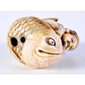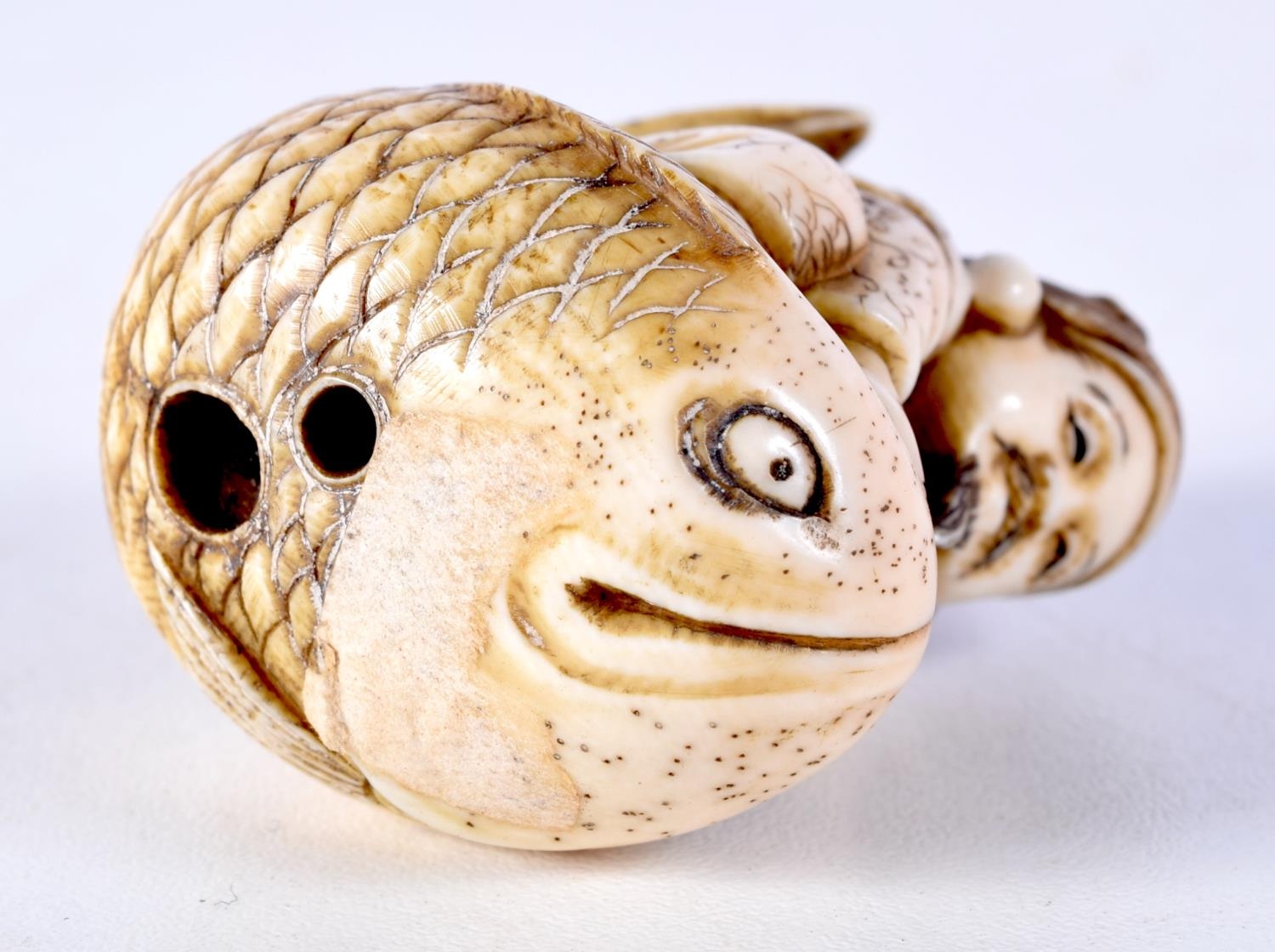 A FINE 19TH CENTURY JAPANESE MEIJI PERIOD CARVED IVORY NETSUKE modelled as a male riding a fish. 5 cm x 3.5 cm.