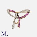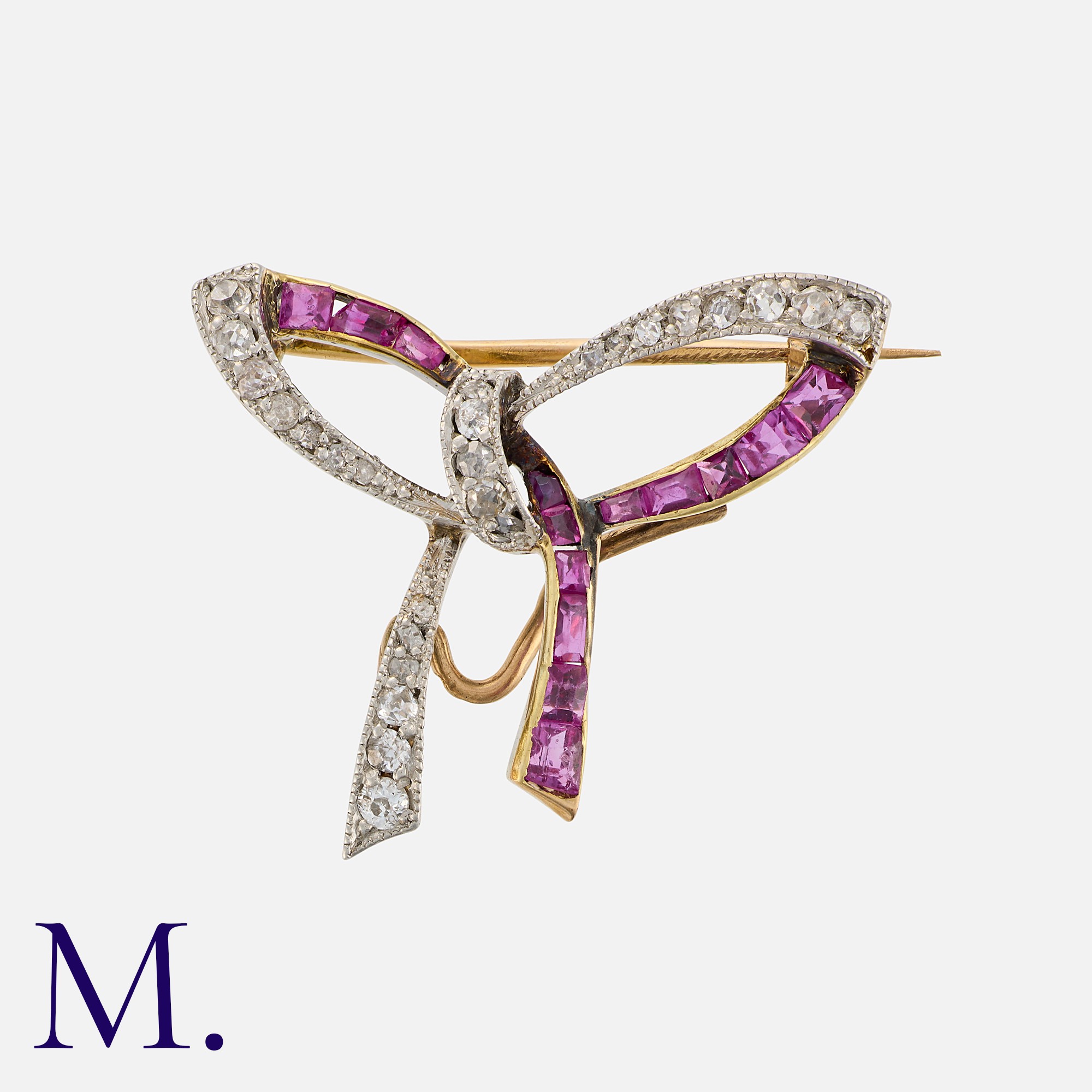 A Ruby and Diamond Bow Brooch in yellow gold and platinum, designed as a bow set with calibré cut rubies and single cut diamonds. Unmarked, tests indicate 14 carat gold.
