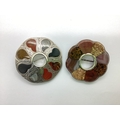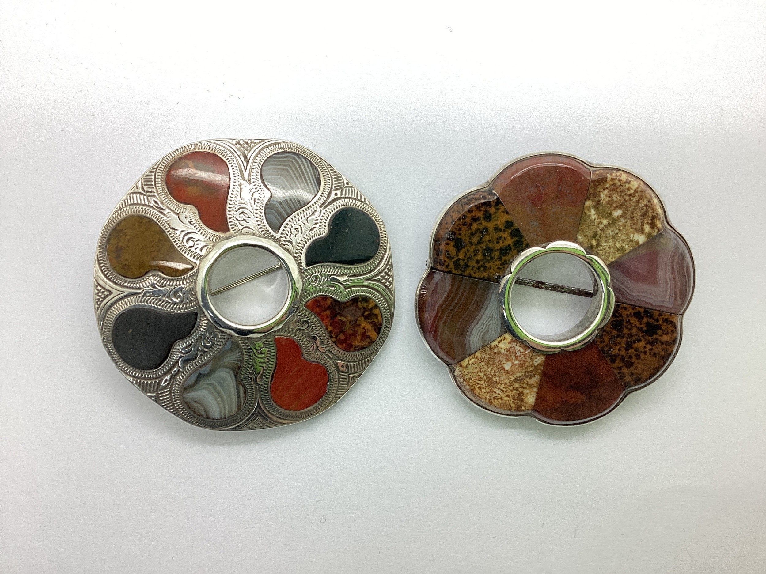 A Victorian Scottish Agate and Hardstone Panel Brooch, of openwork scalloped form with various inset hardstone panels, (backed), together with another of a similar style, the inset hardstone panels of shaped form, between highly decorative textured setting of openwork circular form, suspension loop verso. (2)