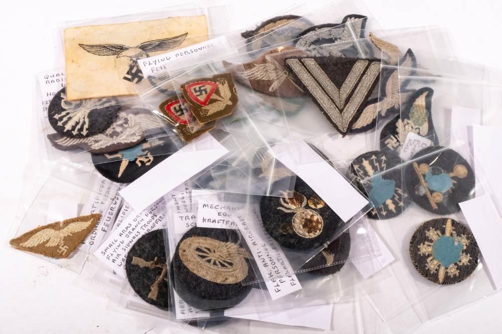 A collection of various German military cloth badges including: aircraft equipment administration branch, search light equipment administration branch and others