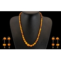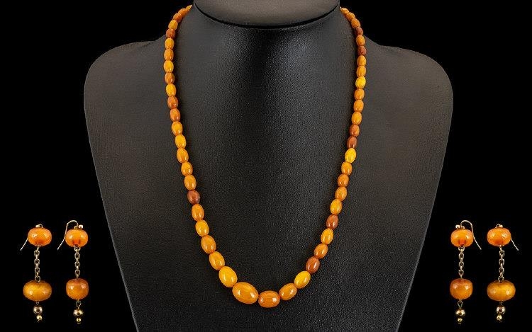 A Superb Quality Early 20th Century Butterscotch Natural Amber Beaded Graduated Necklace. With Matching Pair of Amber Earrings. Excellent Condition and Quality. 21.1 grams. Please Confirm with Photo.