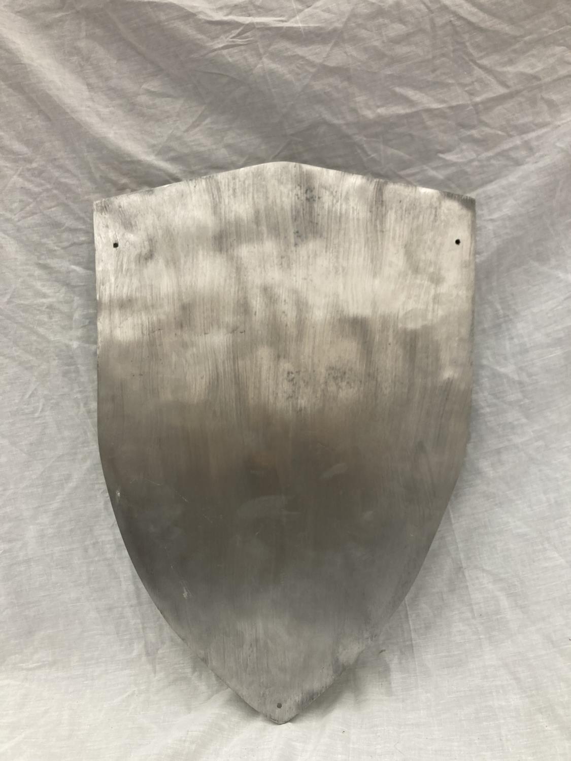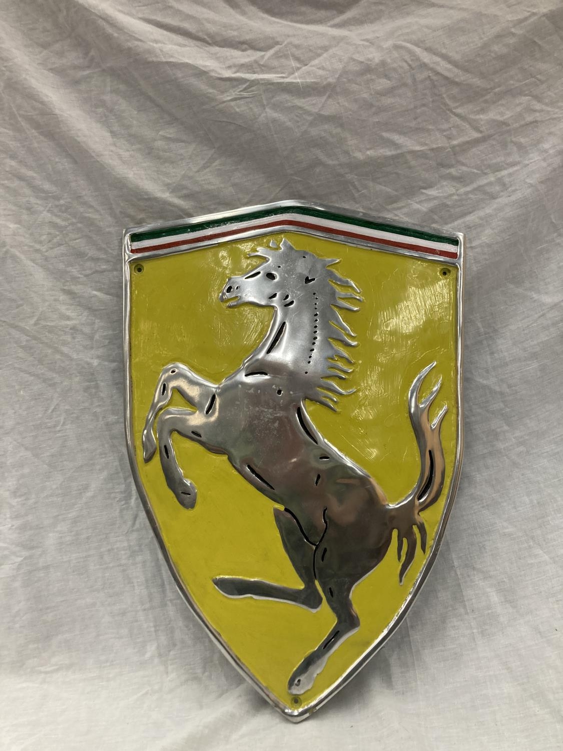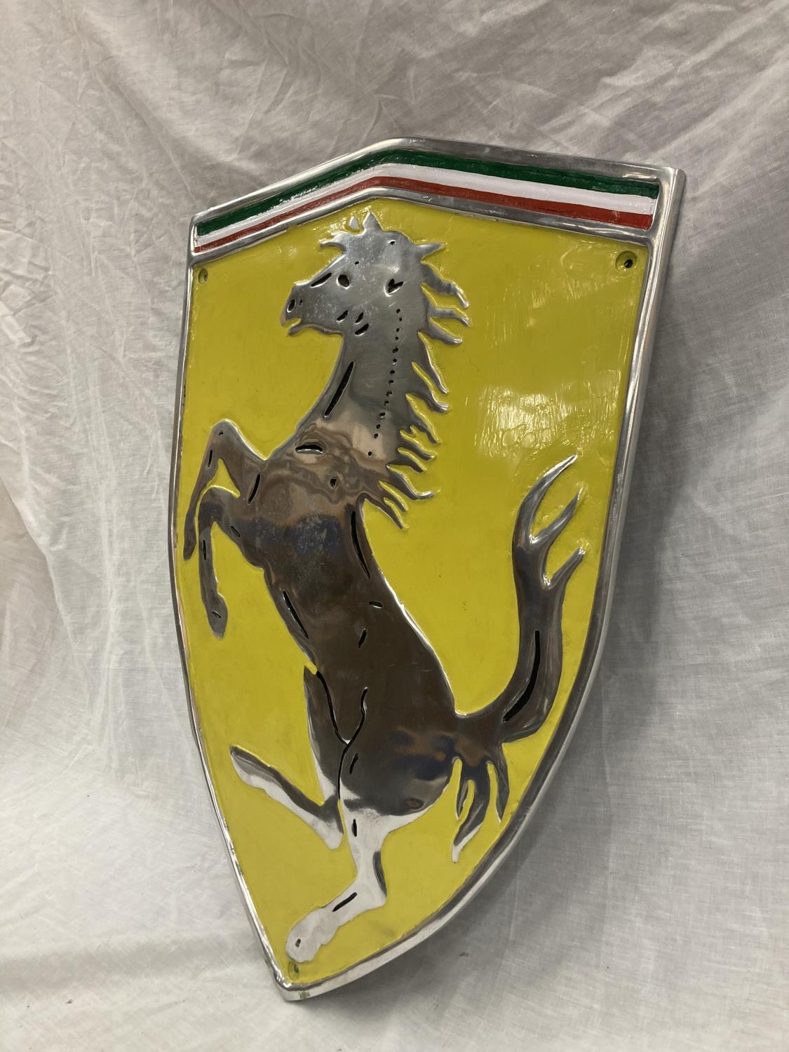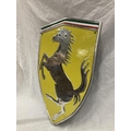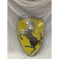 A LARGE CHROME FERRARI SHIELD SHAPED SIGN 60CM X 41CM