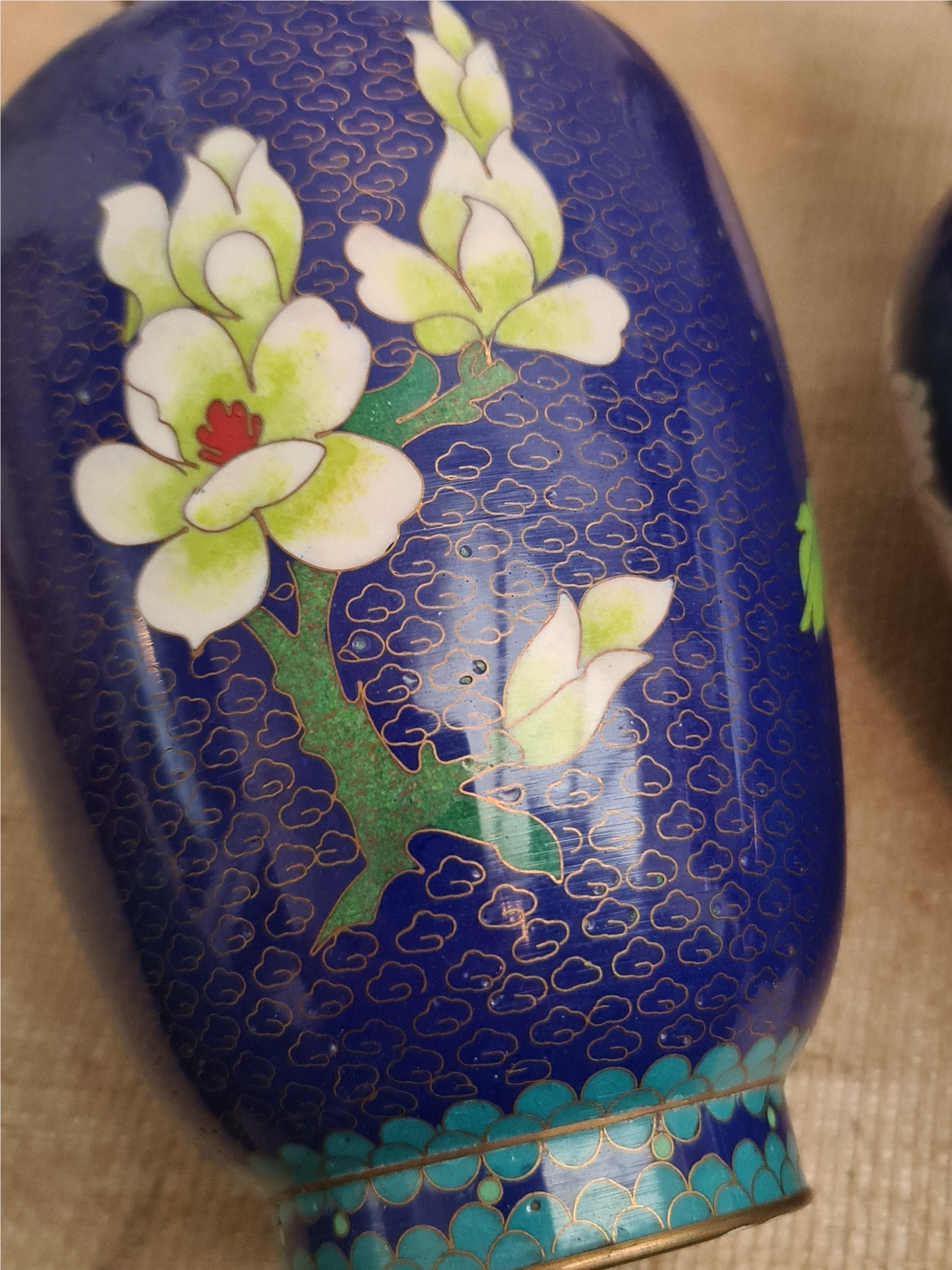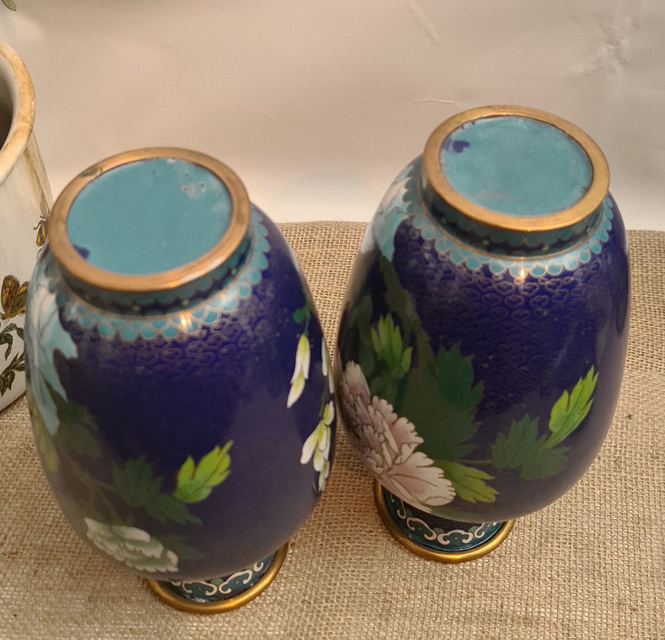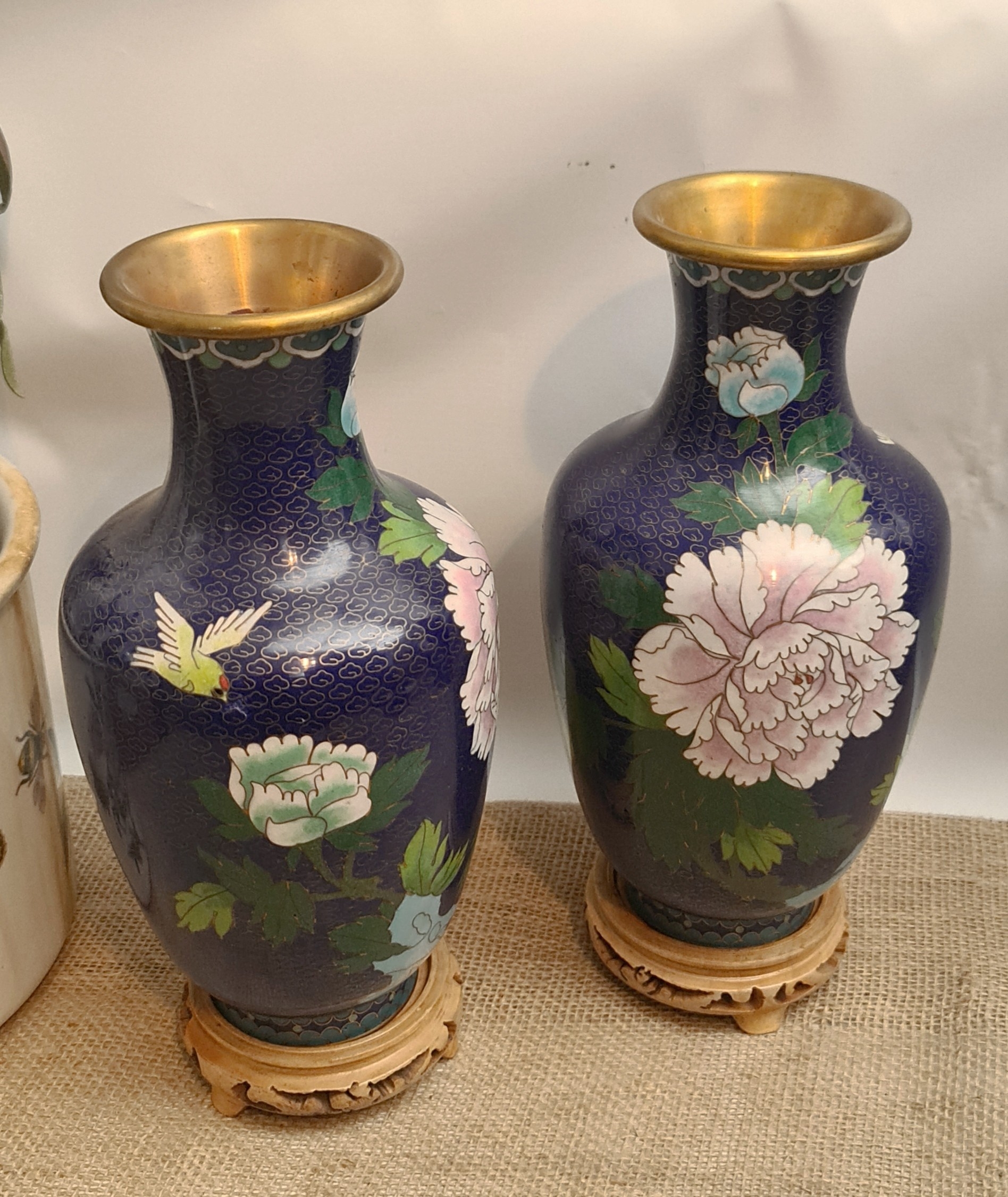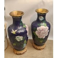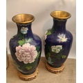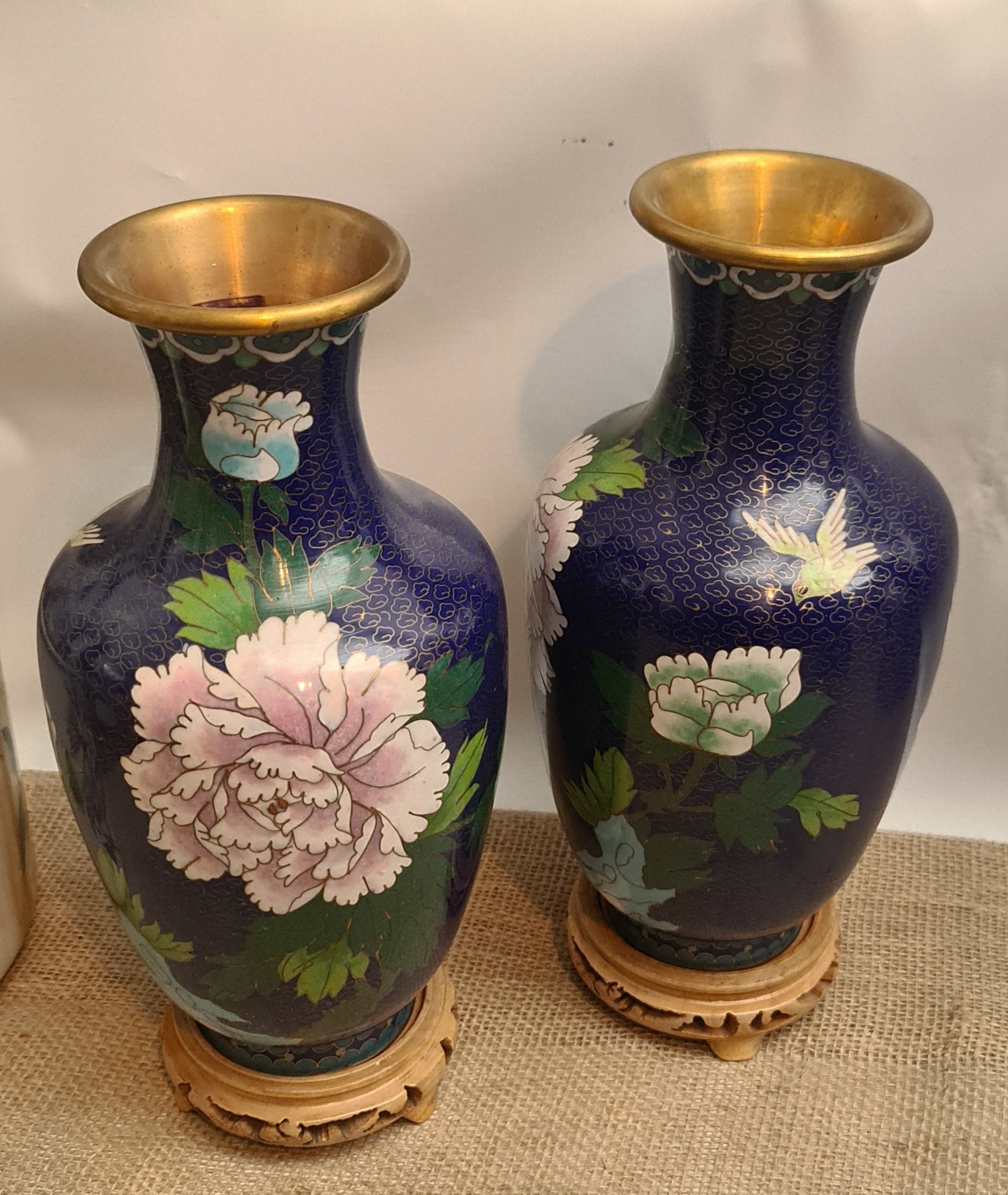 Vintage Pair of Cloisonne Vases on Wooden Bases. Blue Ground With Flower and Bird Images. Each measures 28cm tall on the stand and 26cm tall without the stand. Shipping is available. Please ask for a quote before bidding. Where possible we combine shipping costs. Remember, if you are the highest bidder above reserve on this Lot you have bought the item and are legally responsible for the item. Viewing is recommended in either person or via video link. Contact us to arrange.