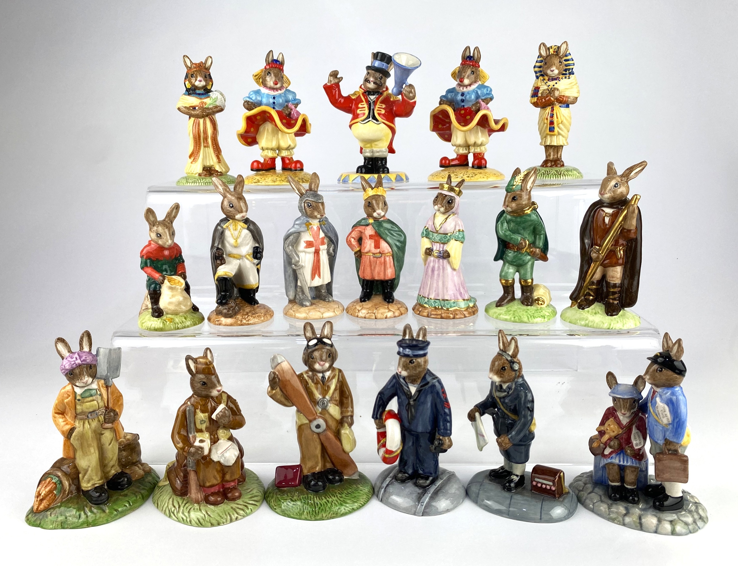 A collection of Royal Doulton Bunnykins figures, most boxed, to include World War II Collection six figure set, Gold Edition Robin Hood, Maid Marian and Little John, most boxed