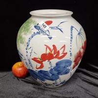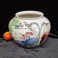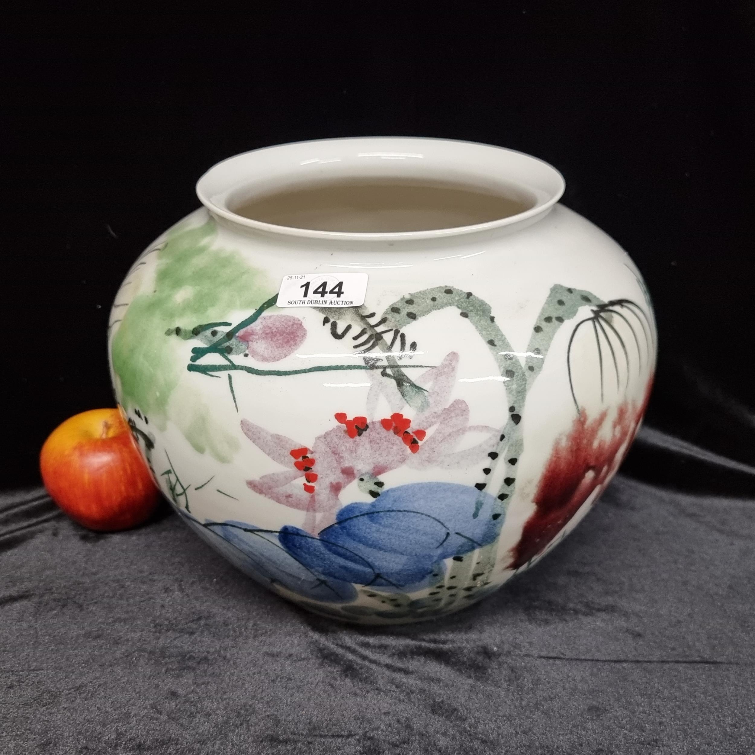 A large ceramic Japanese vase decorated in a painterly style with flowers and foliage in tone of blue green and mauve. In good condition. In good condition. Measuring 23cm