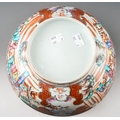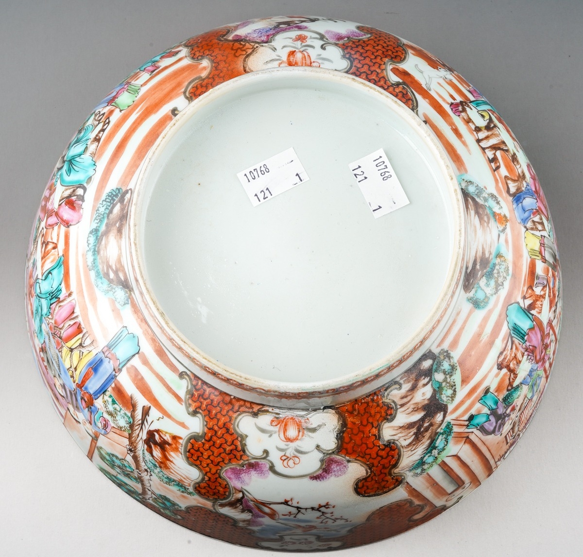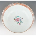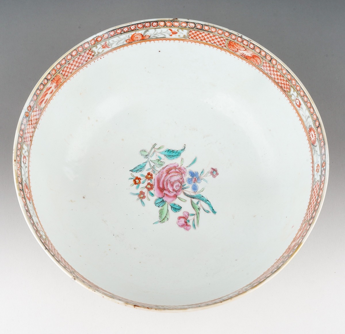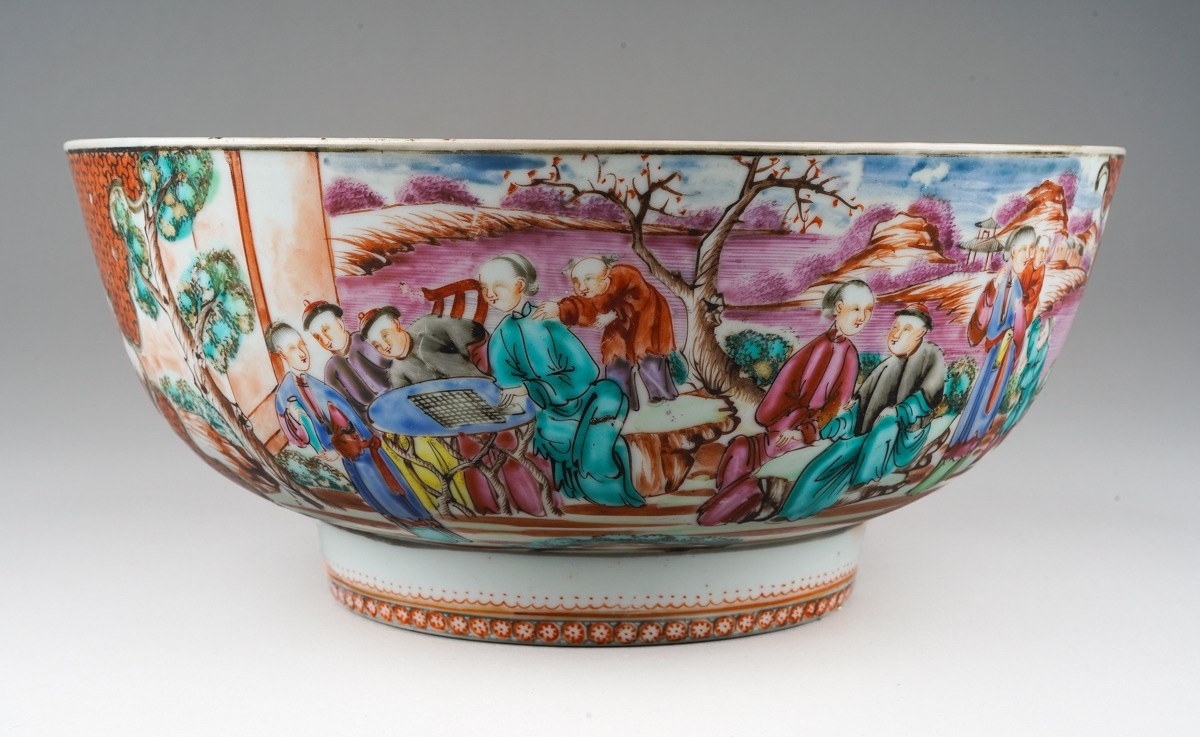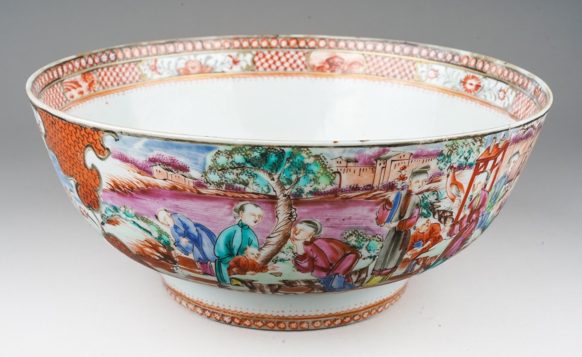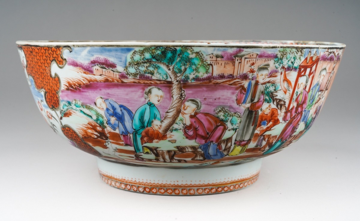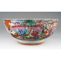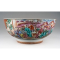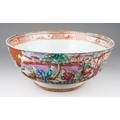 A late 18th / early 19th Chinese export porcelain Famille Rose bowl, the interior enamelled with an iron red border of geometric patterns and vignettes of flowers and landscapes, the exterior with two large polychrome panels of figures in gardens and two smaller panels of birds in branches, unmarked, restored, diameter 25.7cm x height 11.2cm