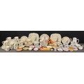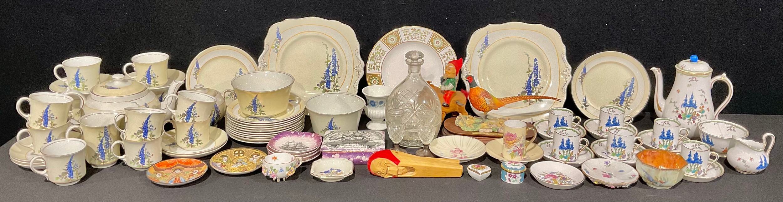 A Royal Worcester Connoisseur Collection patch box and cover; a pair of Geo V silver mounted thistle shaped posy vases, London 1934; a Wedgwood lustre octagonal dragon bowl; a Meissen floral encrusted cup and saucer; a Border Fine Arts resin pheasant; an Art Deco Plant Tuscan coffee set; a Gray's Pottery Sunderland lustre box and cover and four coasters; a novelty nutcracker as an old woman in a red headscarf; a tinplate clockwork gnome on a donkey; a cut glass decanter and tot glasses; etc