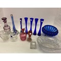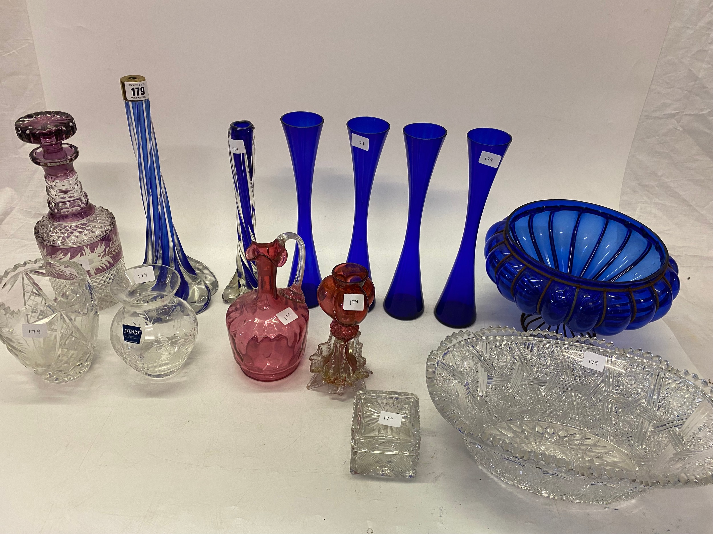 A large blue and clear wrythen vase, four blue vases, a blue lobed bowl in metal frame, a cranberry ewer, two cranberry vases, an opaline candleholder etc..