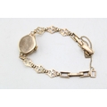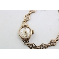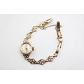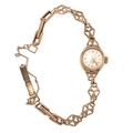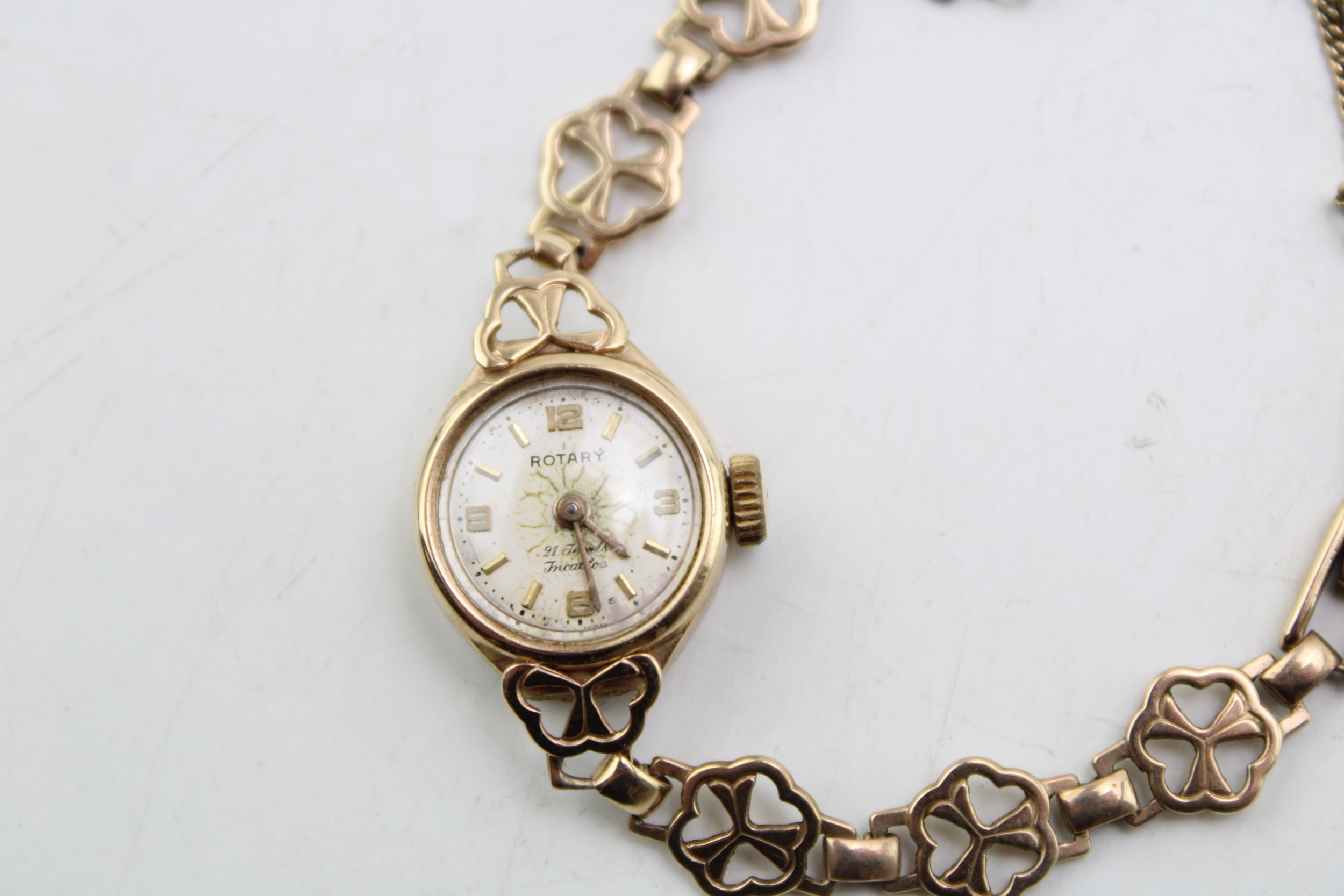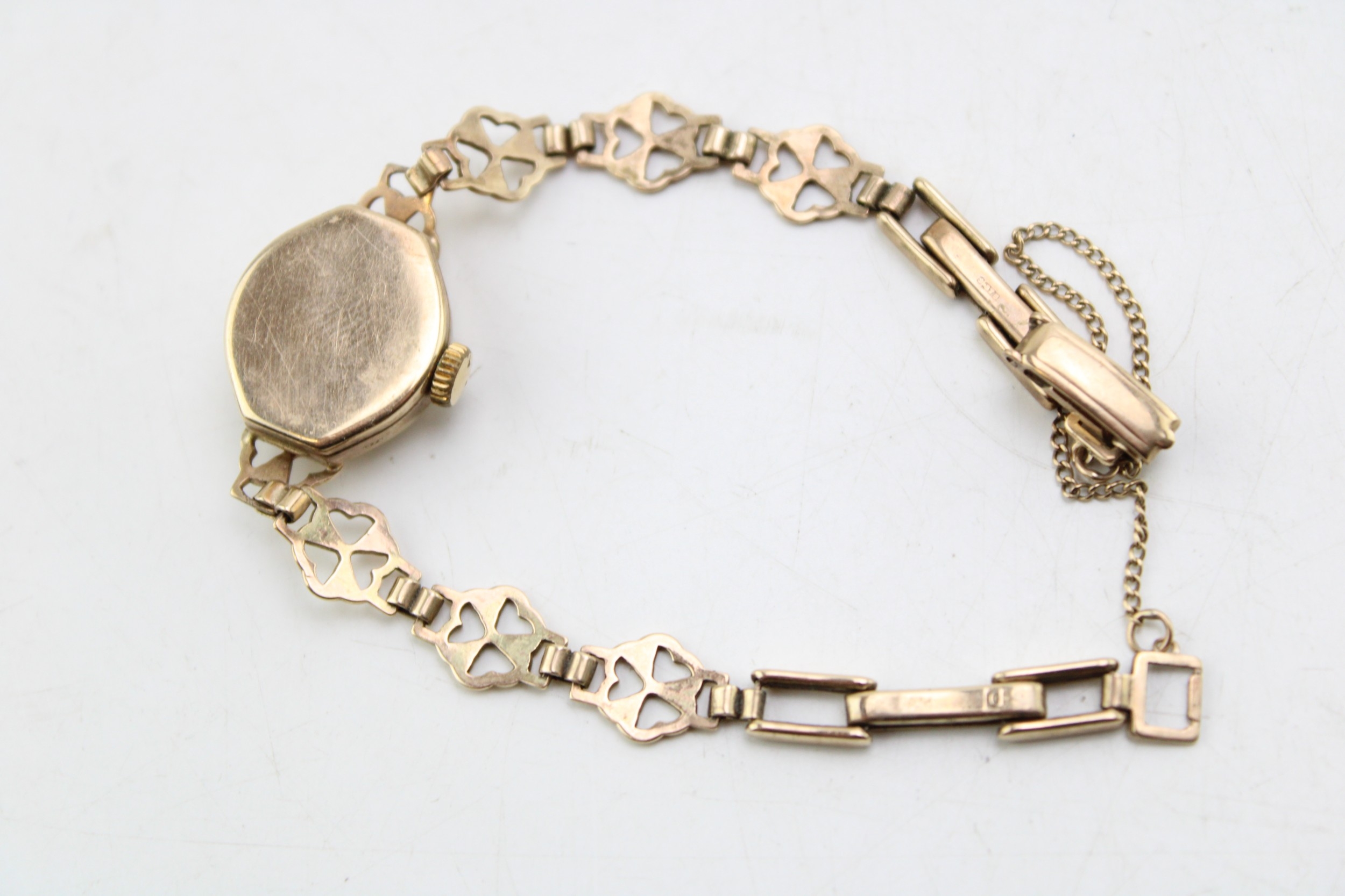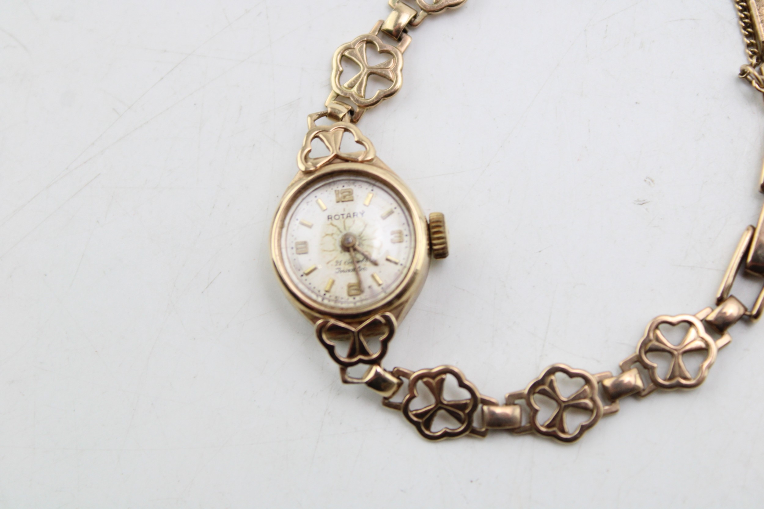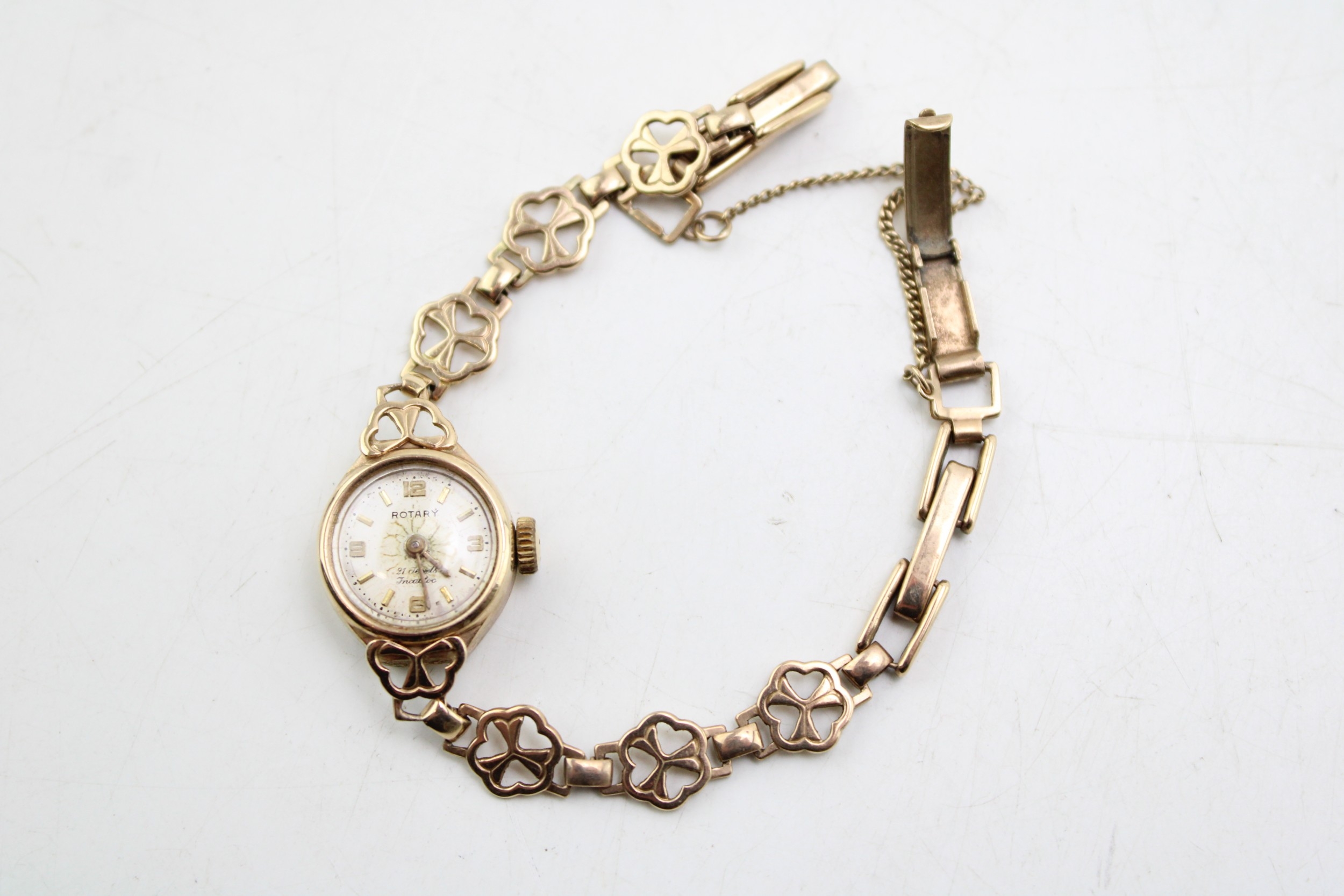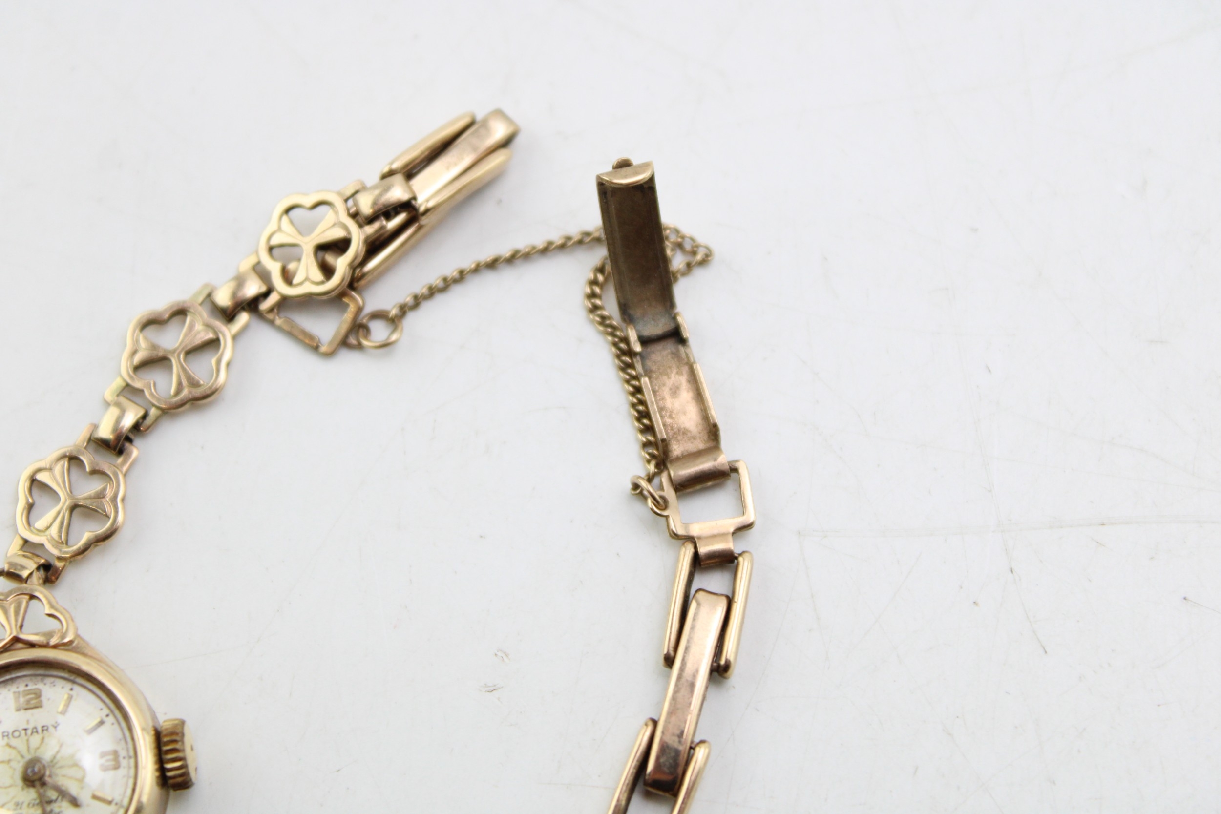 A 9ct gold cased vintage Rotary cocktail watch, the signed champagne dial with baton and Arabic quarter numerals and minute track, with 9ct gold shamrock decorative panelled strap, marked to the clasp, total weight including movement and glass 10.0g. Watch sets, winds and appeared to work for period observed.