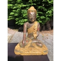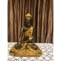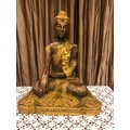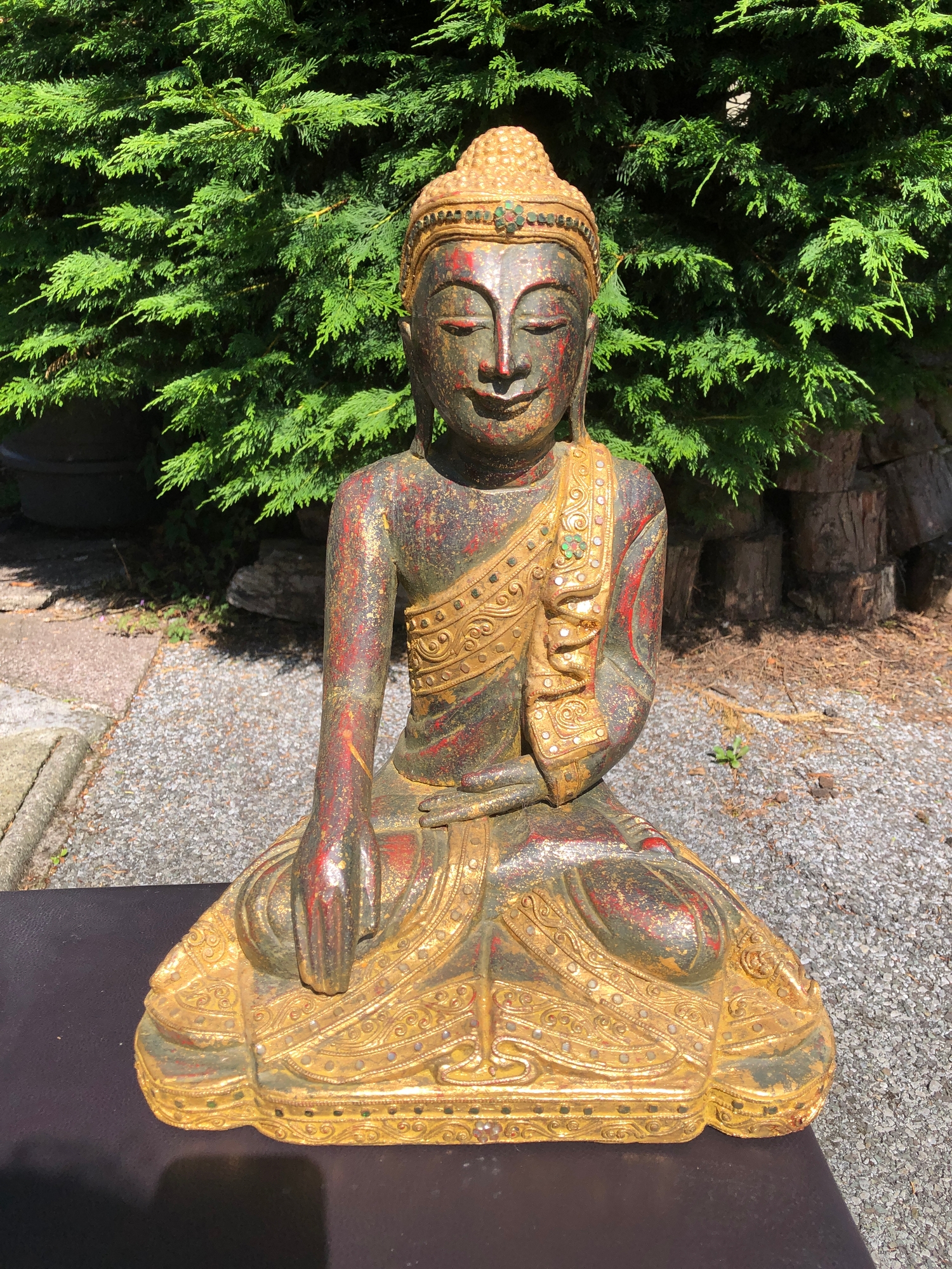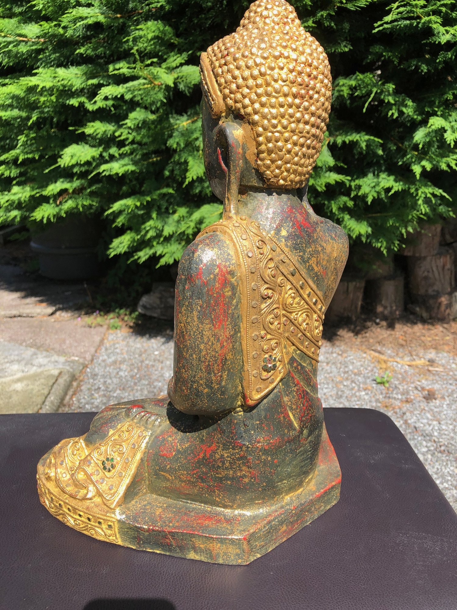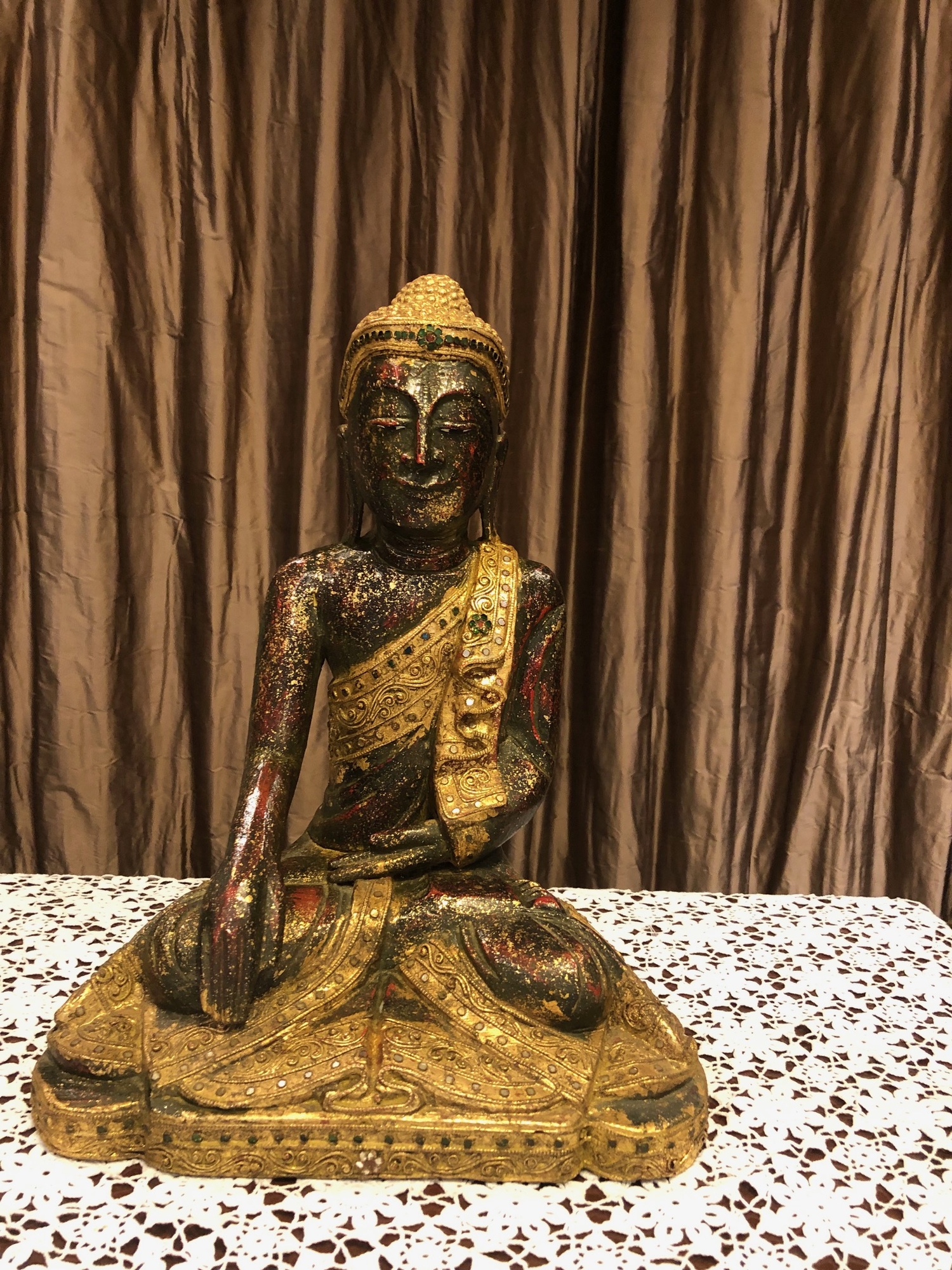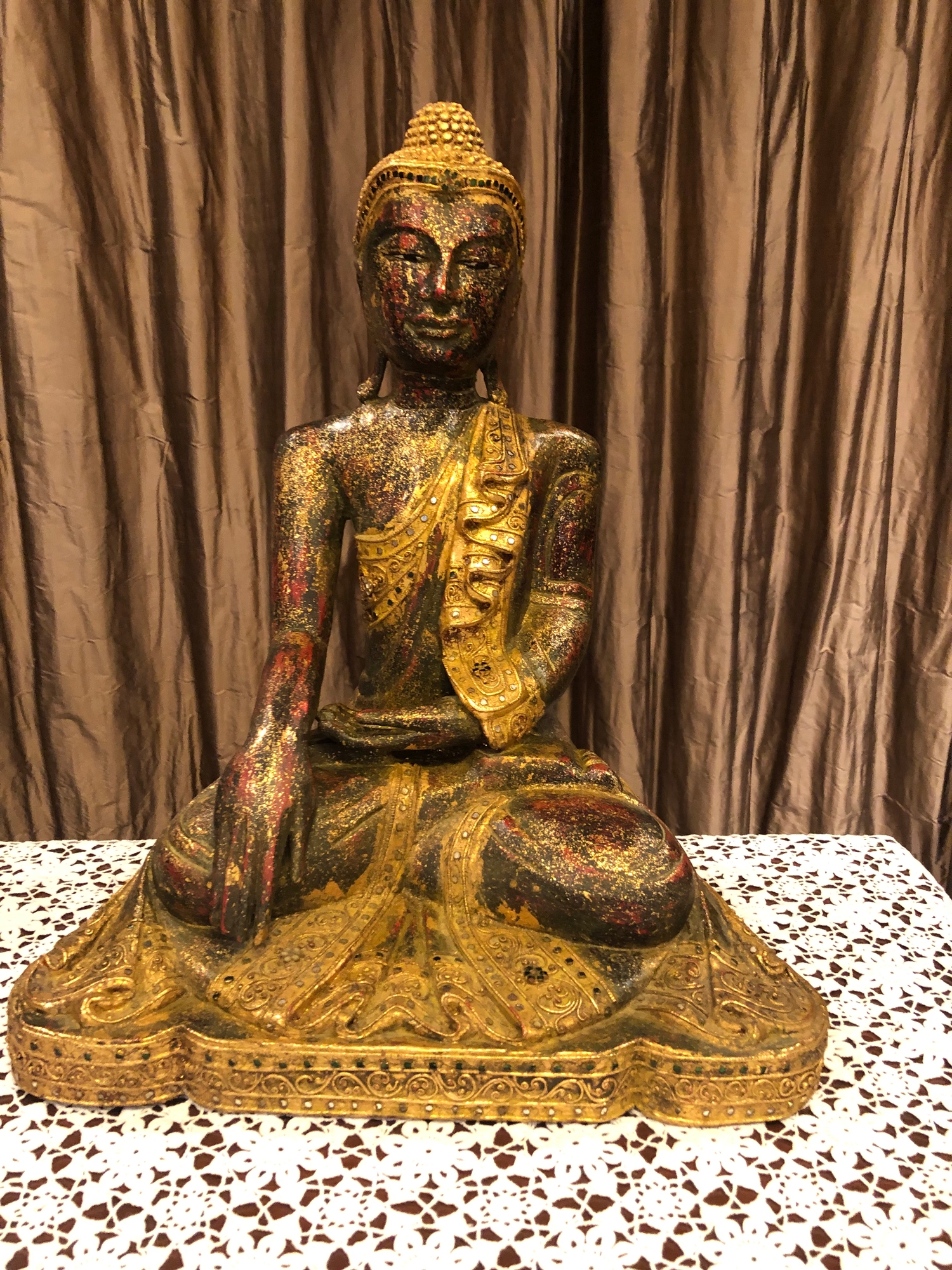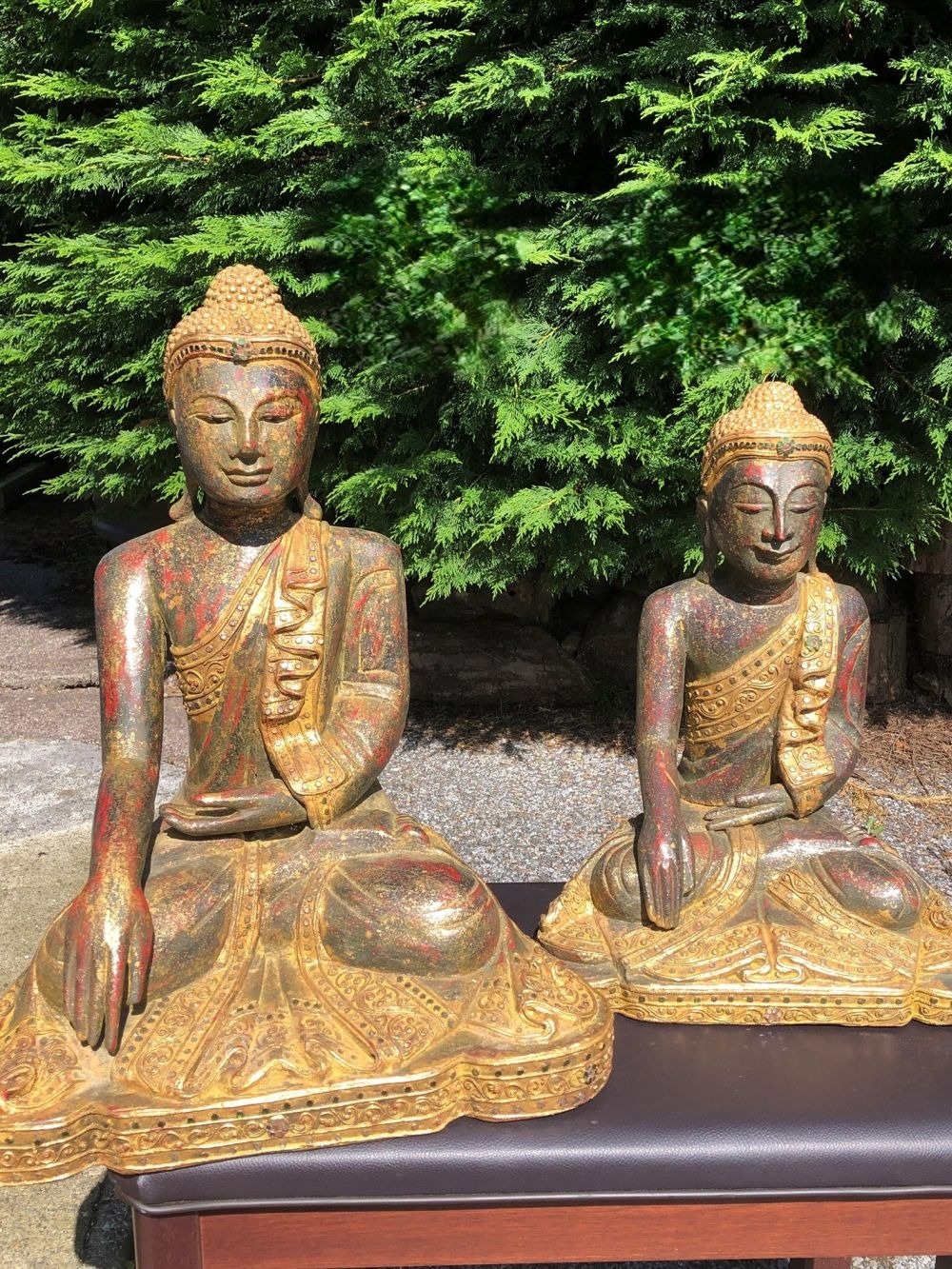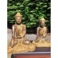 A PAIR OF HARDWOOD CARVED THAI FIGURES, intricately carved, dimensions: larger: 21 inches high; smaller: 17 inches high approx.