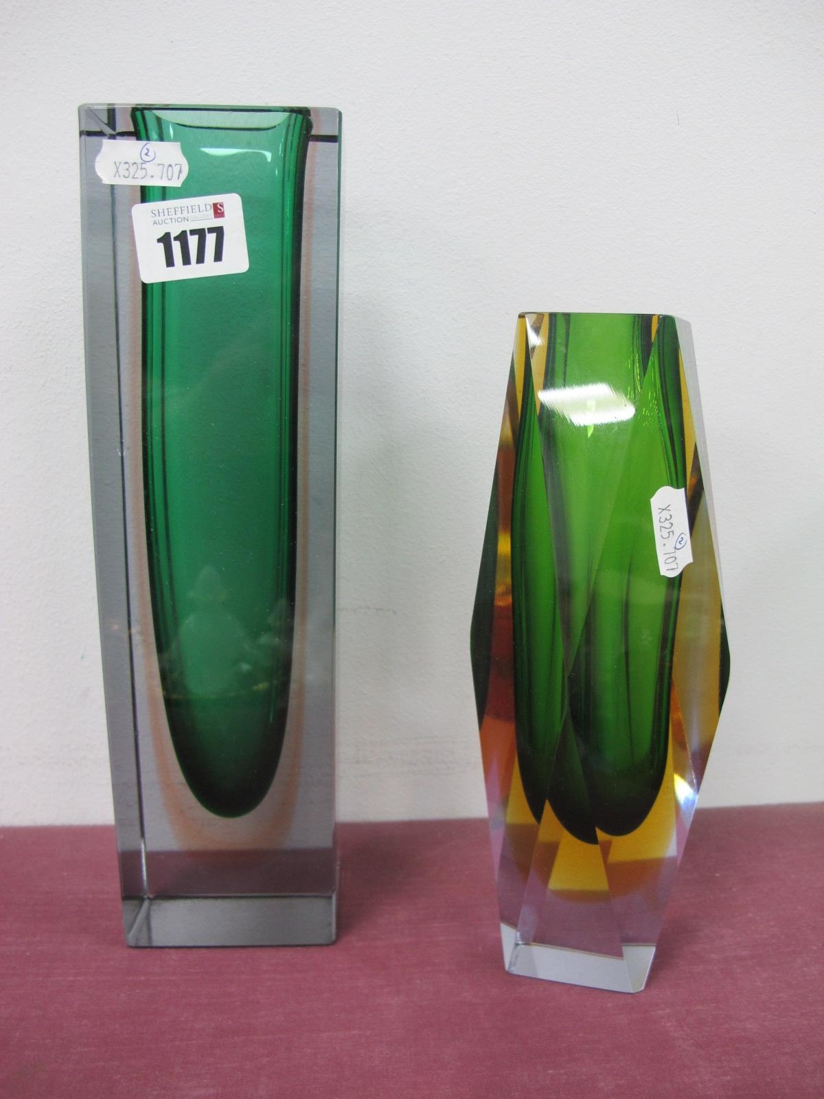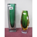 Sommerso Italian Style Glass Angular Vase, circa 1970's, with green 'U' shape interior, amber and clear glass casing, 20.5cm high, a similar rectangular large example. (2).