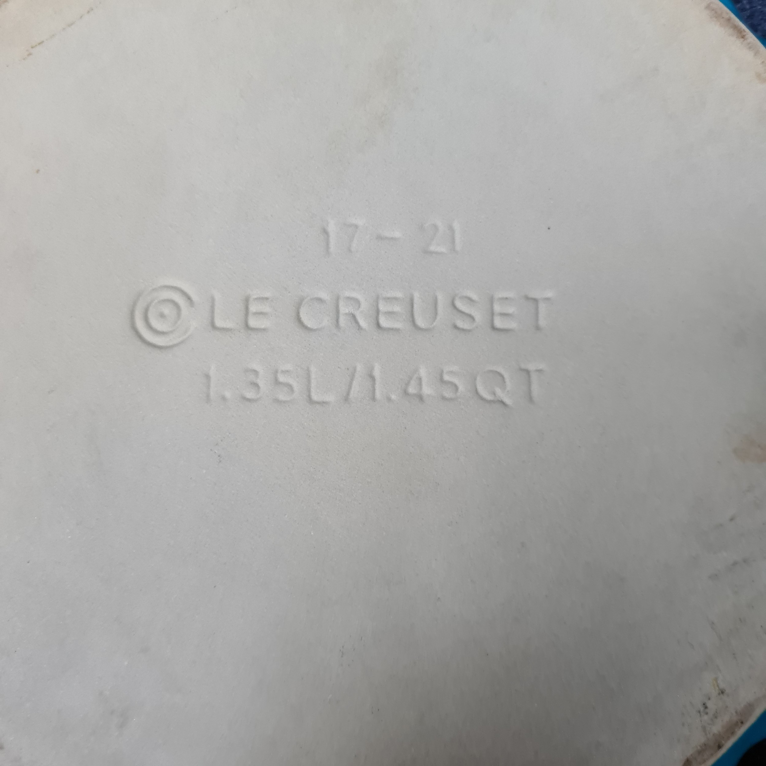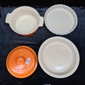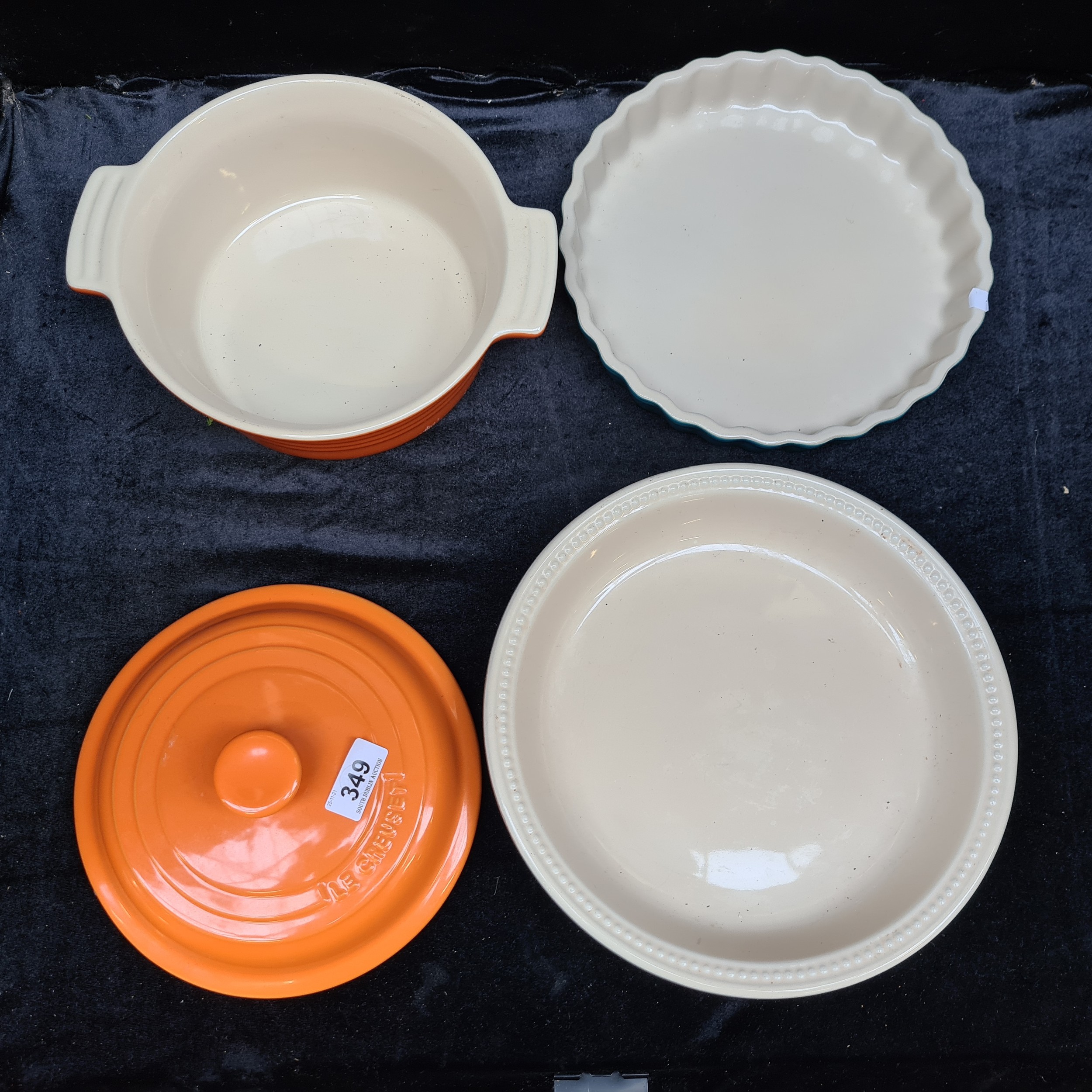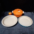 Three "Le Creuset" stoneware items. Including a 1.35 and a 1.6 litre pie dish and a casserole dish. All brand new.
