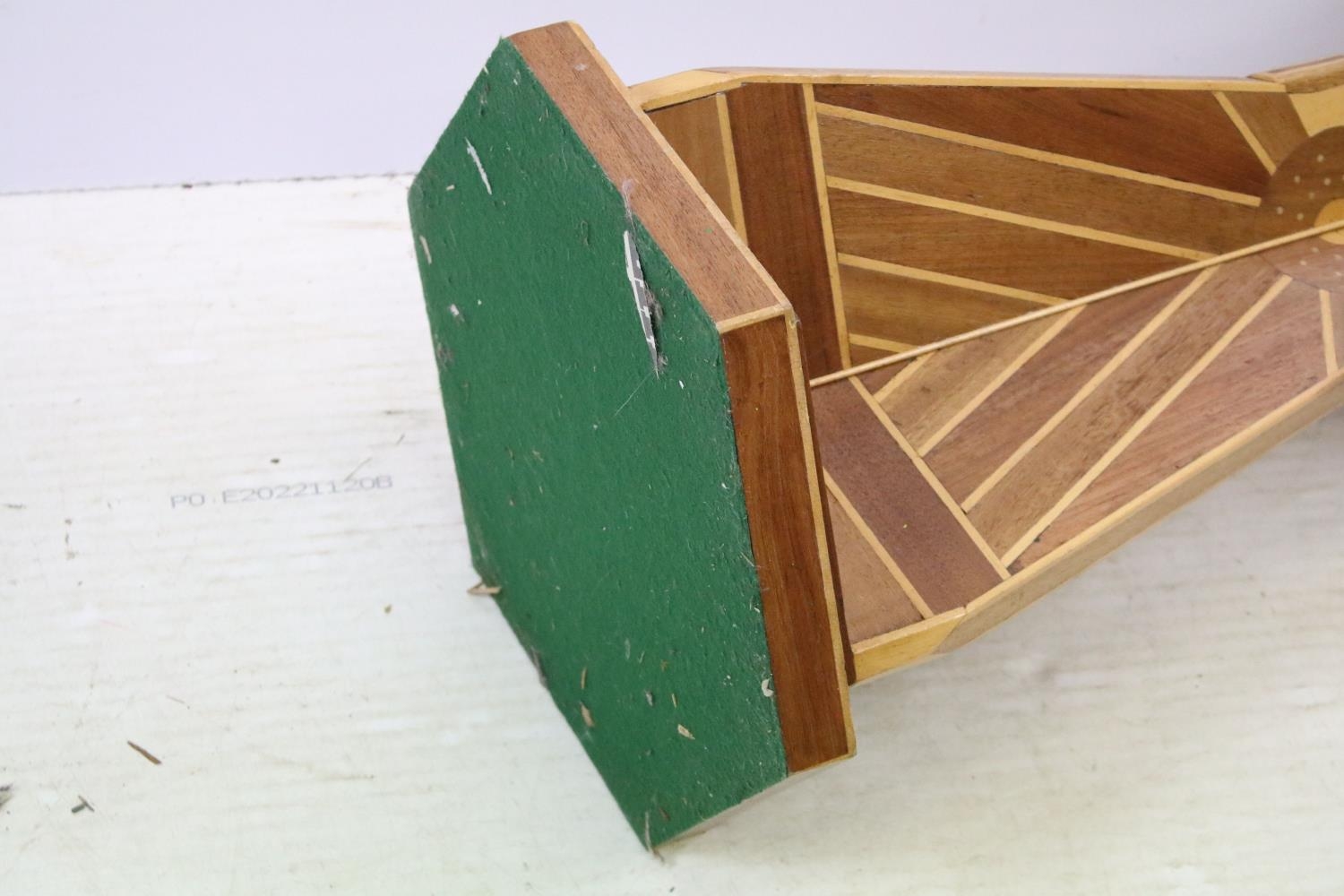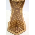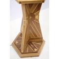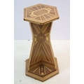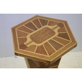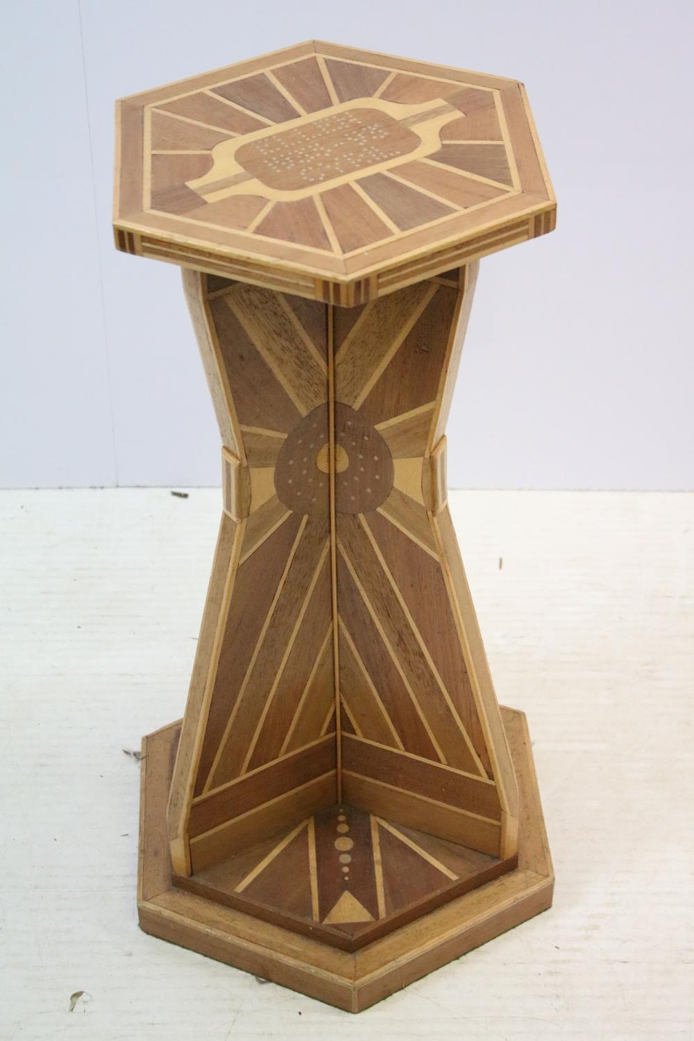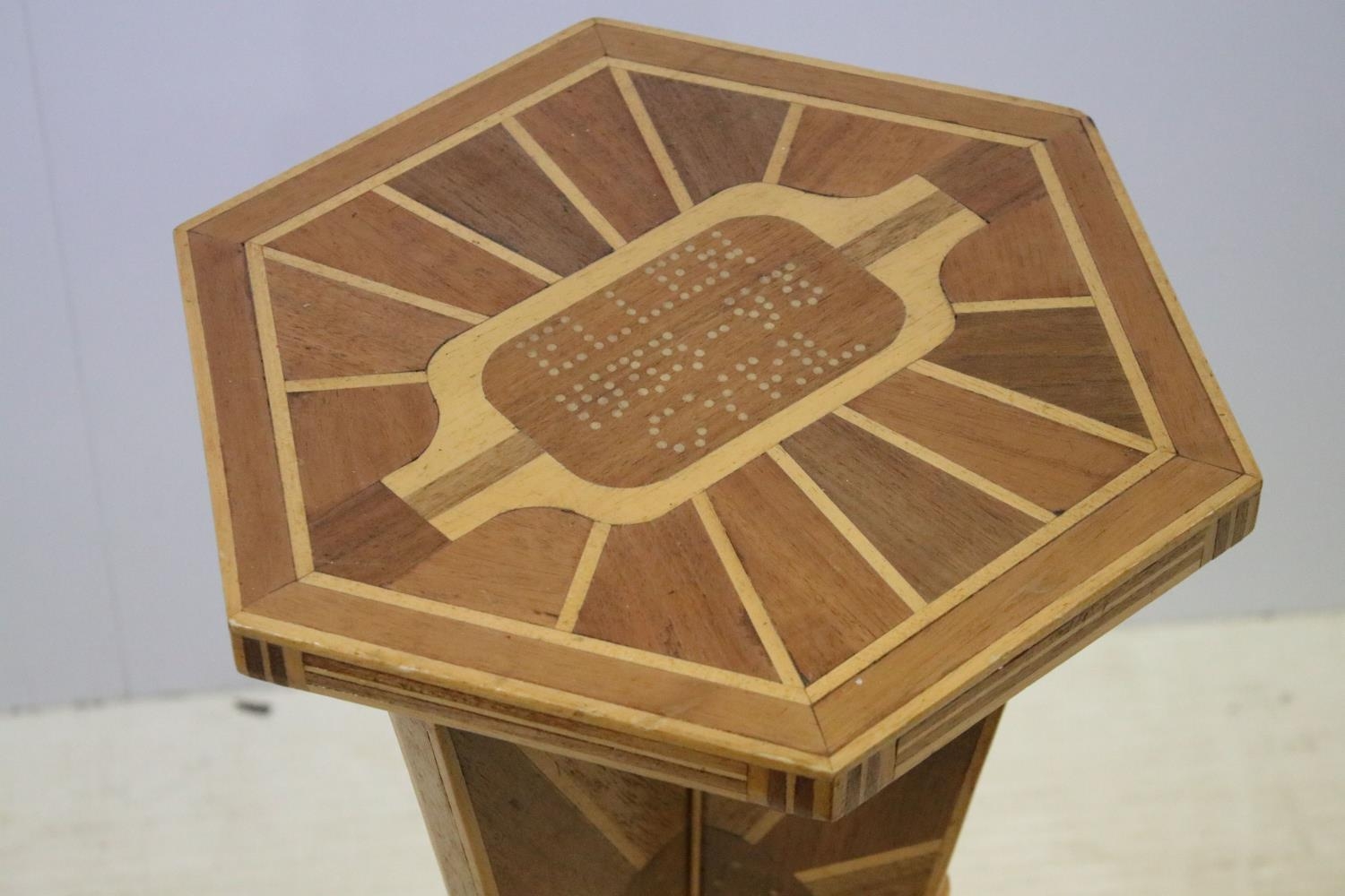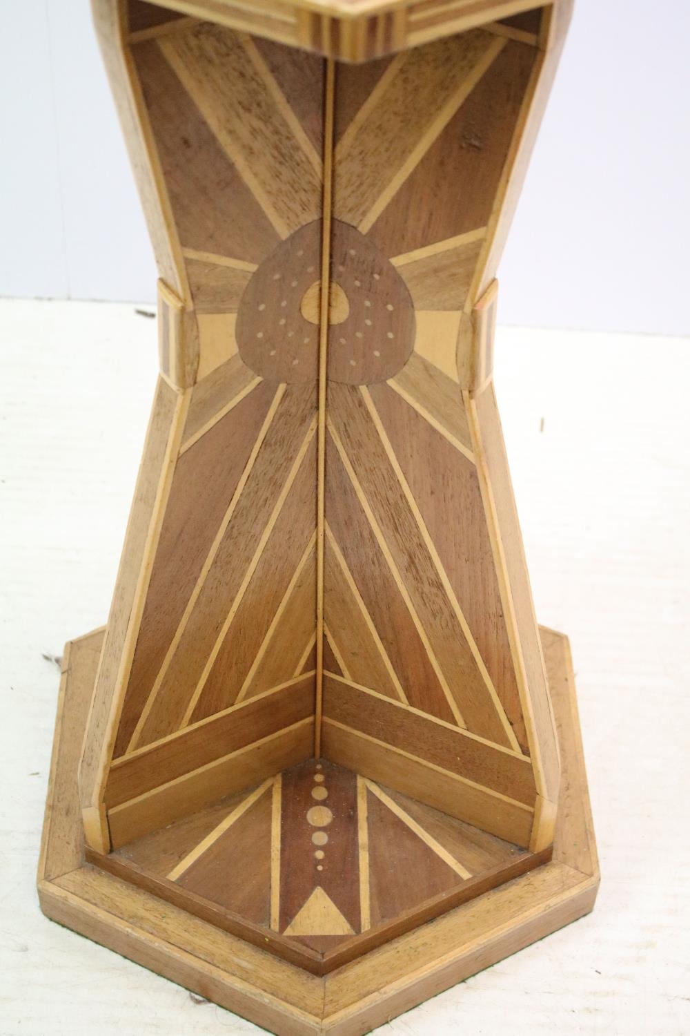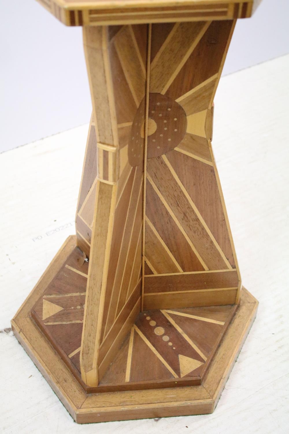 Art Deco marquetry lamp side table of hexagonal form with angular support with sunburst marquetry detailing. Measures 65cm tall.