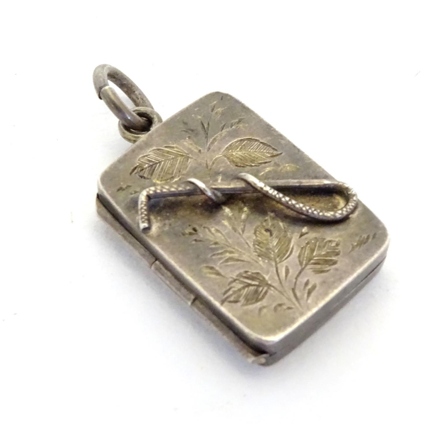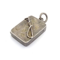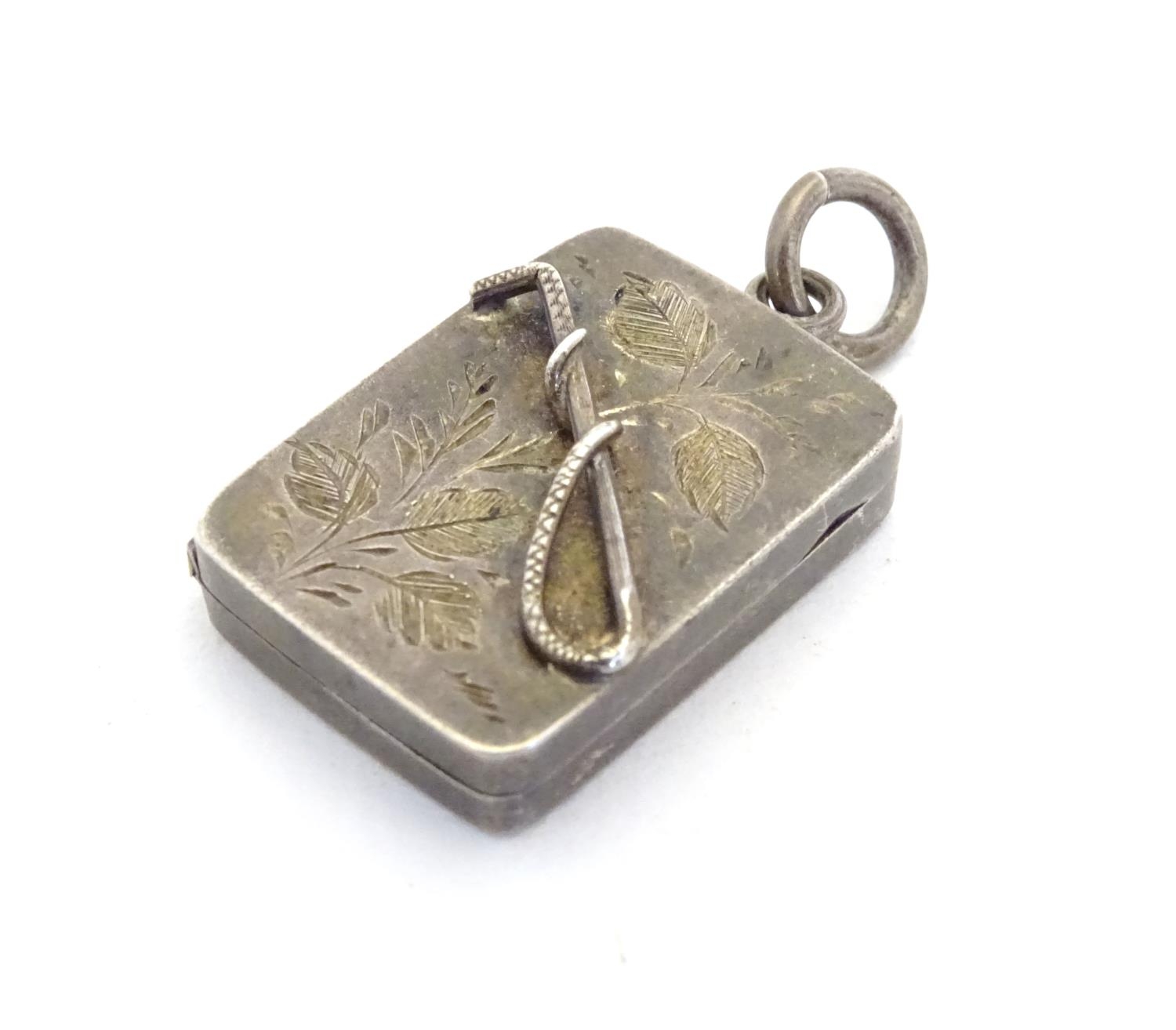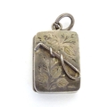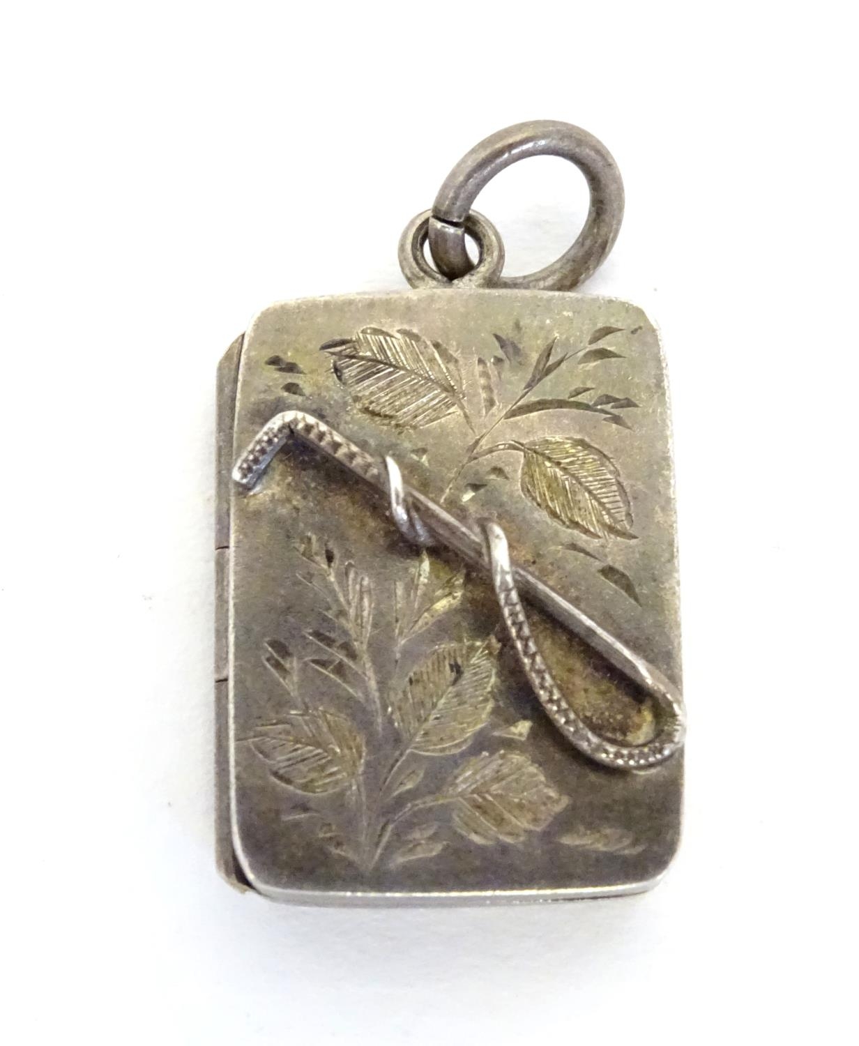 A Victorian silver pendant formed locket of squared form with riding whip detail to front. Approx 1" long