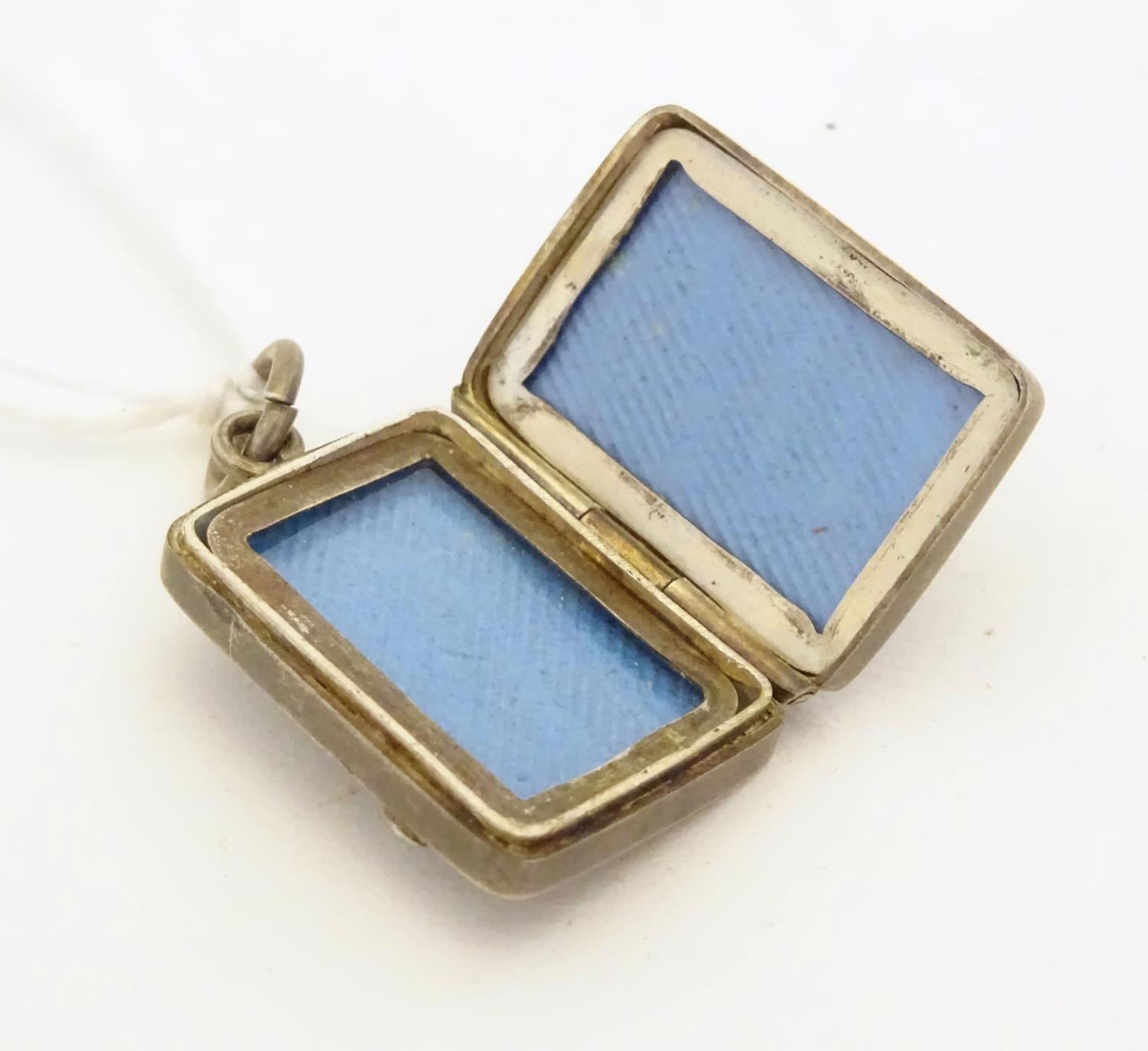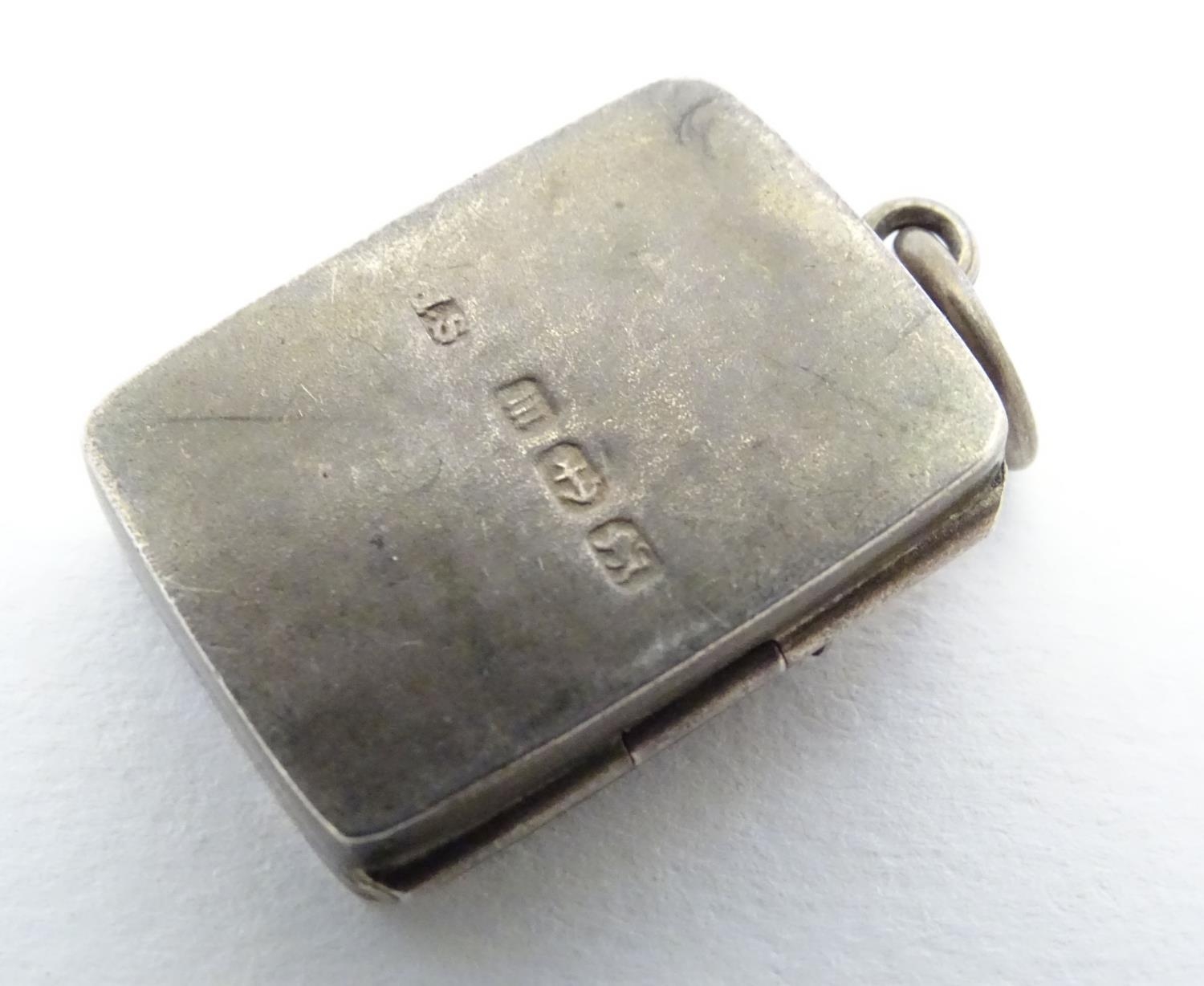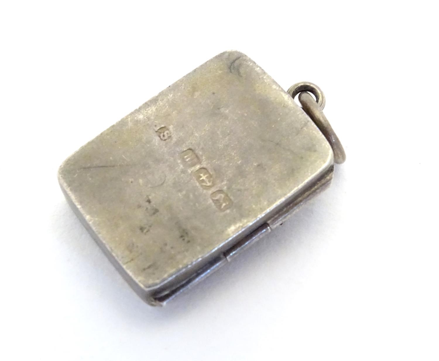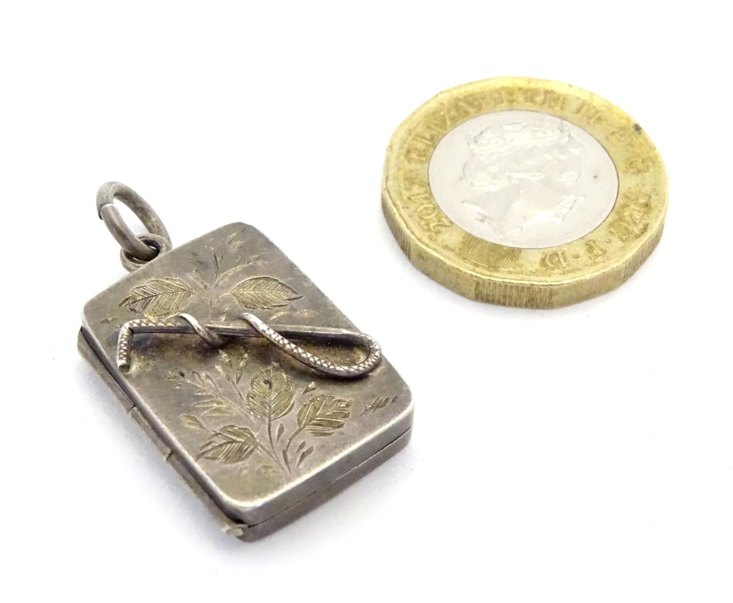 A Victorian silver pendant formed locket of squared form with riding whip detail to front. Approx 1" long