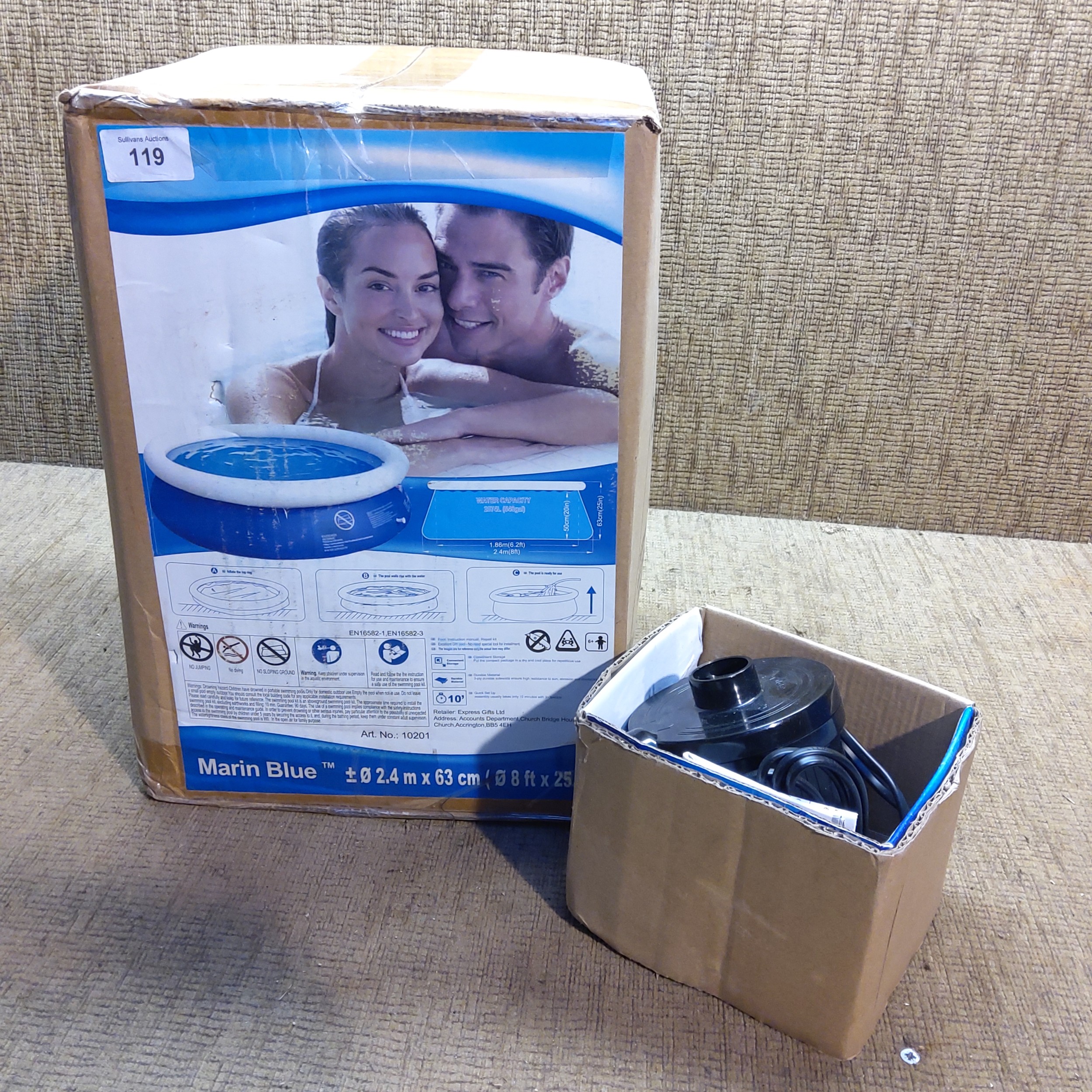 Marin Blue boxed swimming pool 2.4m x 63cm and pump.