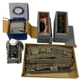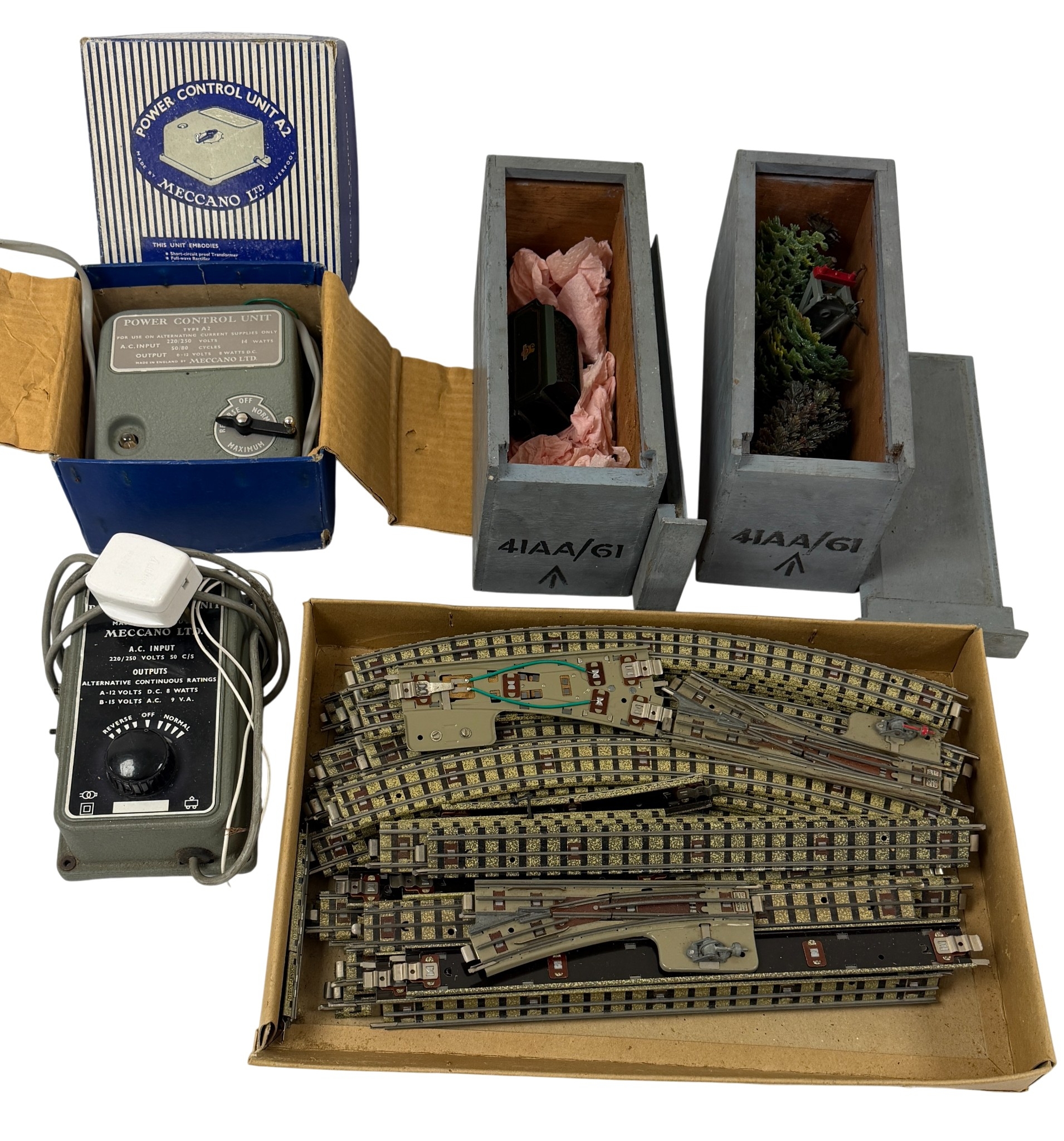 Comprising a quantity of Dublo track including straight and curved sections and points. Two Hornby Dublo power Control units (untested). A boxed locomotive. A wooden storage box containing assorted Accessories such as model trees and scenic items.