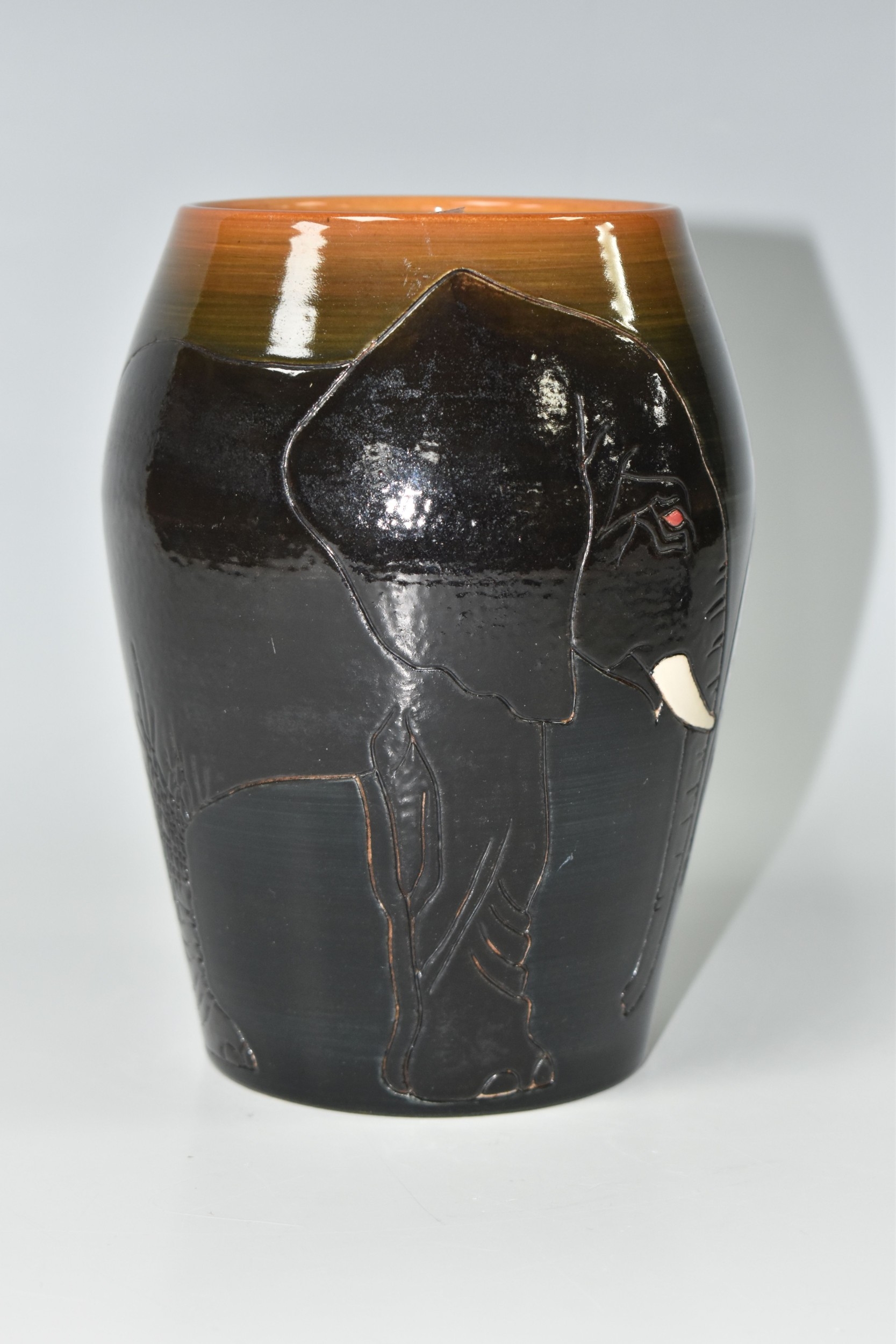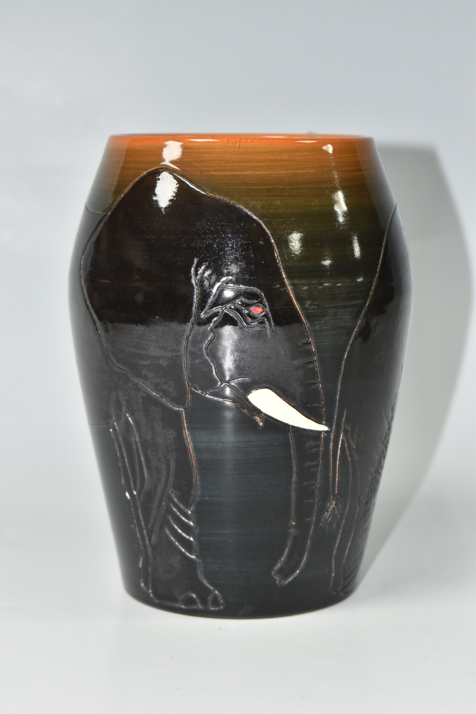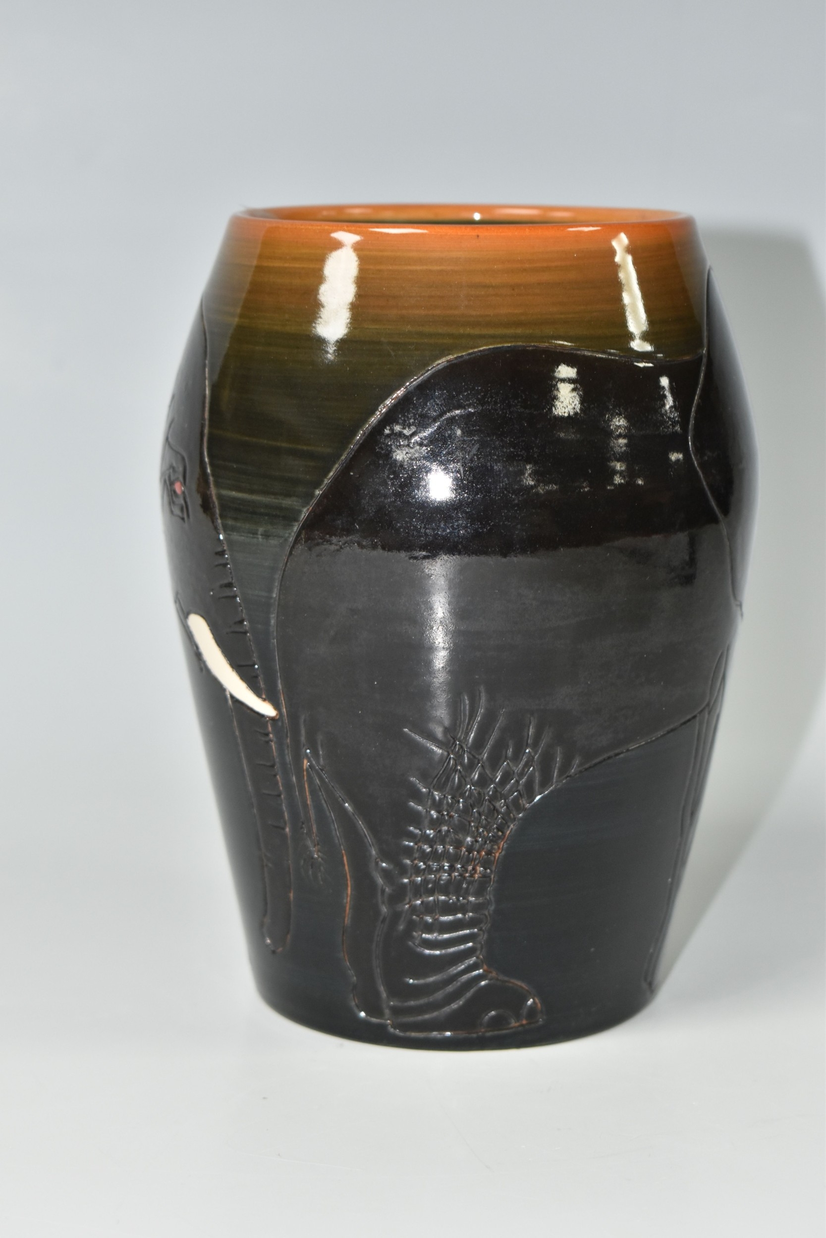 A DENNIS CHINA WORKS 'ELEPHANT' VASE, by Sally Tuffin, with incised decoration of two elephants on a graduated orange to blue ground, no 56, painted and impressed marks to base, height 16.5cm (1) (Condition Report: appears ok, a few tiny crazing lines near rim, would benefit from a clean)
