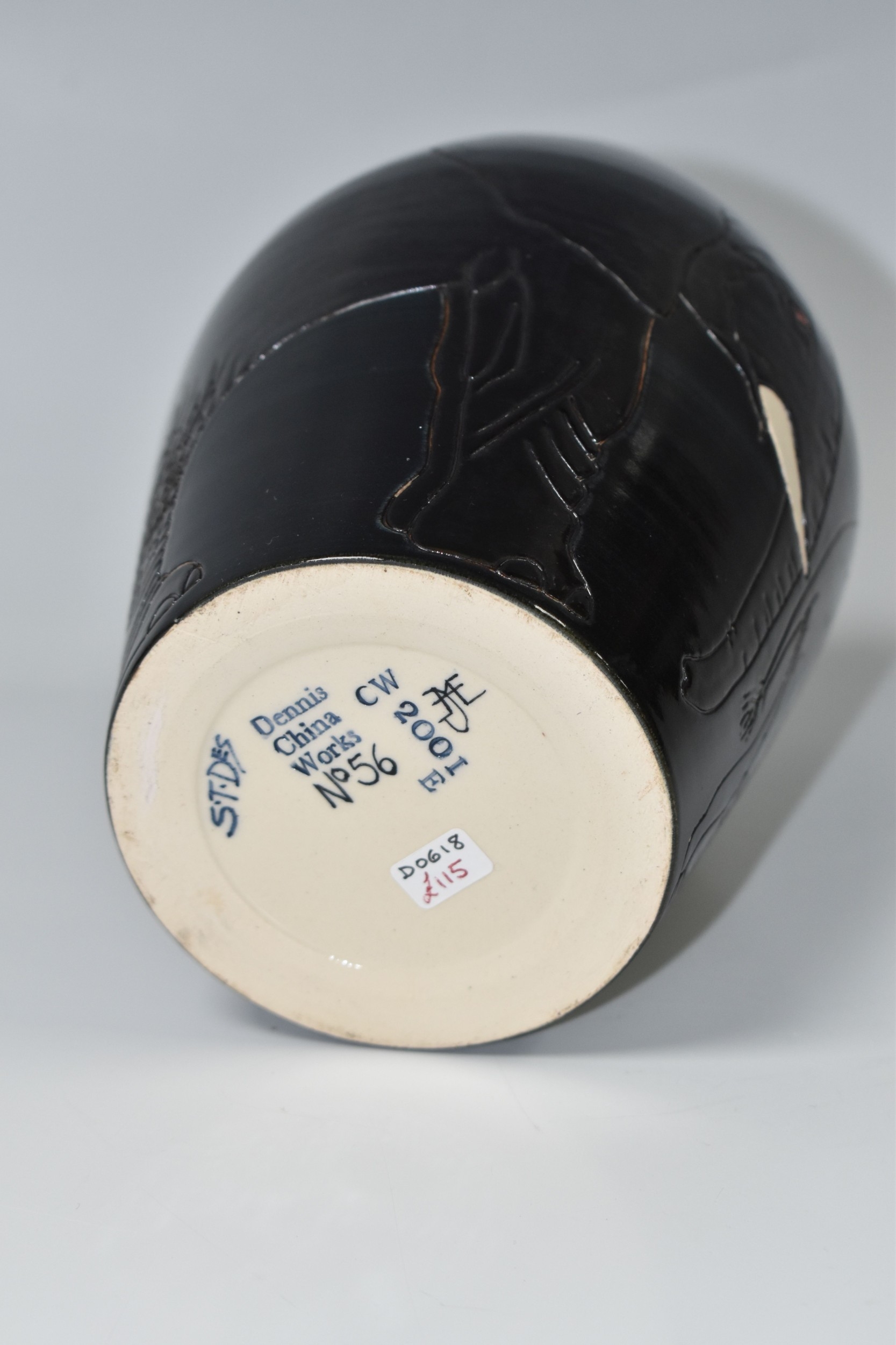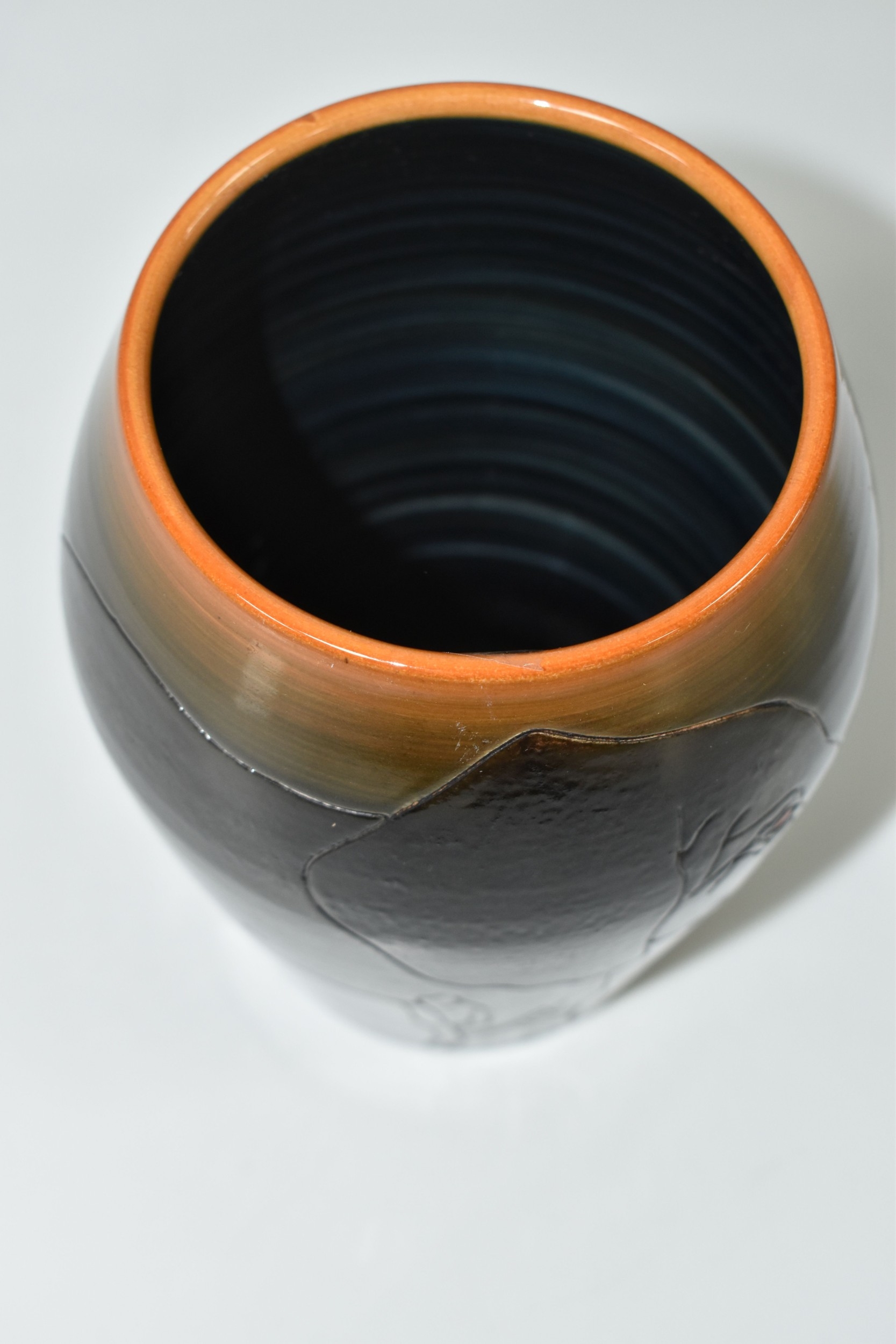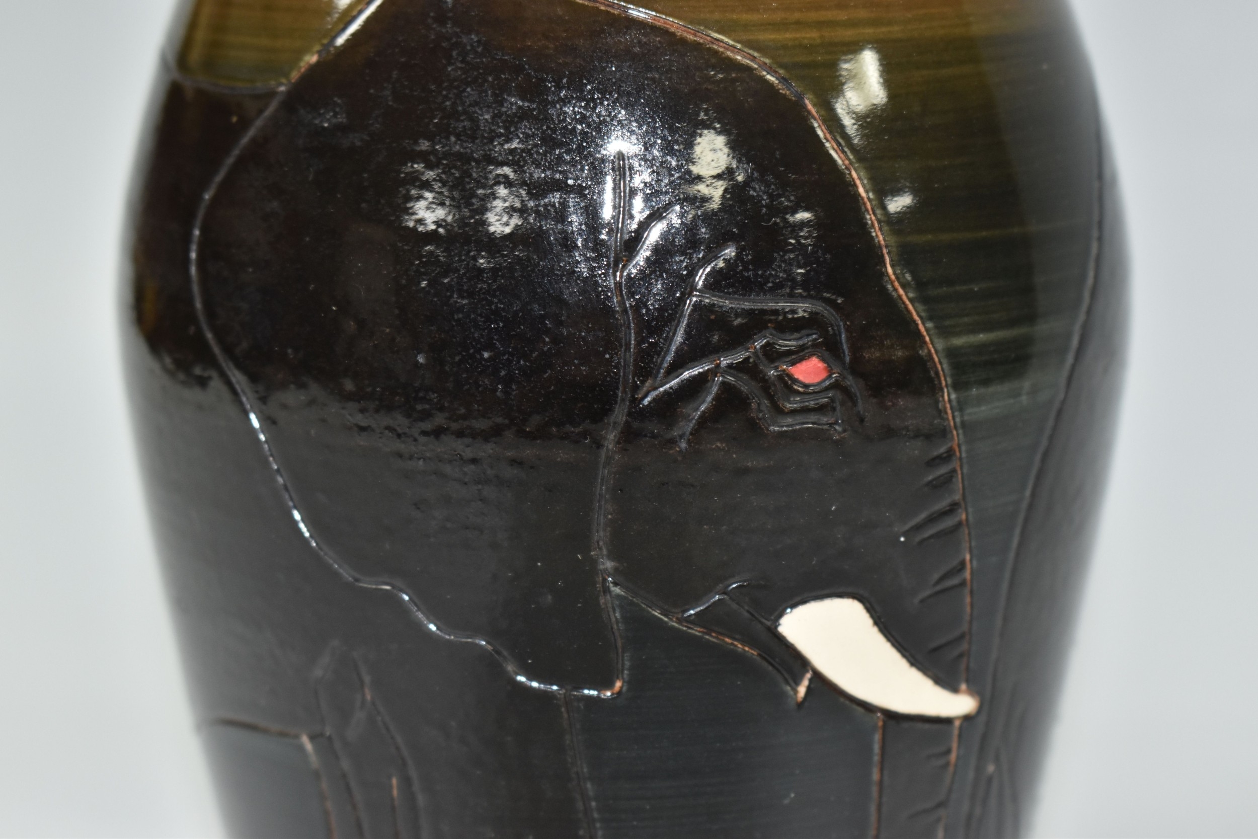 A DENNIS CHINA WORKS 'ELEPHANT' VASE, by Sally Tuffin, with incised decoration of two elephants on a graduated orange to blue ground, no 56, painted and impressed marks to base, height 16.5cm (1) (Condition Report: appears ok, a few tiny crazing lines near rim, would benefit from a clean)