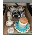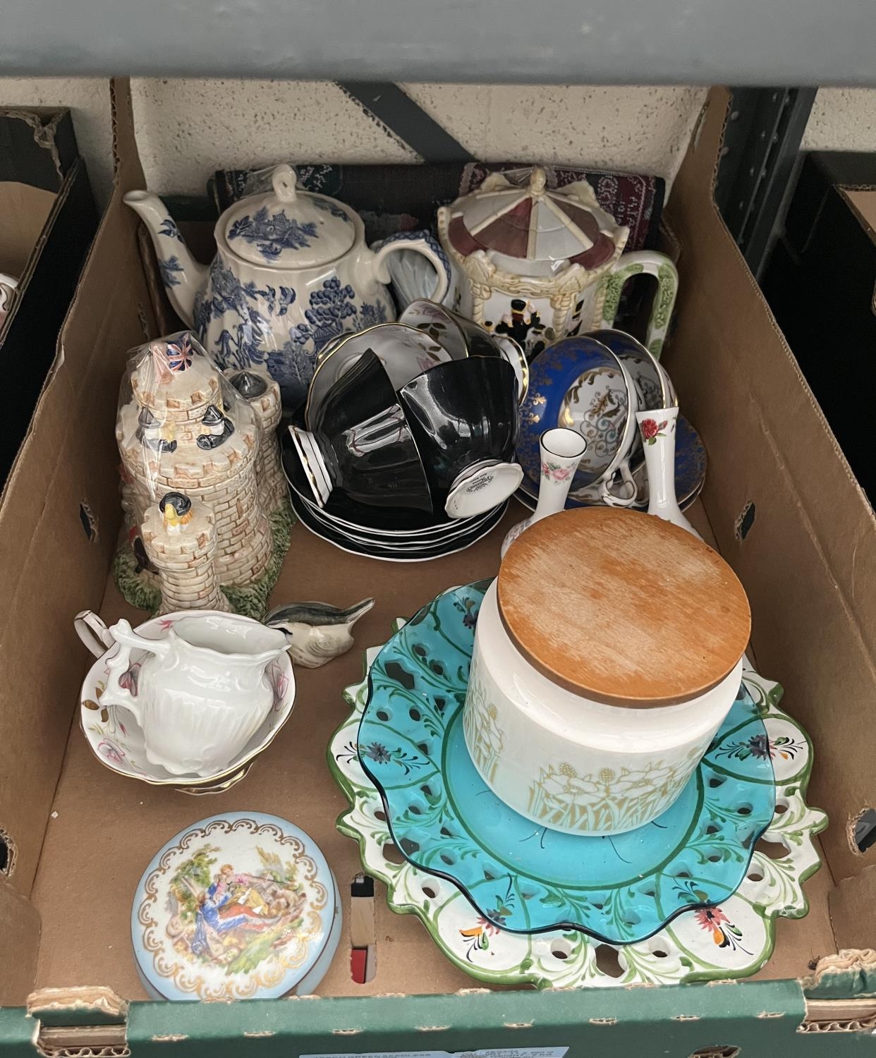 Box containing a French trinket dish, a 'castle' teapot and Princess Ann Fine Bone China etc
