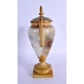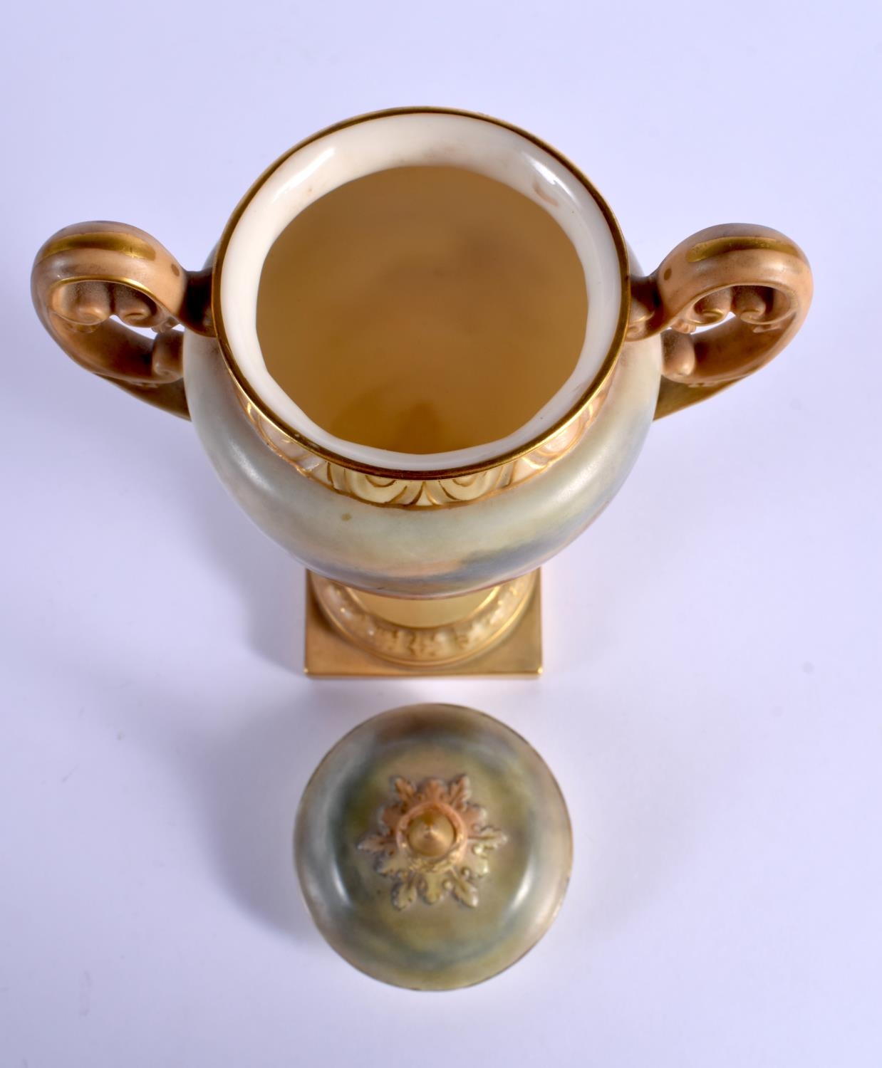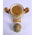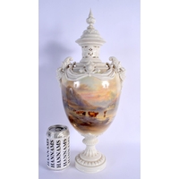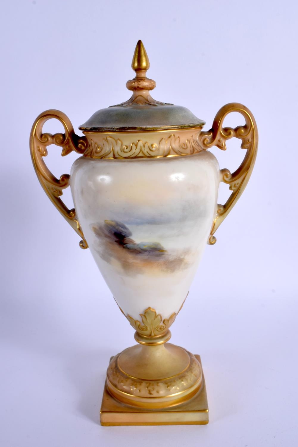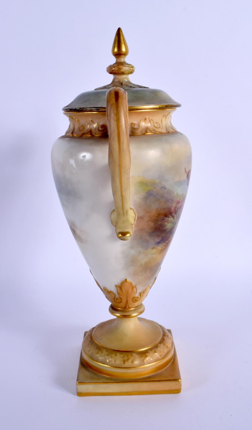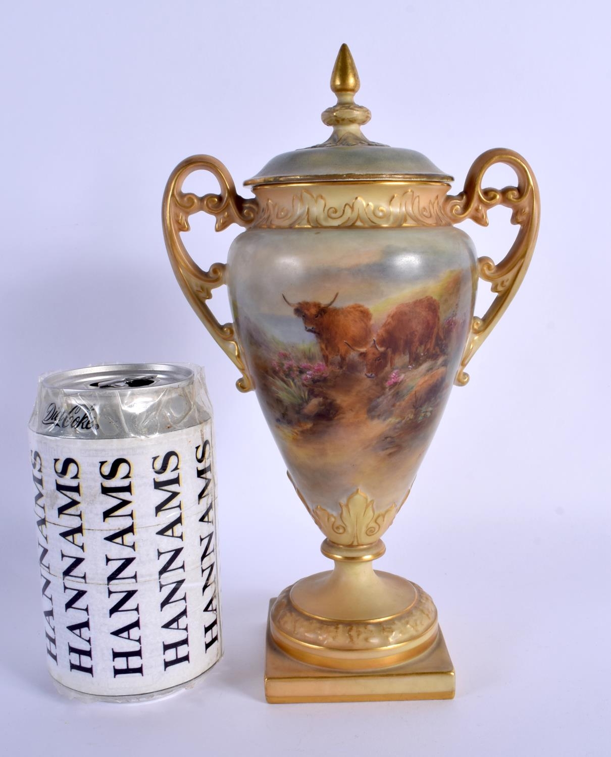 A ROYAL WORCESTER TWIN HANDLED PORCELAIN VASE AND COVER by James Stinton, painted with highland cattle. 23 cm x 10 cm.