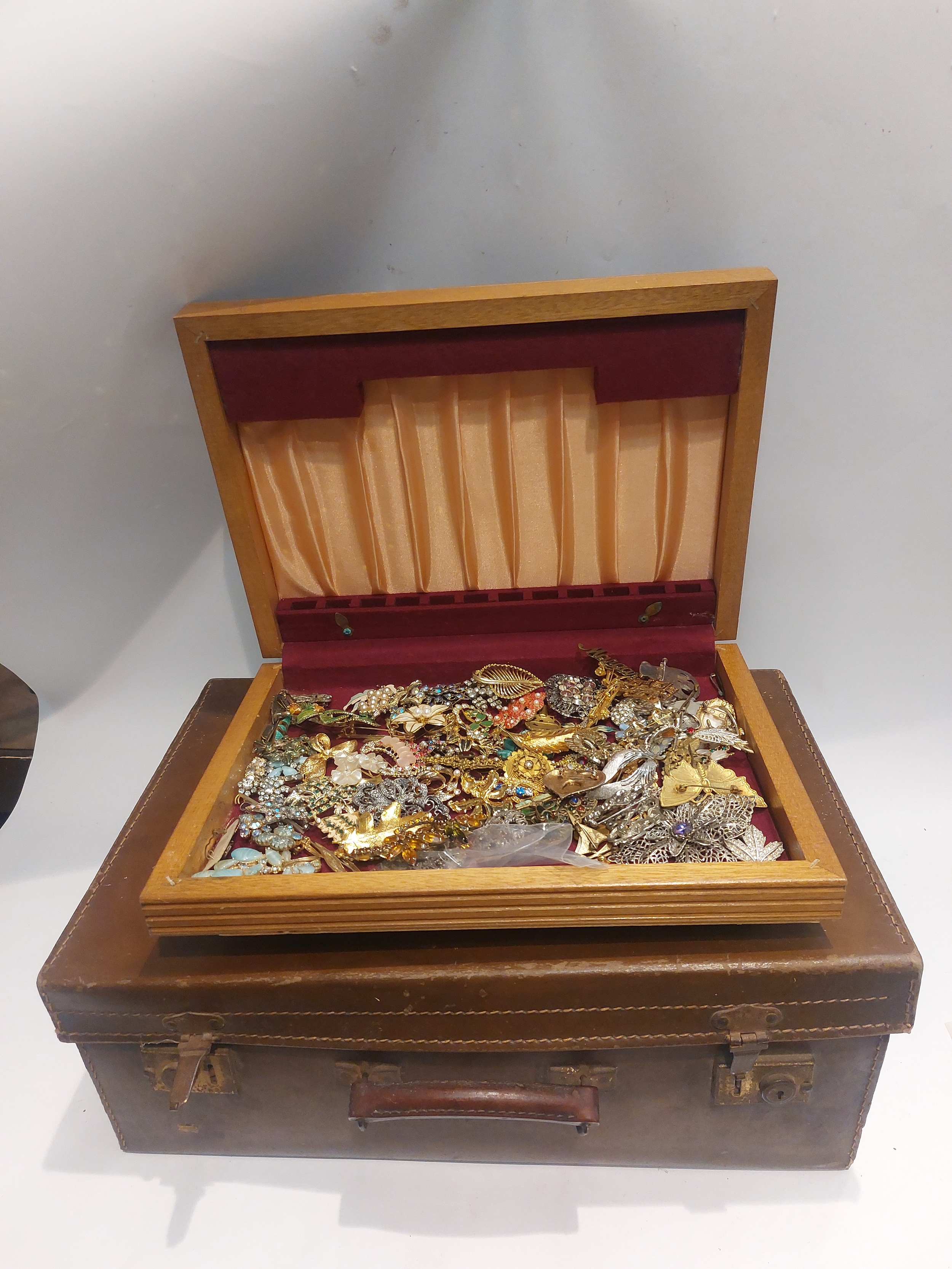 A suitcase containing costume brooches