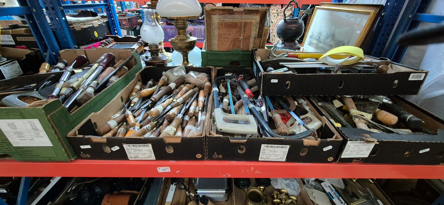 5 boxes of tools to include chisels, ratchet screwdrivers, metal saws etc