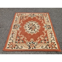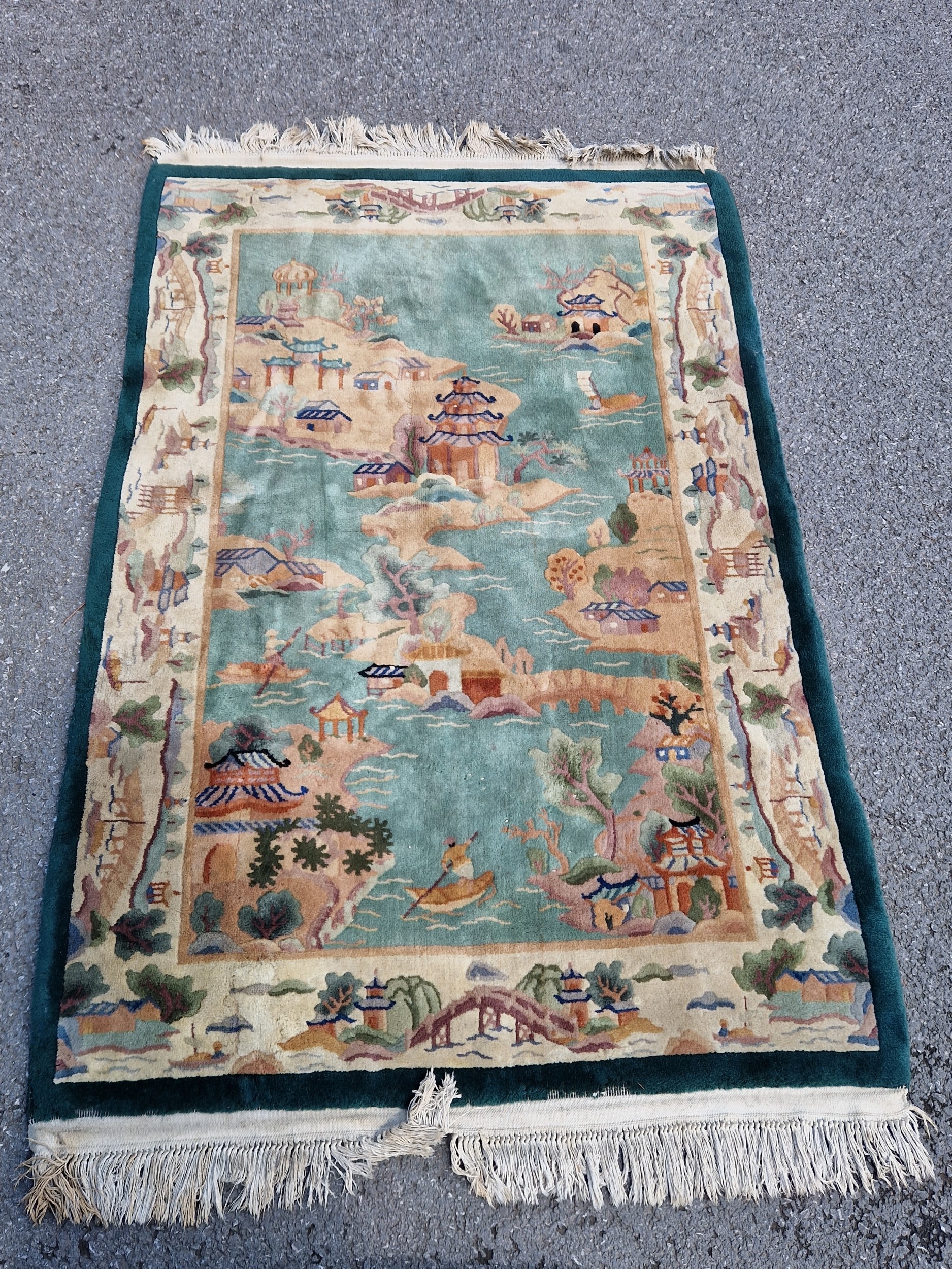 ANTIQUE RUG PICTURING AN ORIENTAL COASTAL LANDSCAPE