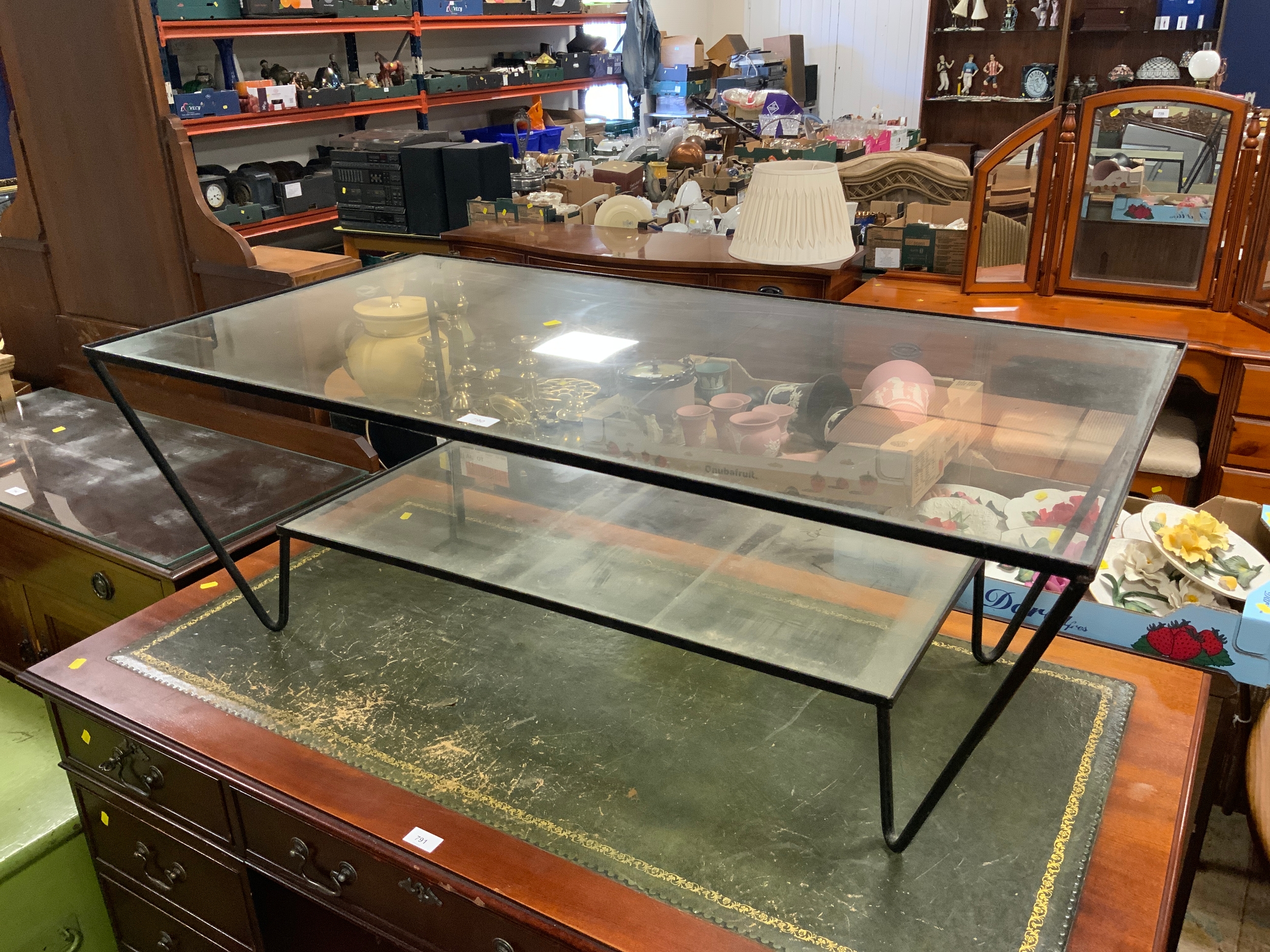 A modern black metal and glass two tier coffee table H 43 cm W 114 cm
