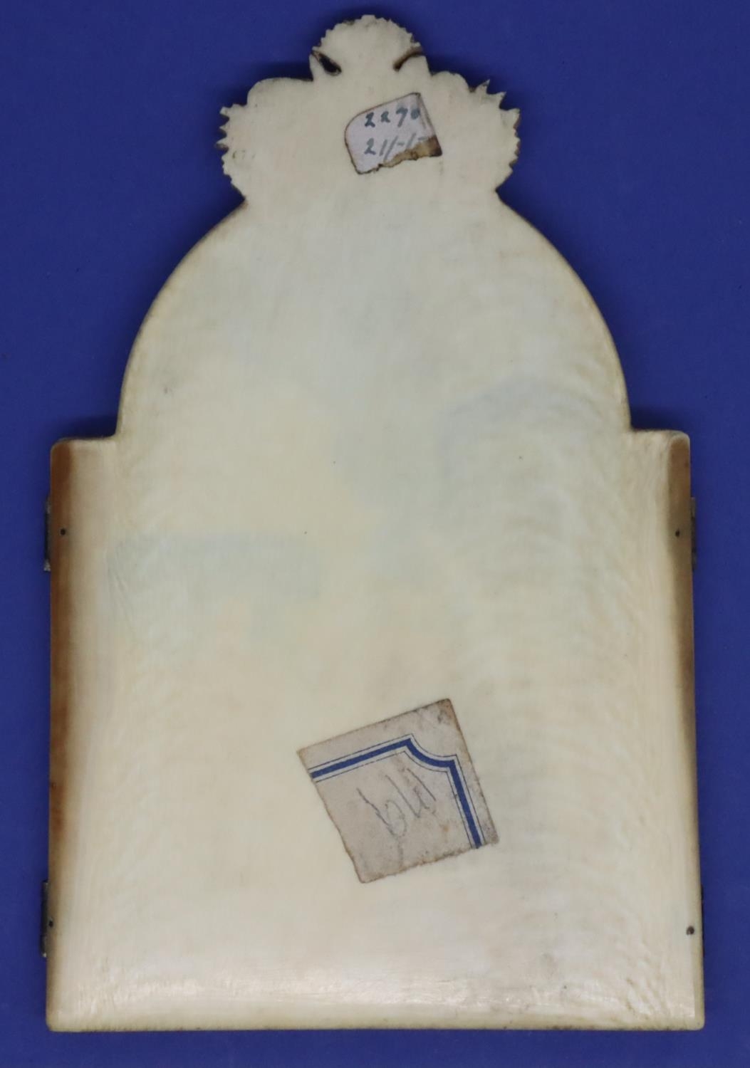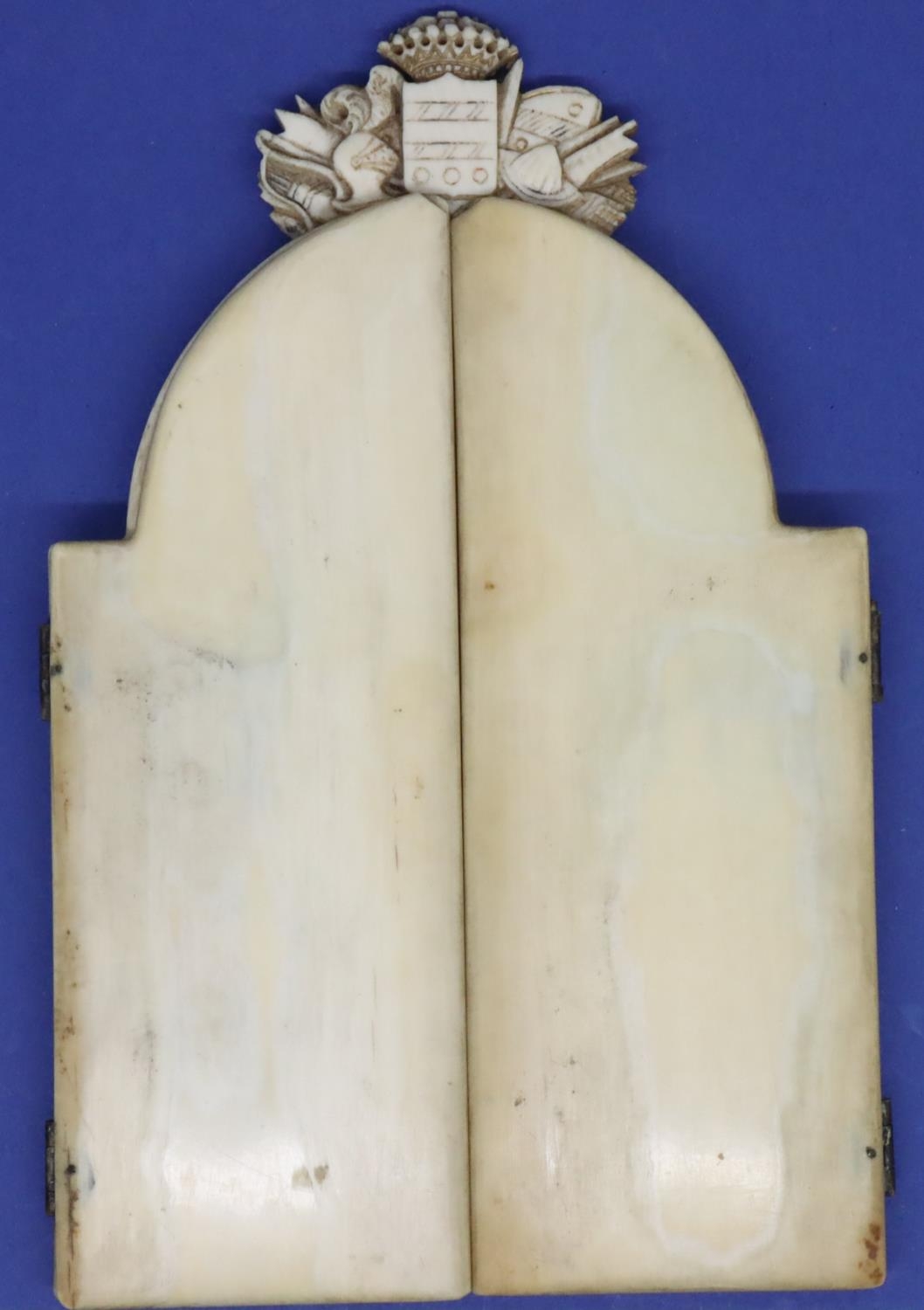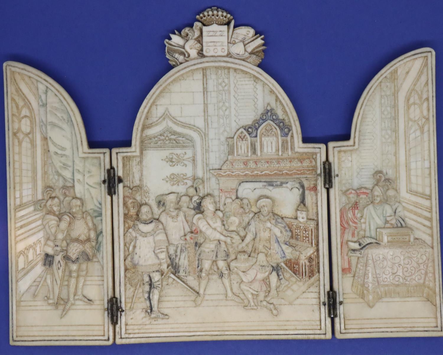 Dieppe ivory French triptych showing Royal court scenes with Royal crests above, H: 140 mm, 92g. Good overall condition with no visible damages or splits. P&P Group 1 (£14+VAT for the first lot and £1+VAT for subsequent lots)
