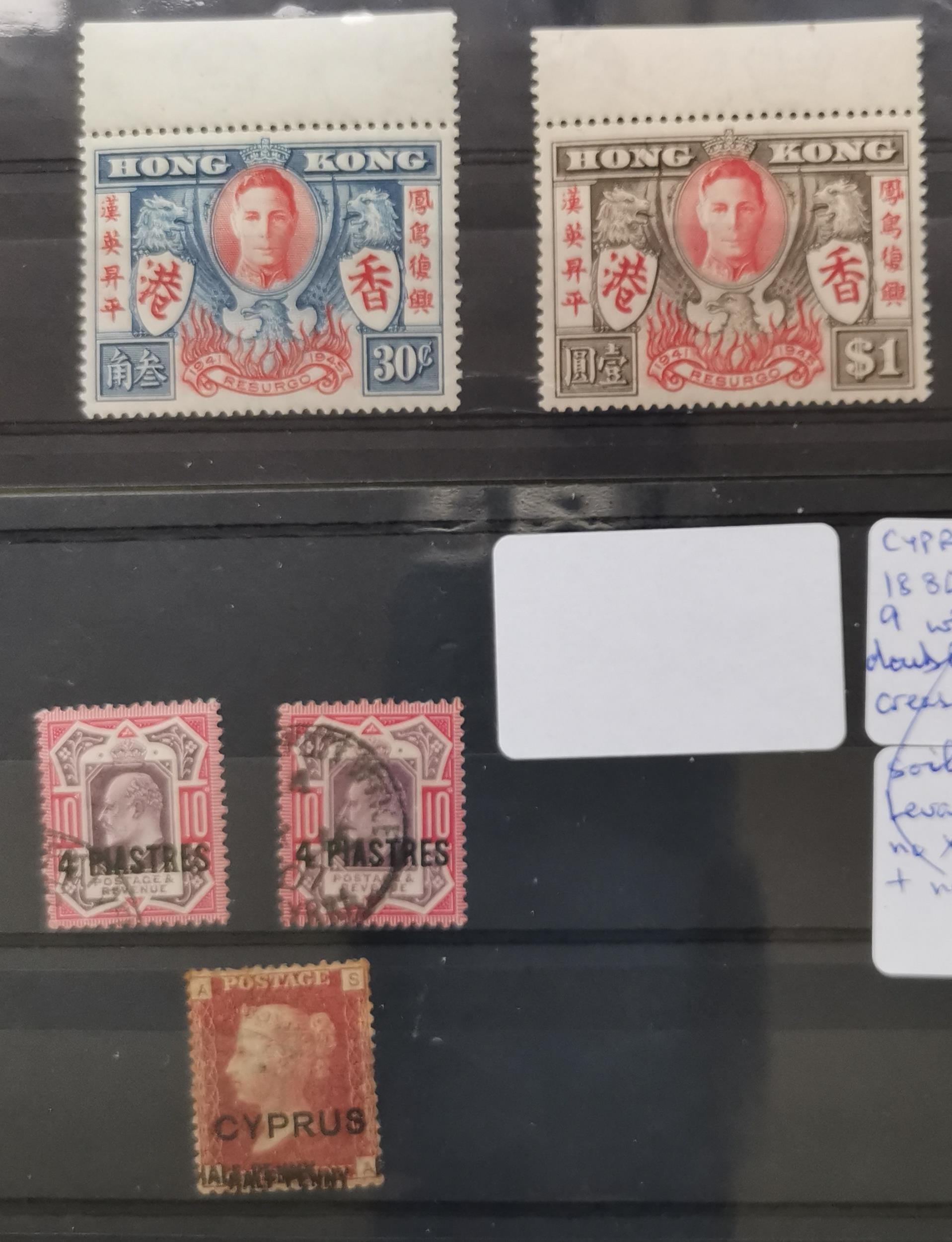 MIXED WORLD. BC items comprising British Levant 1902-5 4pi on 10d with no X on crown + normal FU Cyprus 1880 1d red SG9 with surcharge double o.g. (diagonal crease) and HK 1946 Victory 30c and $1 top marginal UM with extra stroke varieties. STC £790. (5)