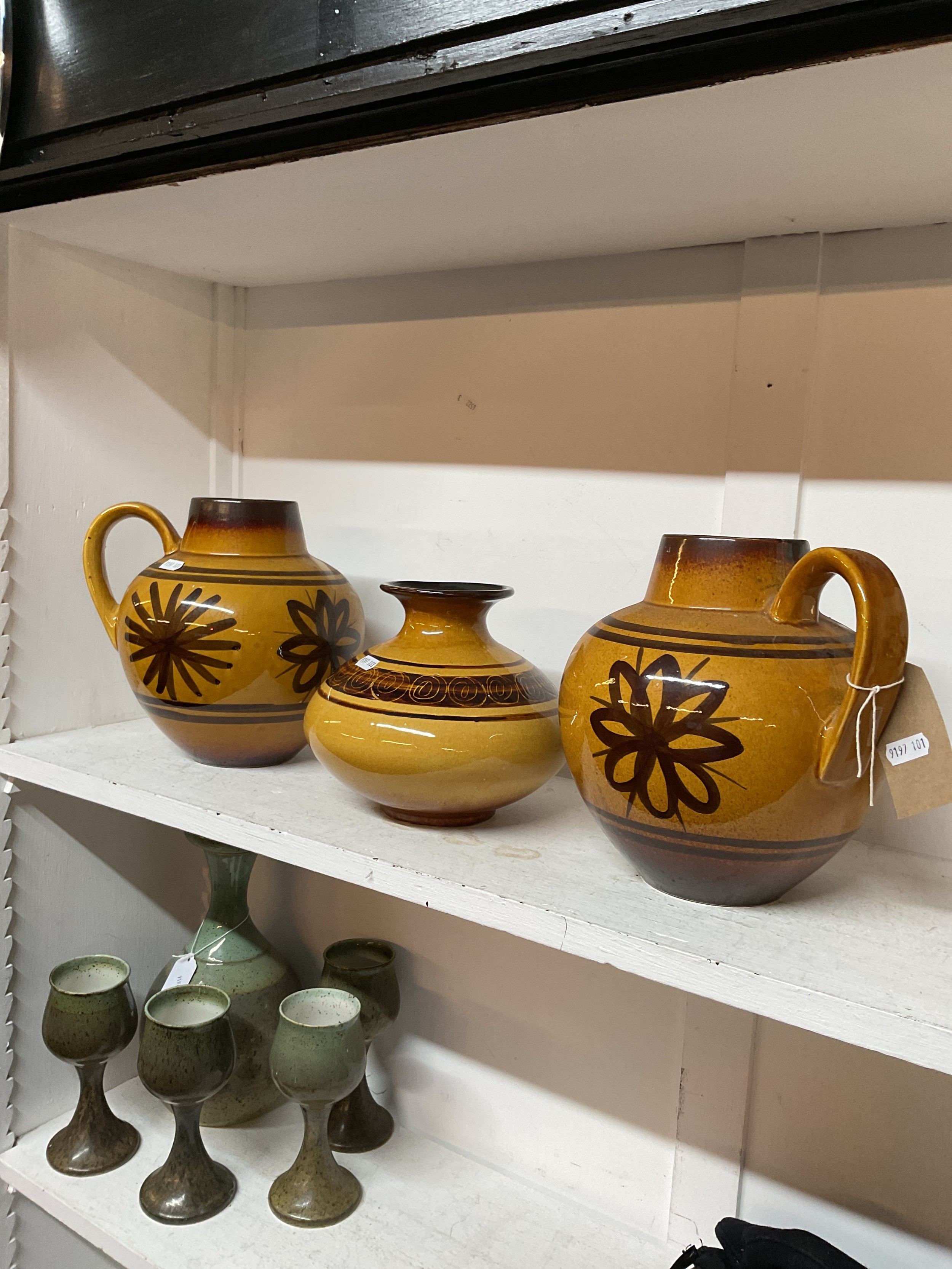 A pair of Cinque Ports Pottery jugs and vase