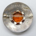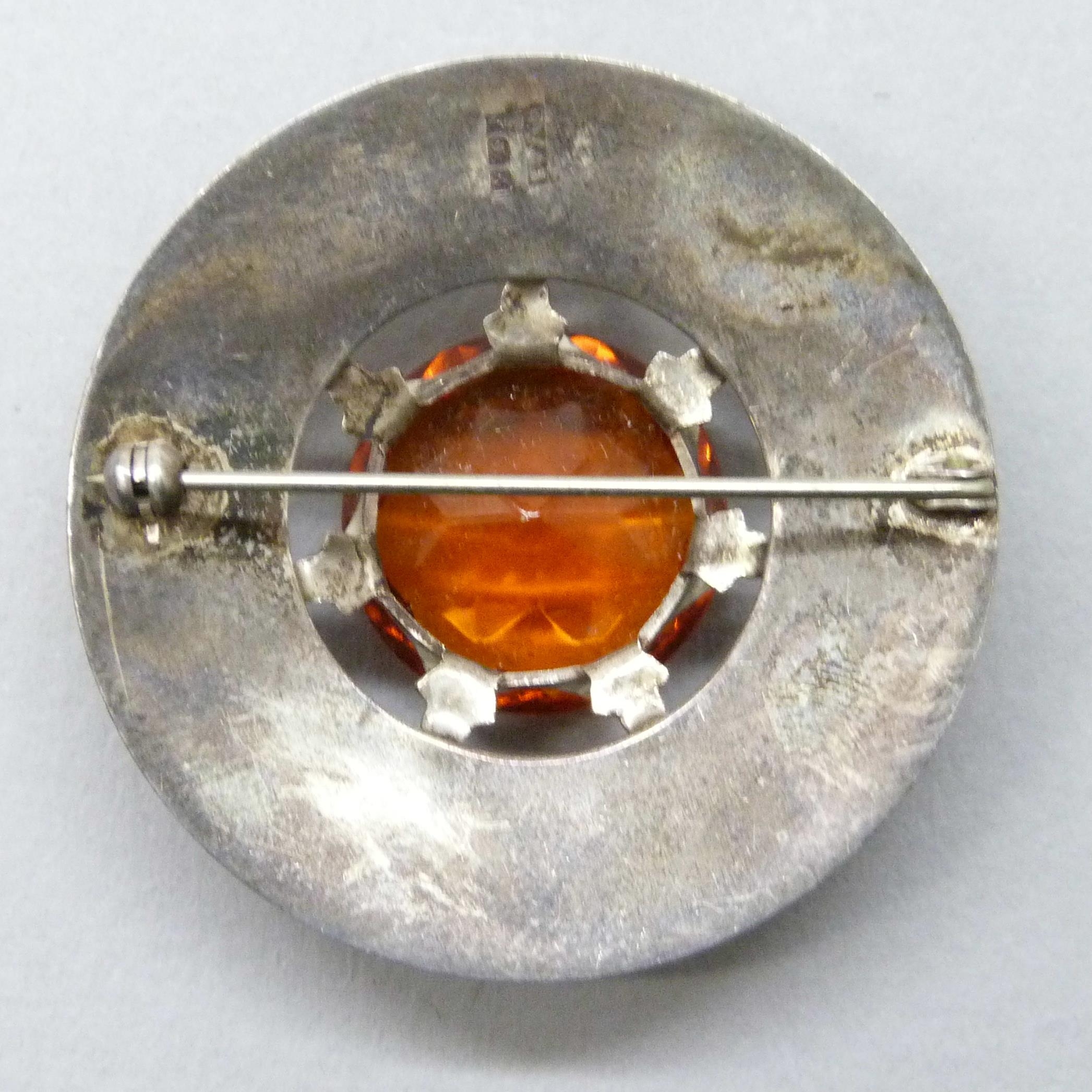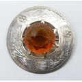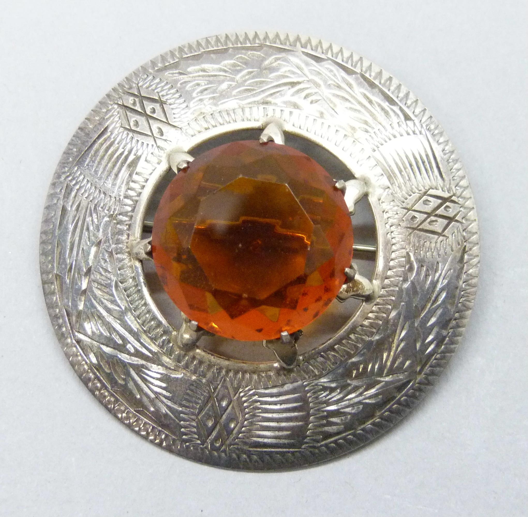 A 1970s Scottish style silver brooch set with an orange paste stone and engraved border, hallmarked W. Johnson & Son, Birmingham, 1975, 4.6cm