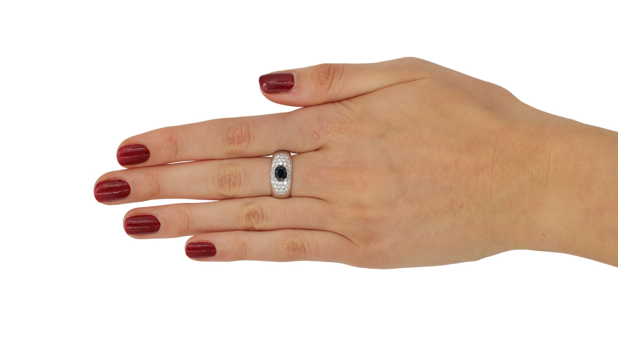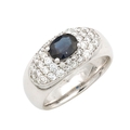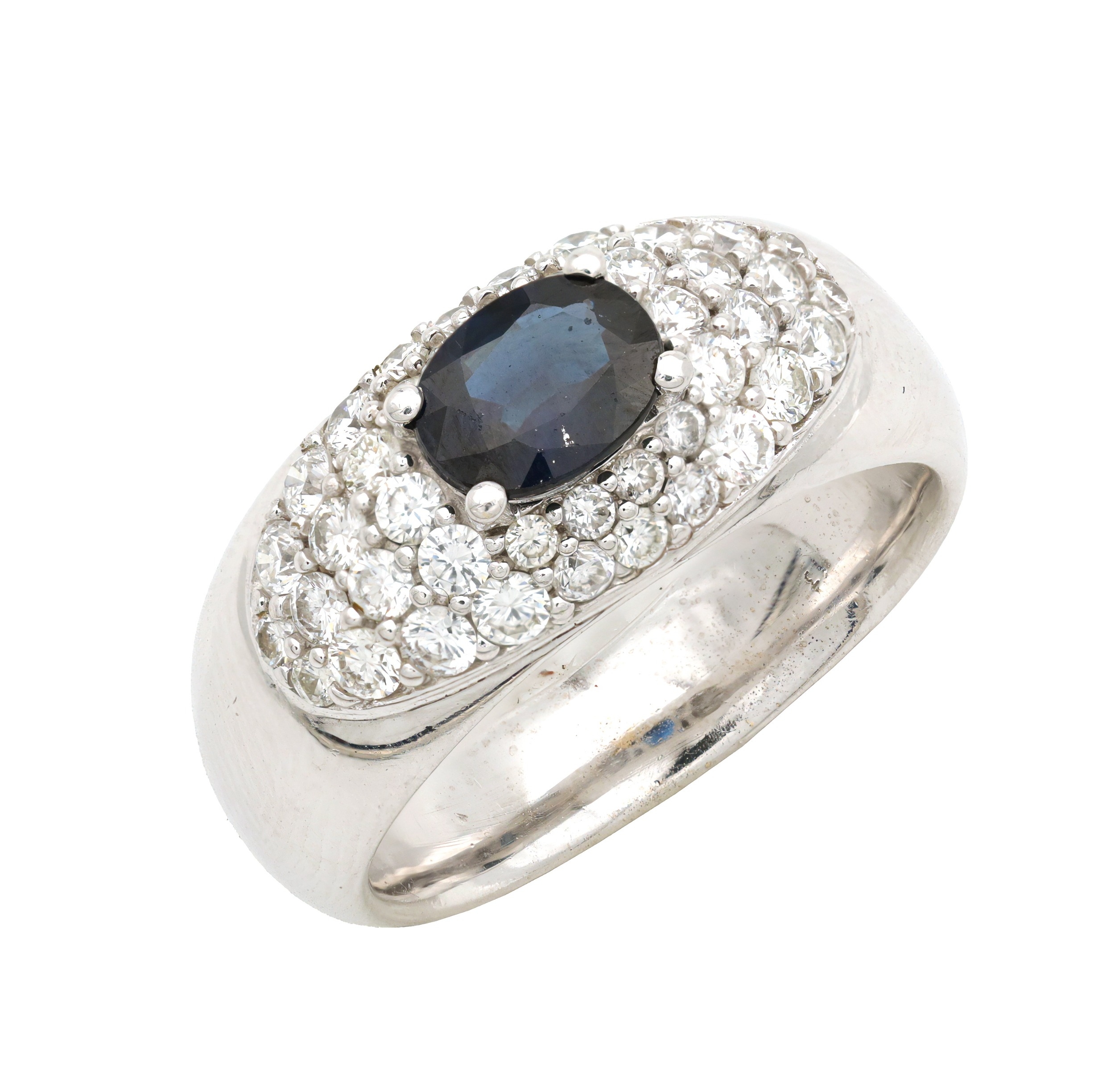 A HEAVY 18CT WHITE GOLD SAPPHIRE AND DIAMOND RING having a central oval cut sapphire surrounded by forty-two round cut diamonds, set in an 18ct white gold band. Total weight app.12.7g. Size Q.