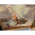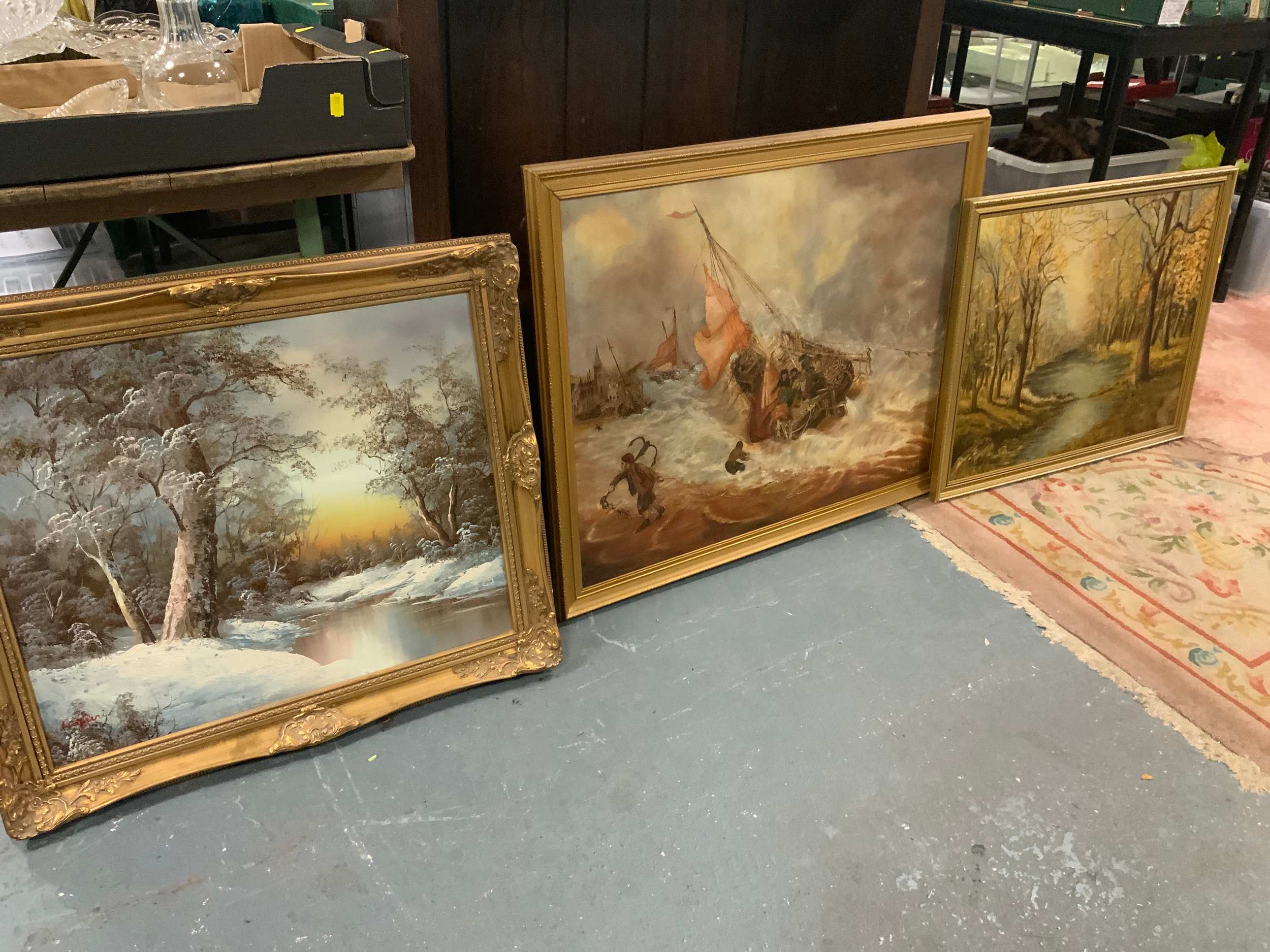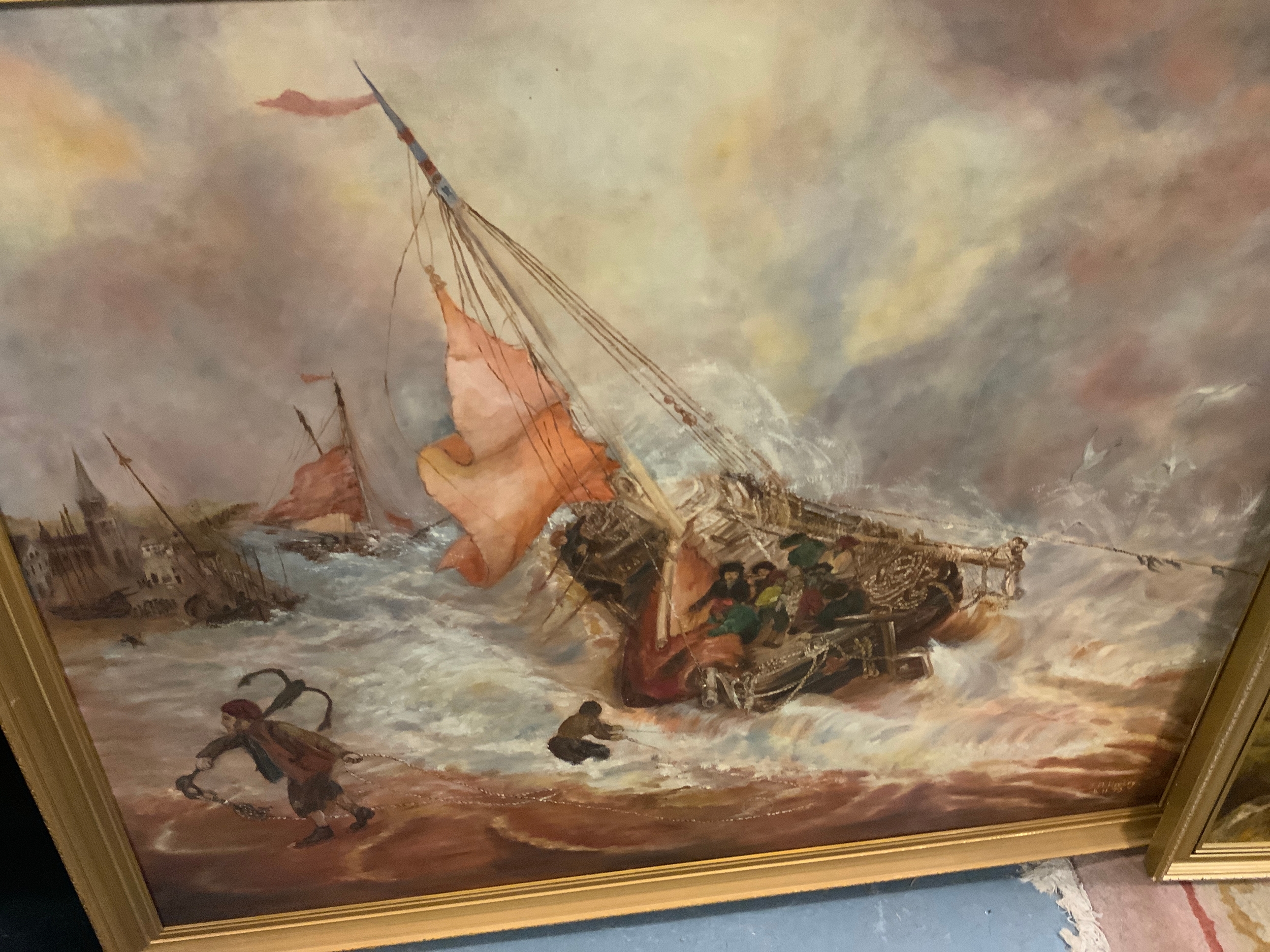 Three large oil paintings to include a seascape. (3)