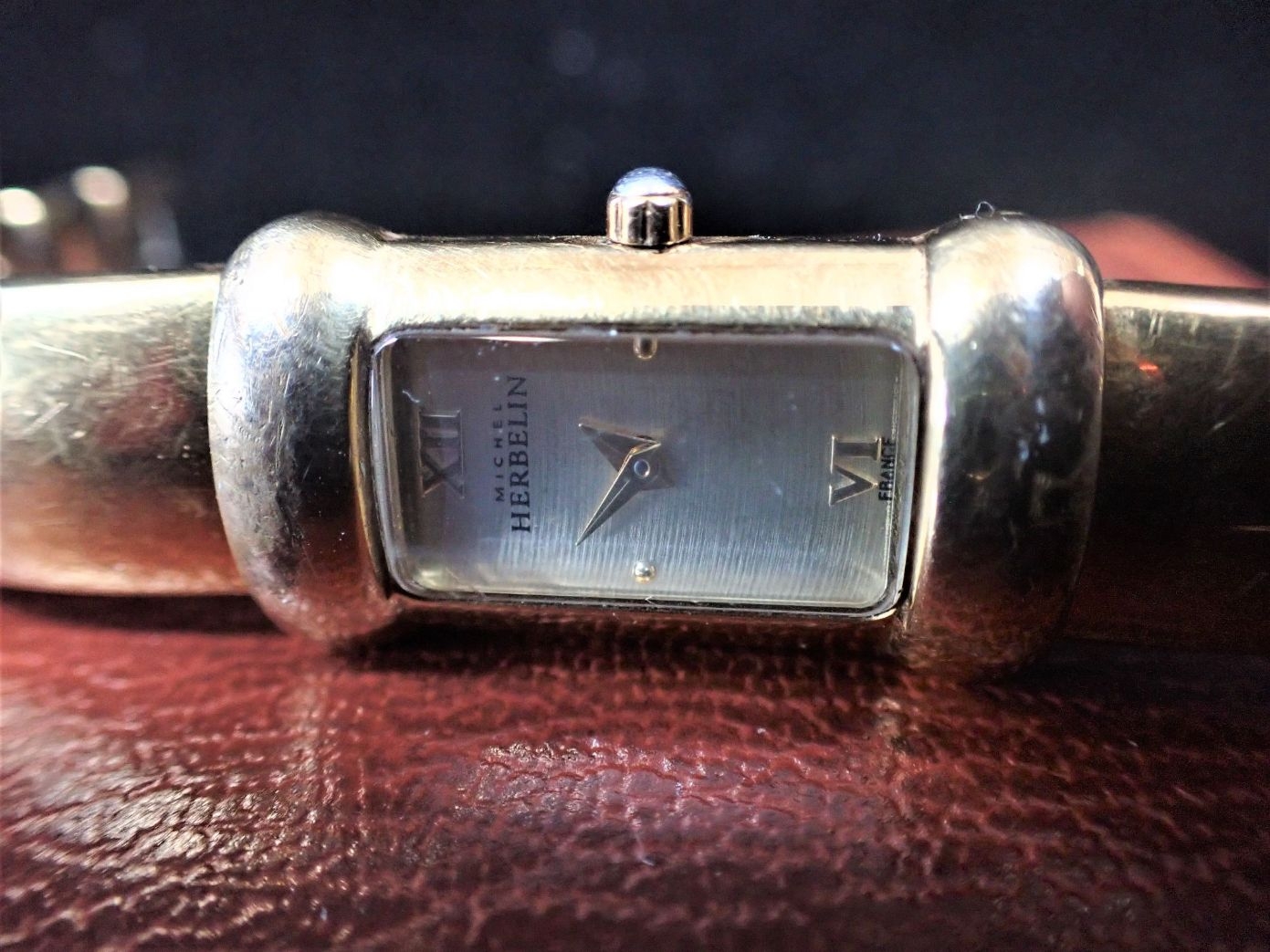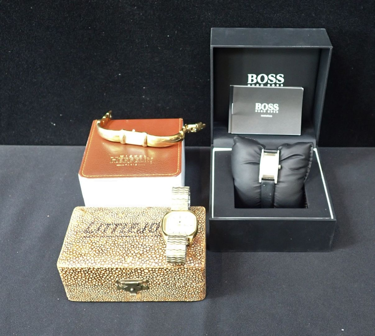 HUGO BOSS: A LADIES' STAINLESS STEEL WRISTWATCH with quartz movement, on a black leather strap, in the original Hugo Boss watch box and instructions; a Michel Herbelin, Paris lady's gold-plated bracelet watch with a quartz movement; and a Pulsar gentleman's gold-plated bracelet watch with quartz movement (3 and boxes)