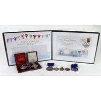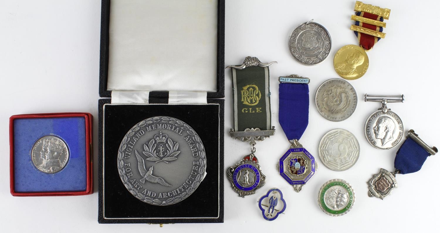 GB medals, badges etc. (12) mostly silver, 20thC, approx. 265g sterling. Note there are two forgeries / fantasies of Chinese Dollars in this lot.