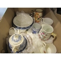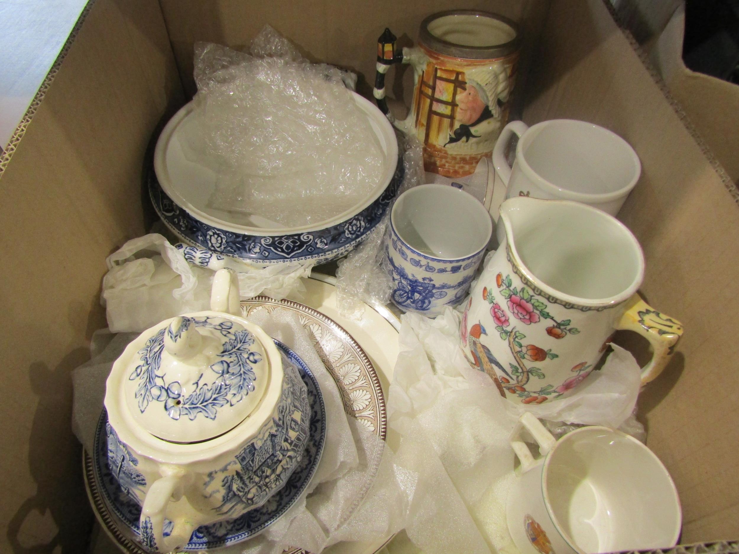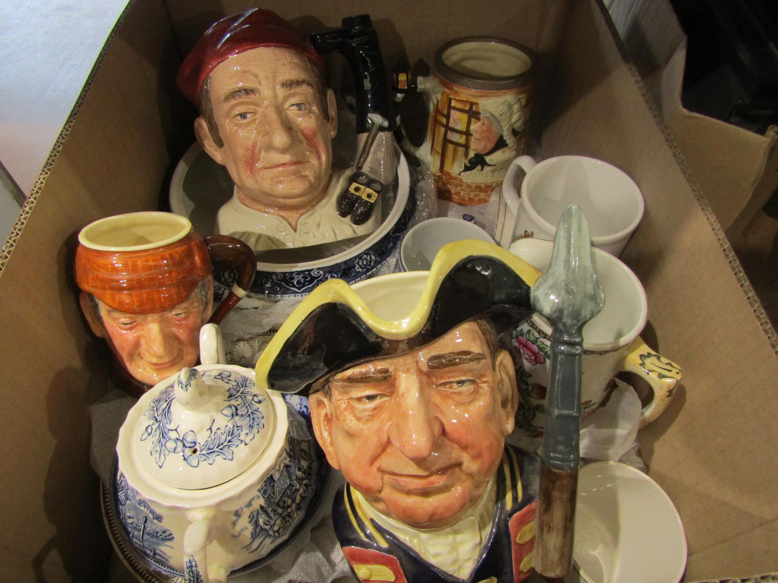 A box of ceramics including character jugs "Bootmaker" and "Guardsman", "Sairey Gamp" tankard, a blue and white tureen and Sherlock Holmes jug