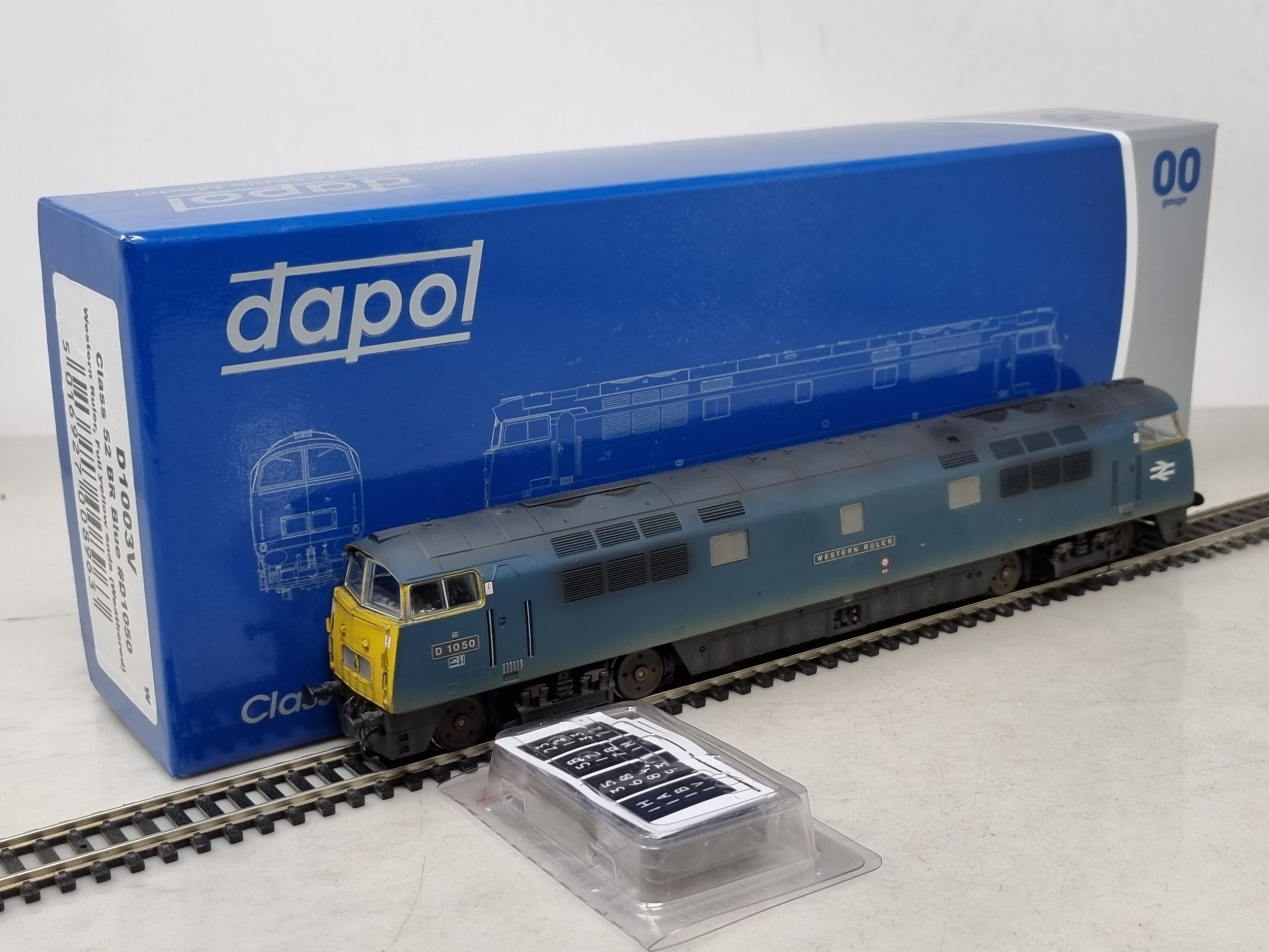 A boxed Dapol 00 gauge D1003V Class 52 diesel Locomotive 'Western Ruler' in factory weathered BR blue livery, Nr M, box Nr perfect