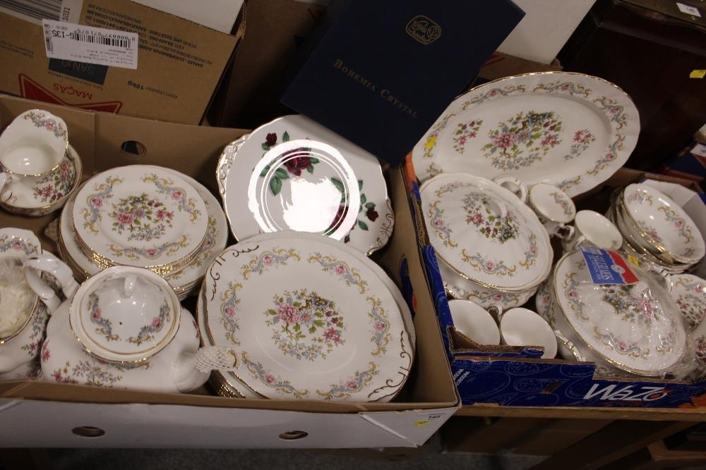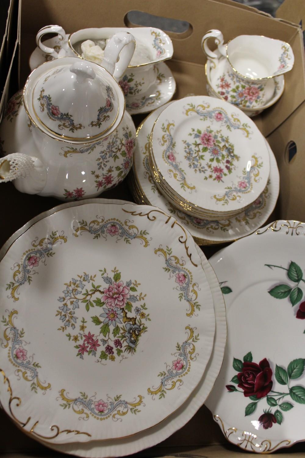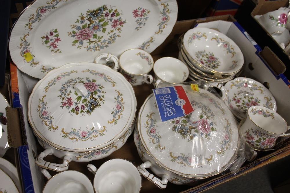 TWO TRAYS OF ROYAL STANDARD MANDARIN PATTERN CHINA TO INCLUDE A TEAPOT, DINING PLATES, TUREENS, CUPS AND SAUCERS ETC.
