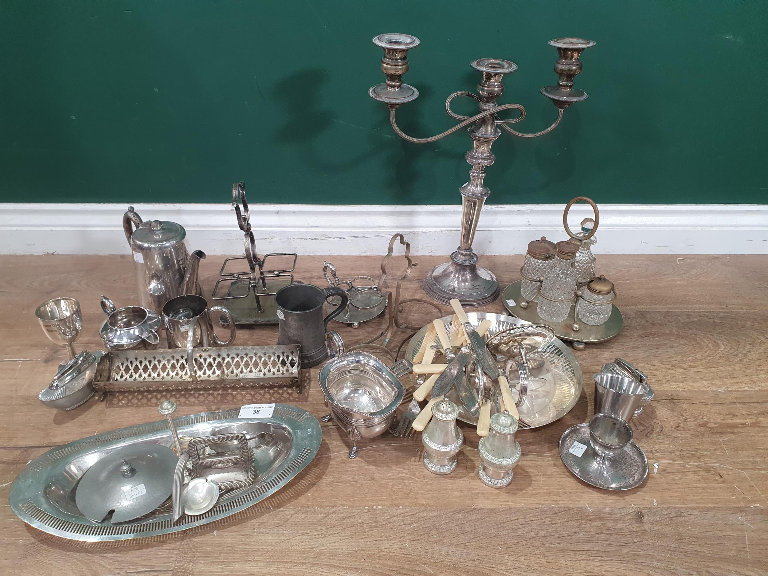 A quantity of plated items including a Candelabra, Cruet Set, Cruet Stands, Condiments, Fish Knives and Forks, Table Lights, etc, (R5)