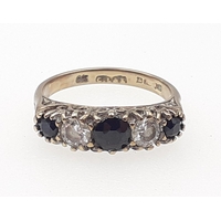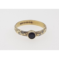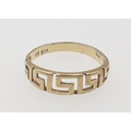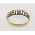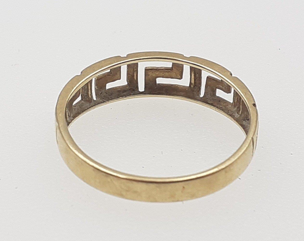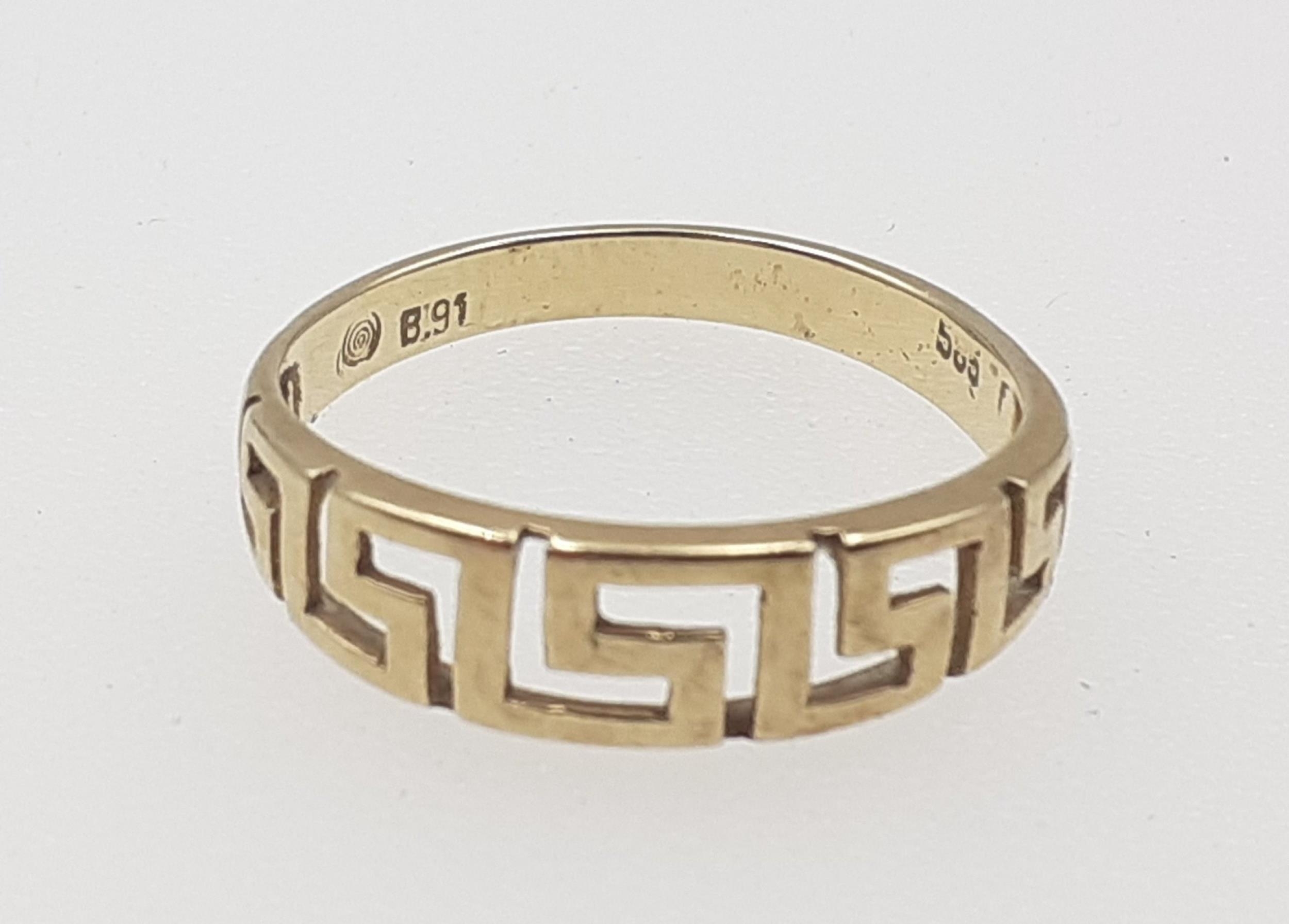 A 585 stamped ring with key design shaft. Size O, weight 1.9g approx.