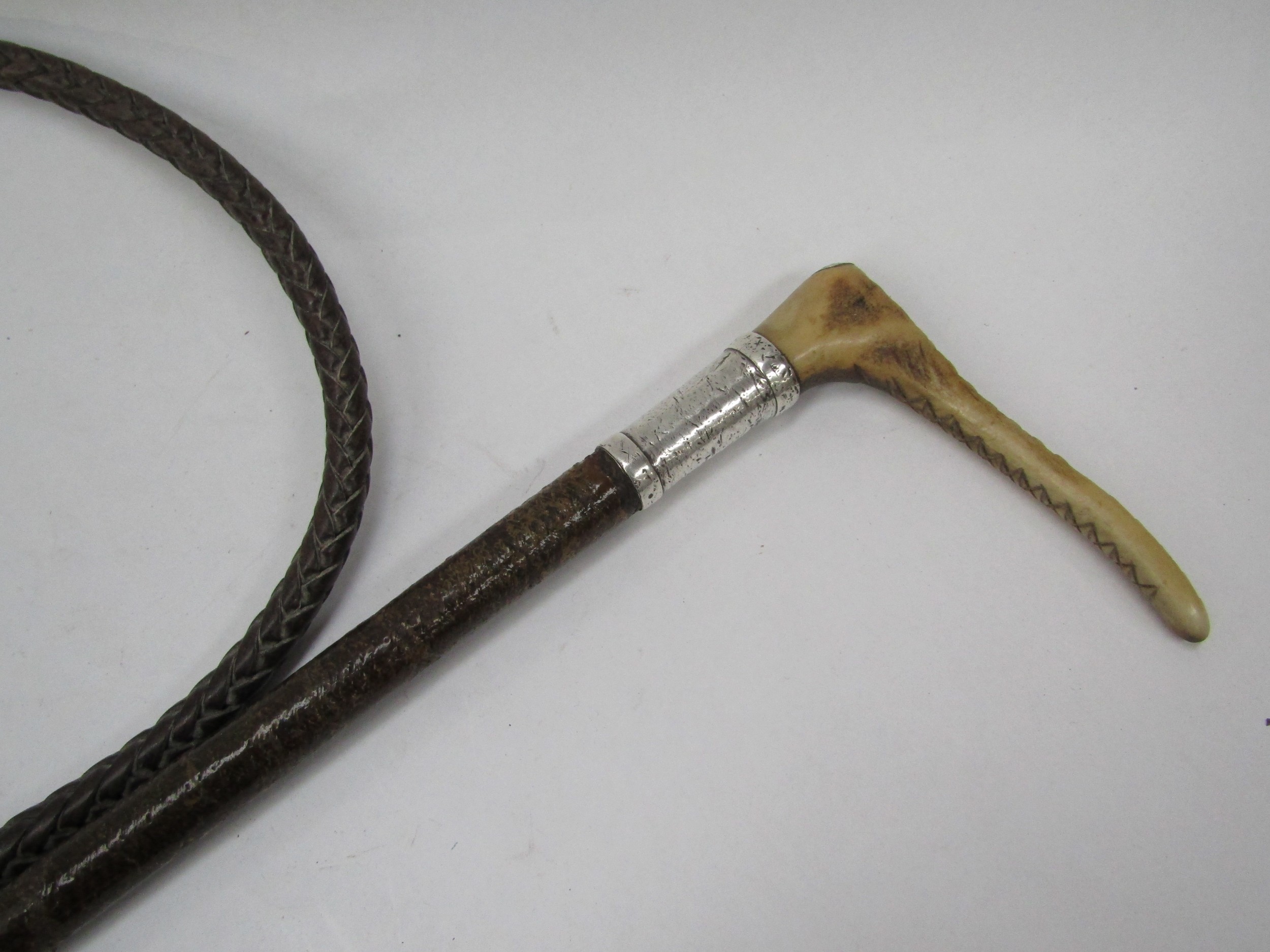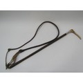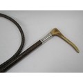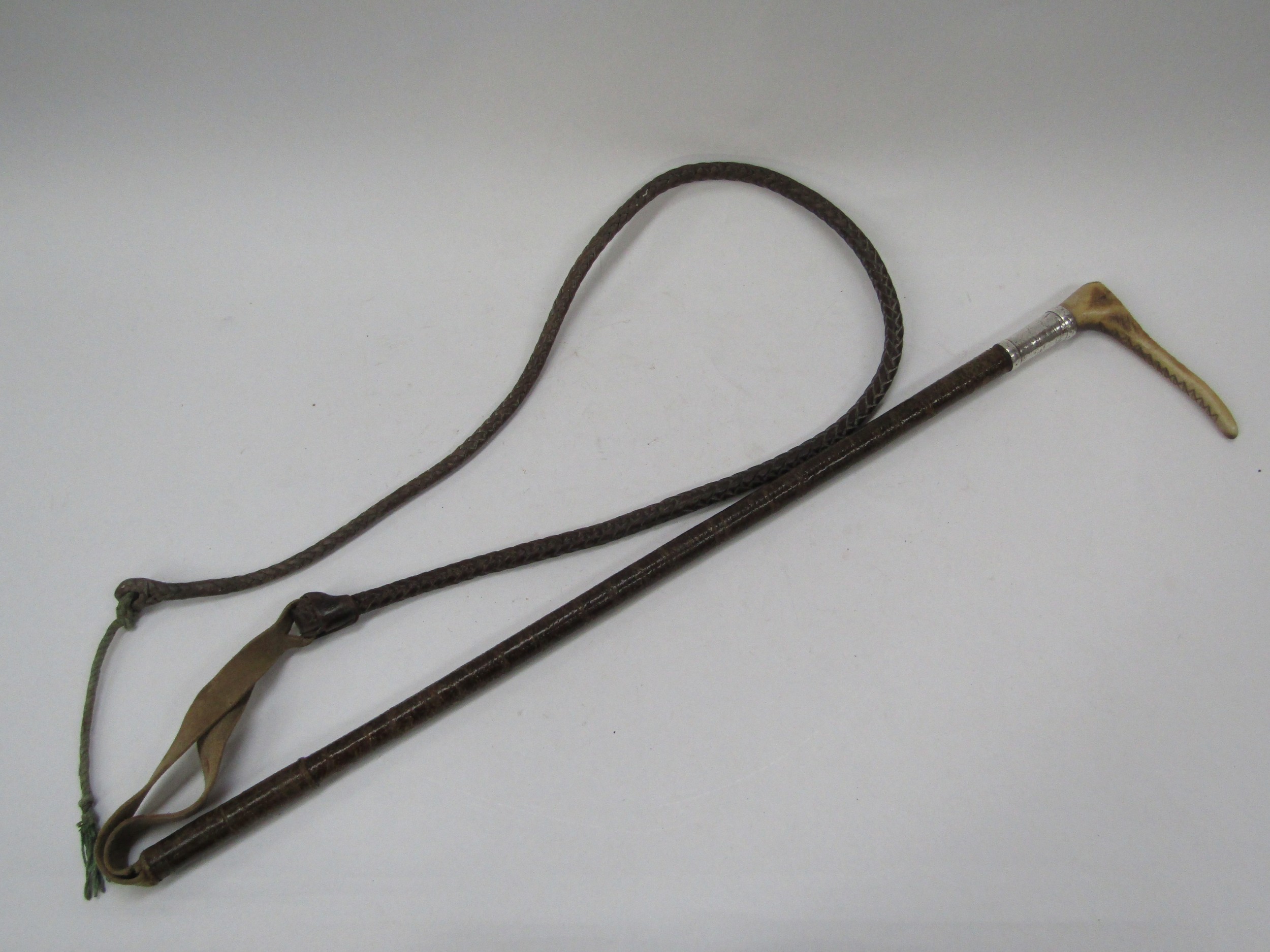 A vintage carriage whip, leather shaft with silver collar and horn top, knotted leather thong