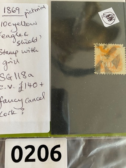 US 1869 10c yellow 'Eagle & Shield' grill stamp SG 118a and fancy cork cancel cat value £140, fancy cancel