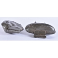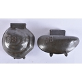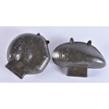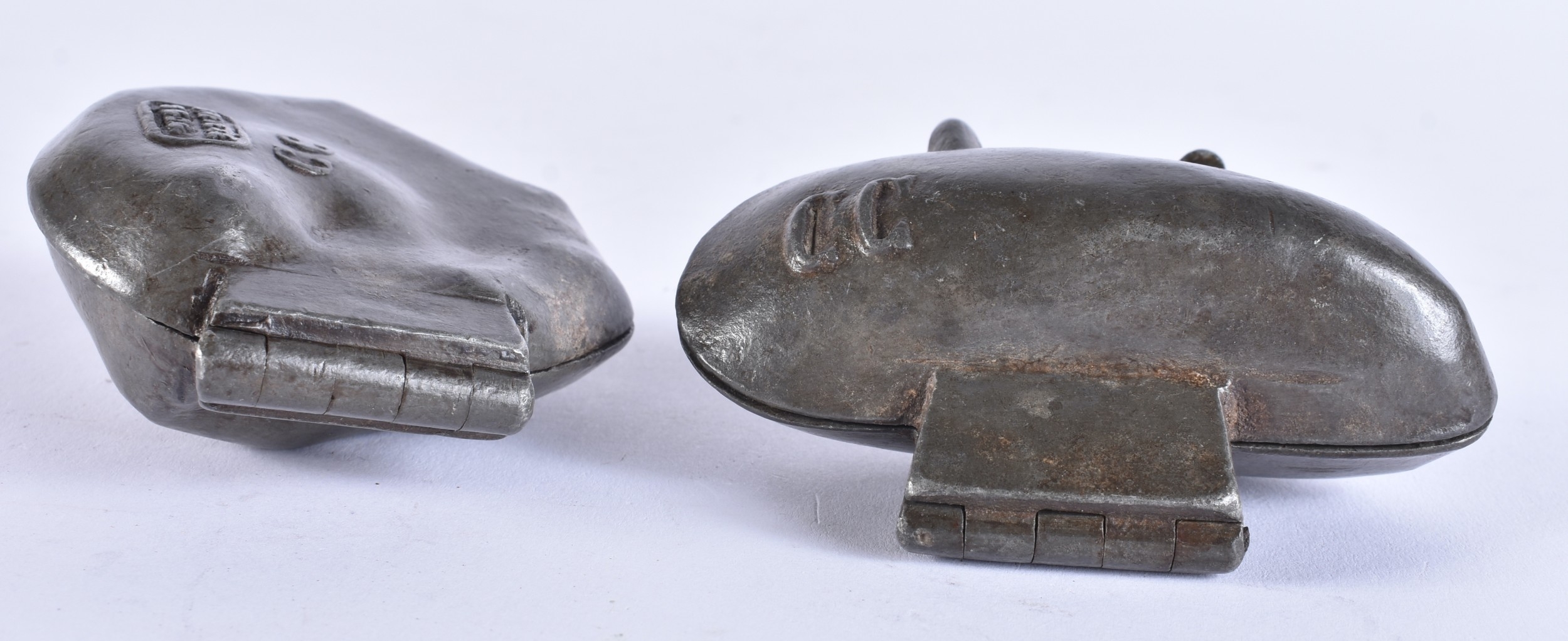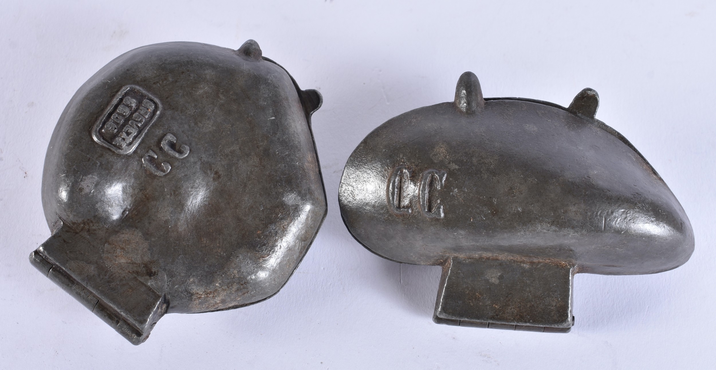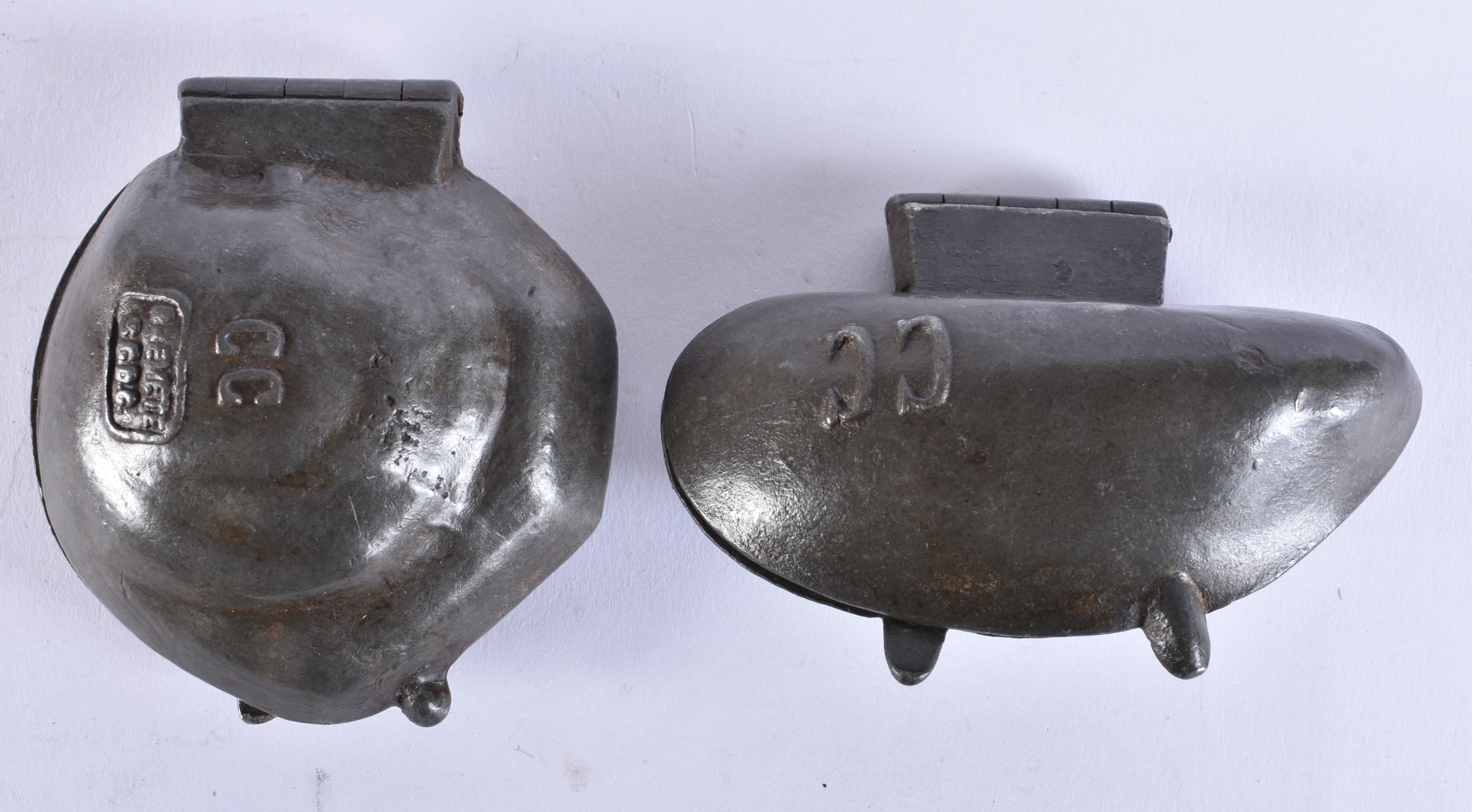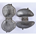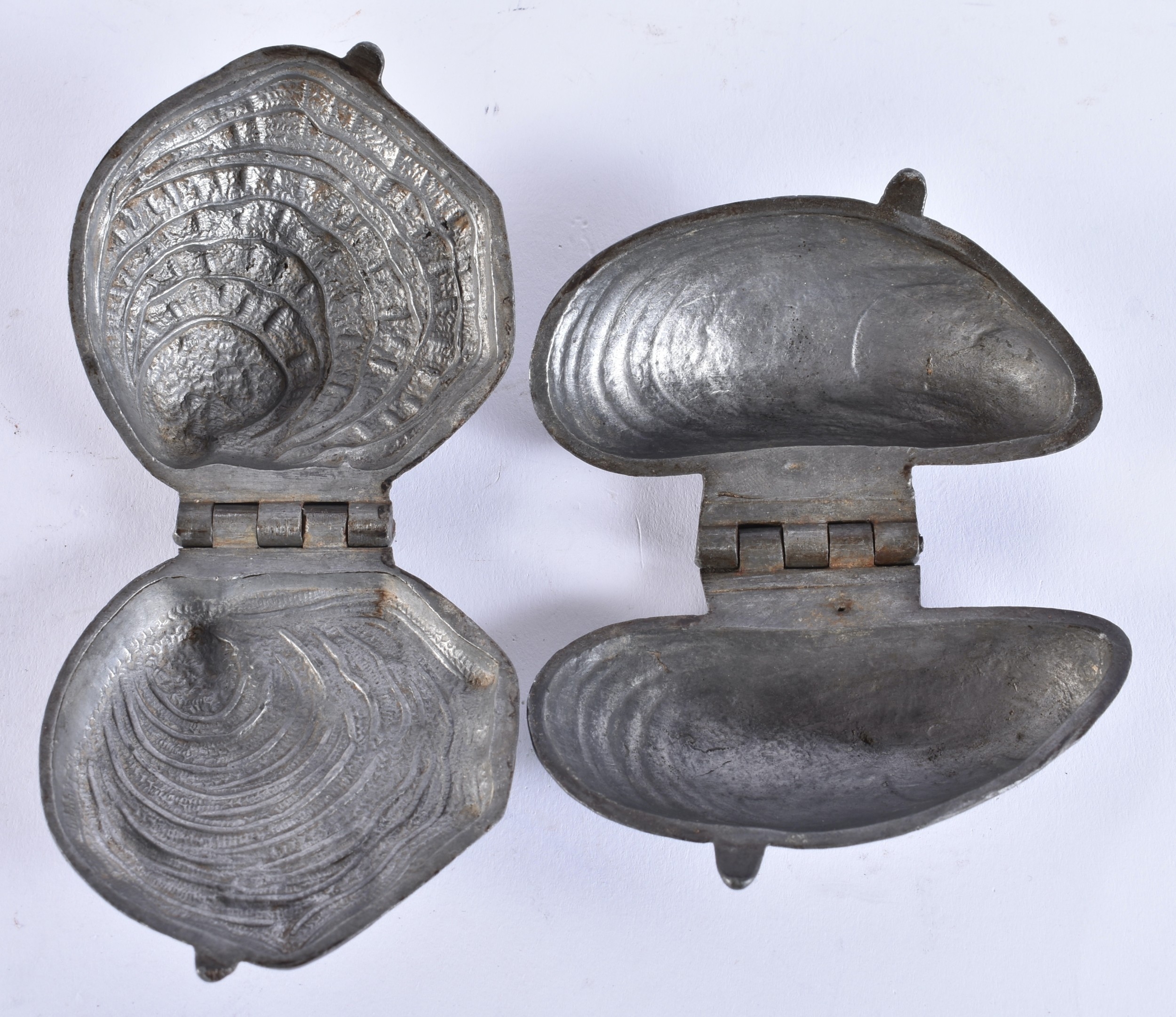 TWO ANTIQUE FRENCH PEWTER CLAM SHELL ICE MOULDS. Largest 9 cm x 5.5 cm. (2)