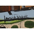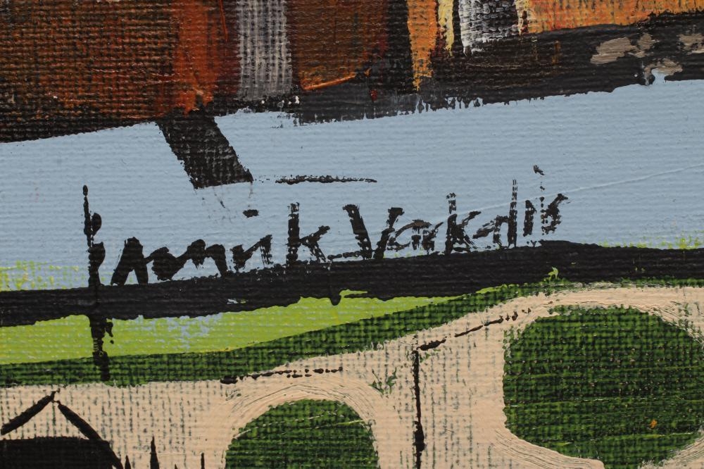 AMRIK VARKALIS (b.1940) Terraced Houses, signed lower left, oil on canvas, 8" x 19 1/2", unframed (subject to Artists Resale Right) (Est. plus 24% premium inc. VAT)