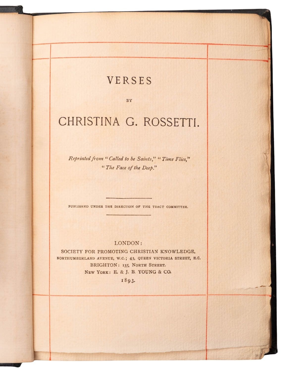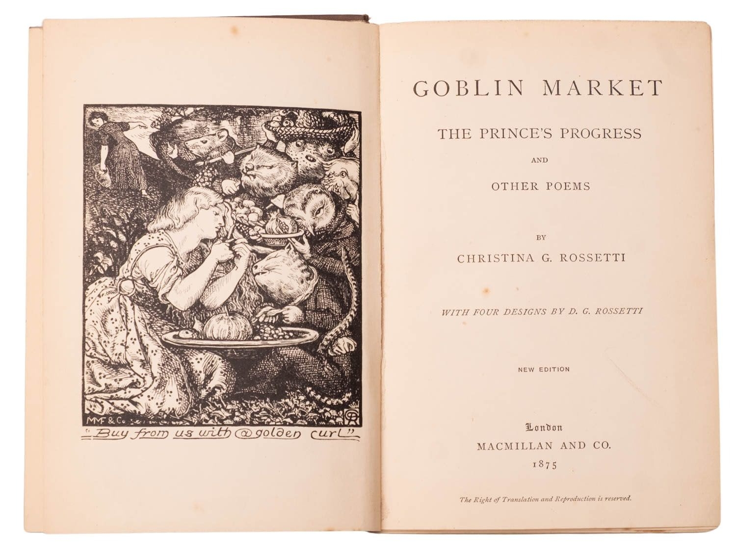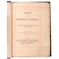 ROSSETTI, Christina. Goblin Market and other poems, new edition, London: Macmillan and Co., 1875, wood-engr. frontis. after Dante Gabriel Rossetti, occasional spotting, orig. decorative brown cloth gilt, rubbed, 12mo; IDEM. Verses, London: Society for Promoting Christian Knowledge, 1893, contemp. ink ownership inscription to ffep, browning to endpapers, orig. navy cloth gilt, 8vo. (2)
